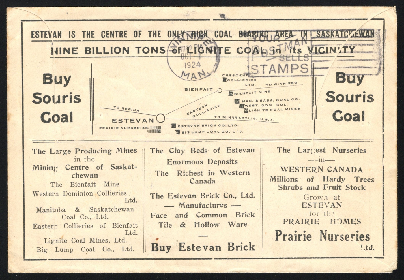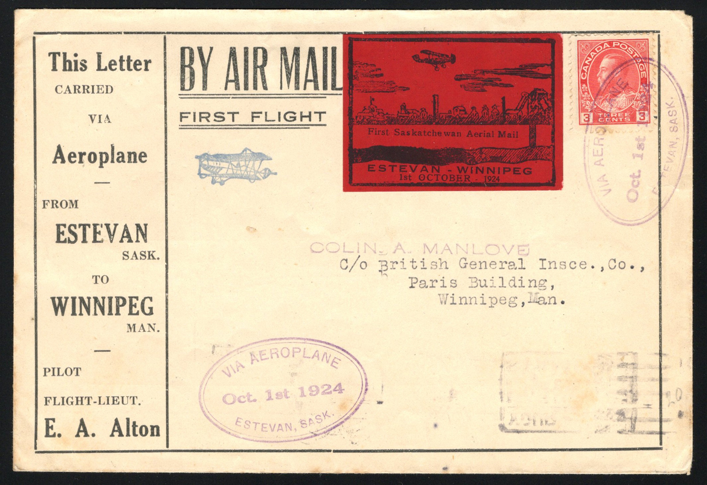 1076 CVR CLP5 imageOct 1, 1924 Estevan to Winnipeg Pioneer Flight Cover, with CLP5 (with space between SASKATCHE and WAN), with free strike of the "By Aeroplane / Estevan, Sask / Oct 1st, 1924" oval cancel in purple, plus another strike tying a 3c carmine Admiral stamp, with Winnipeg same day receiver on back, alongside all-over business advertising, very fine. (Scan 1) (Scan 2) (All Scans)