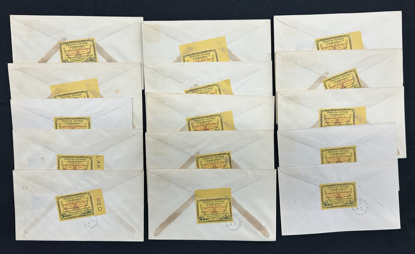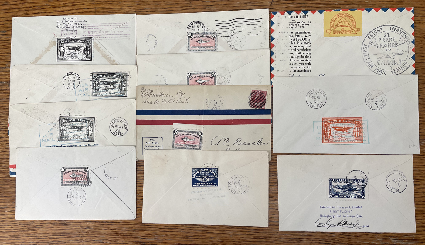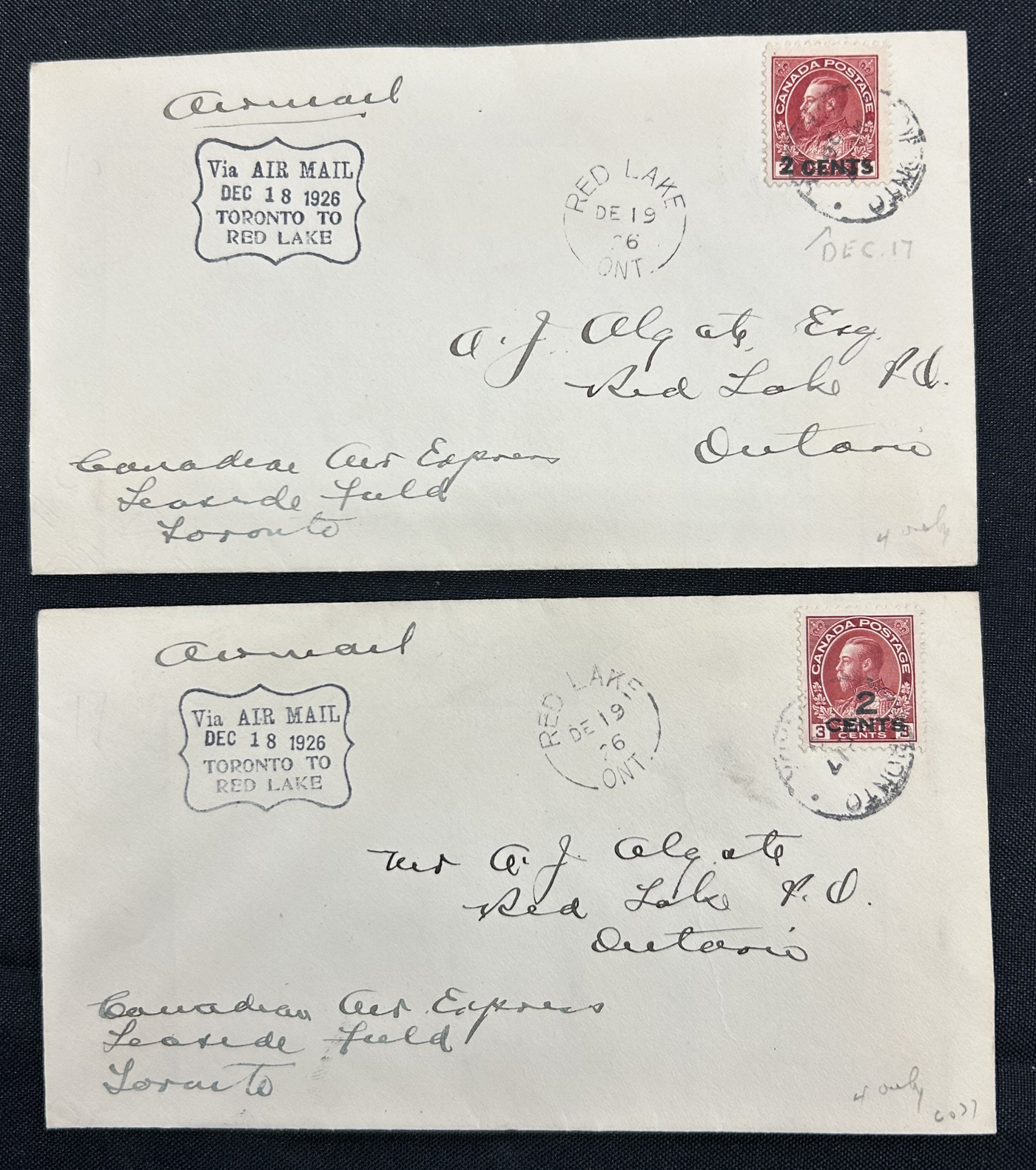 1068 CVR CL13 imageGroup of 10 First Flight Covers Franked with CL13, all flown from Toronto to Red Lake on DEC.18.1926 and all bearing the special 4-line flight cachet (Longworth-Dames reports only 78 covers have this cachet). The backs all have a CL13 tied by a Red Lake DEC.19 broken circle and we note a variety of frankings on front, including the two different Admiral Provisional surcharges (one line and 2 line). The covers are all addressed to the CL13's designer Arthur Algate. Very fine. (Scan 1) (Scan 2) (Scan 3) (All Scans)