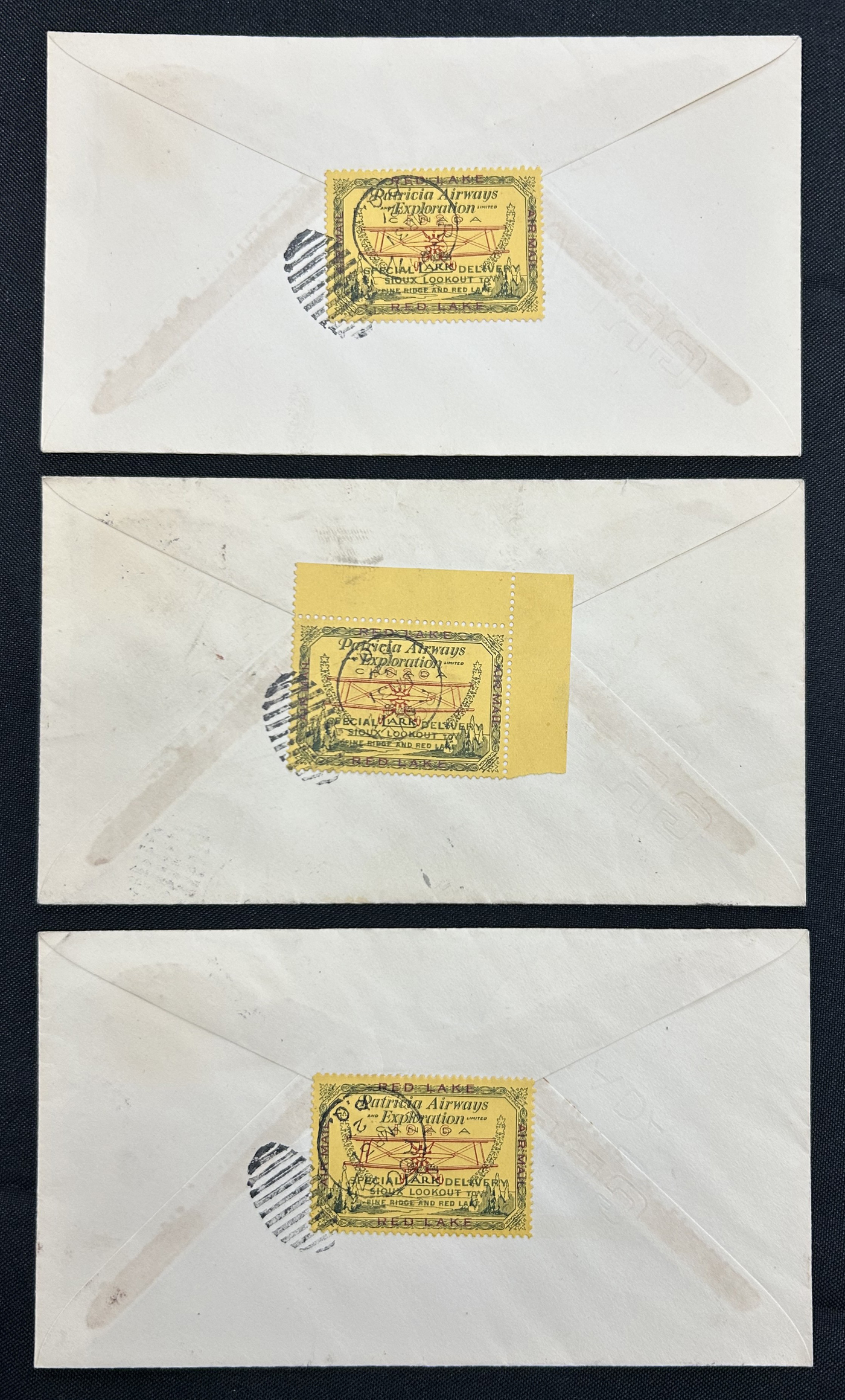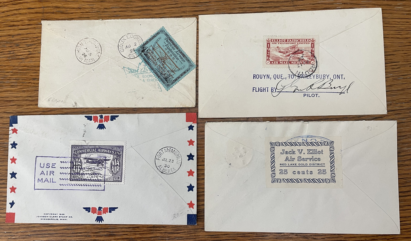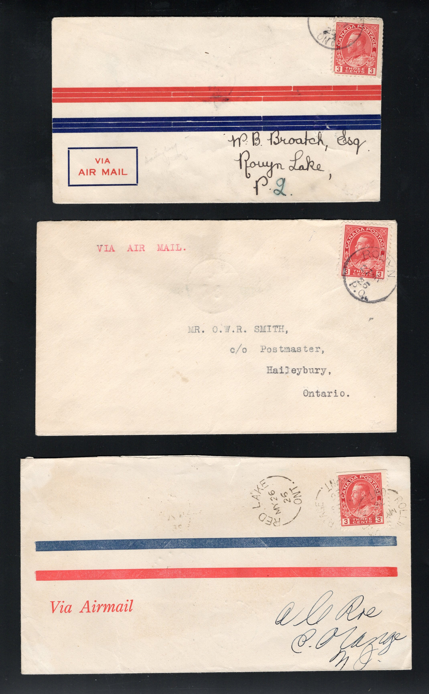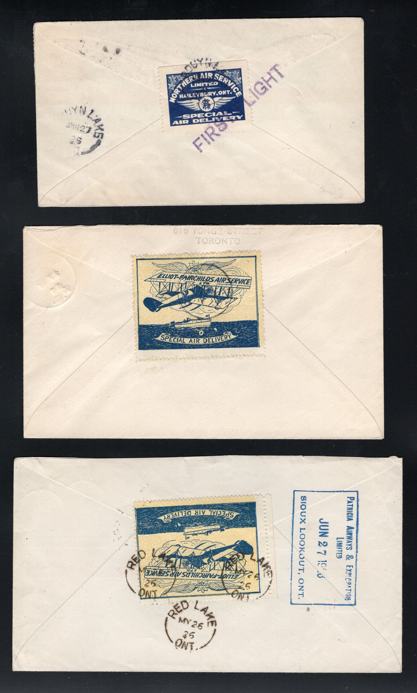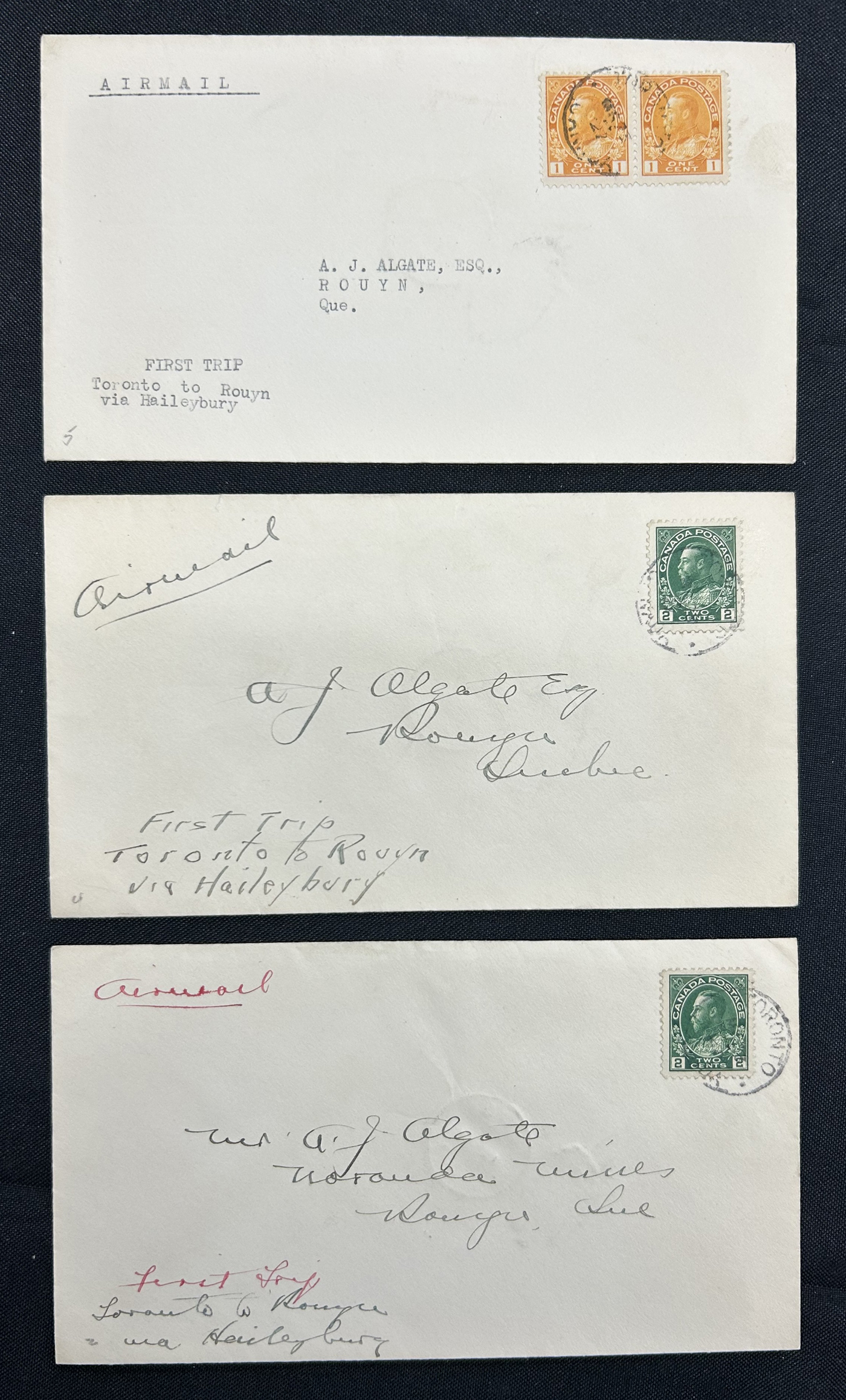 1066 CVR CL5b, CL9, CL9c imageGroup of Three 1925-1926 Semi-Official Airmail Covers, first is a CL5b (with blue dot variety) on JUN.27.1925 first flight Haileybury to Rouyn Lake, second has a CL9 on MAY.27.1926 first flight Rouyn to Haileybury and third is CL9c (filled-in wing variety) on JUN.27.1926 first flight cover with Patricia Airways & Exploration cachet. Overall very fine. (Scan 1) (Scan 2) (All Scans)