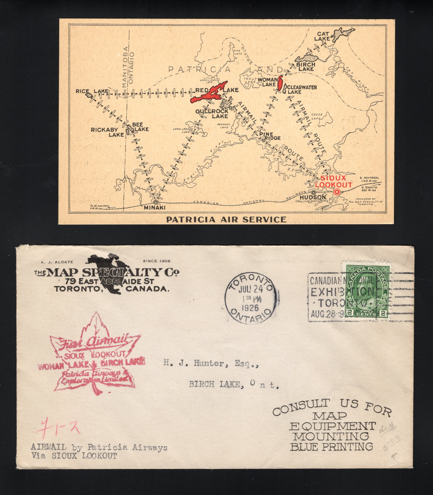 1073 CVR CL18 image1926 First Flight Cover Franked with CL18, with Special Insert, a cover from the Map Specialty Co. left Toronto JUL.24.1926, with Sioux Lookout JUL.26 cds on back, and Birch Lake AUG.2 cds ties a CL18 with part of its selvedge. The front and back also show a Maple Leaf flight cachet in red (not as often seen as the blue-green one), very fine, and still has its Patricia Air Service insert with map on one side and instructions on the other. (Scan 1) (Scan 2) (All Scans)