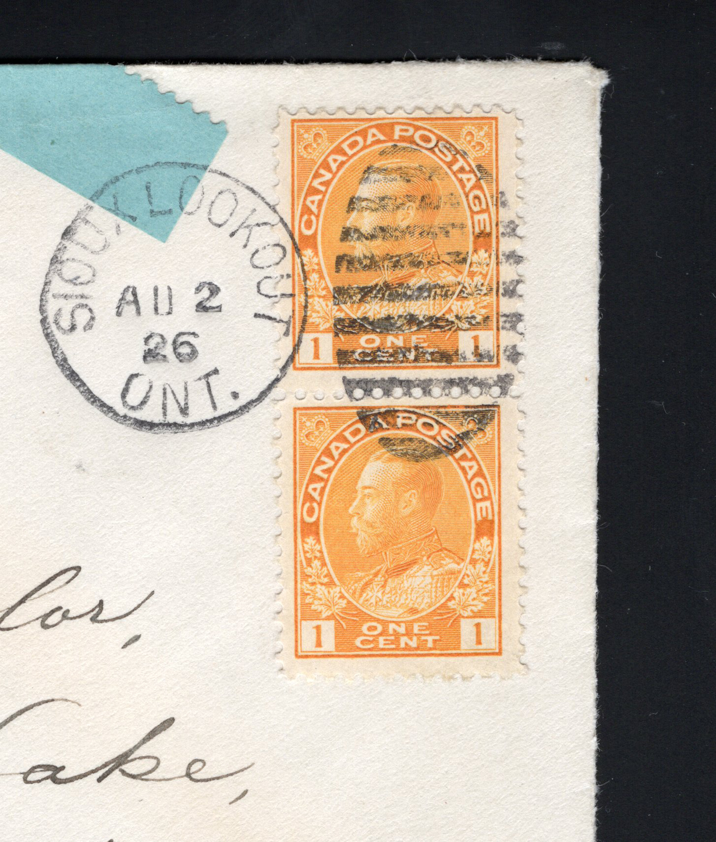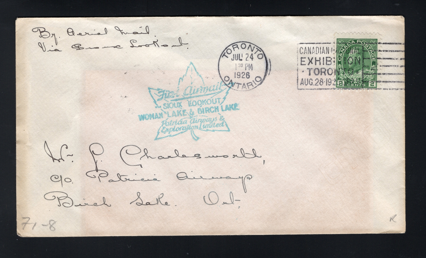 1074 CVR CL18 image1926 First Flight Cover Franked with CL18, left Toronto JUL.24.1926, with Sioux Lookout JUL.26 cds on back, and Birch Lake AUG.2 cds ties a CL18 with part of its selvedge. The front and back also show a Maple Leaf flight cachet in blue-green. Bit of toning caused by the insert, still very fine. (Scan 1) (Scan 2) (All Scans)