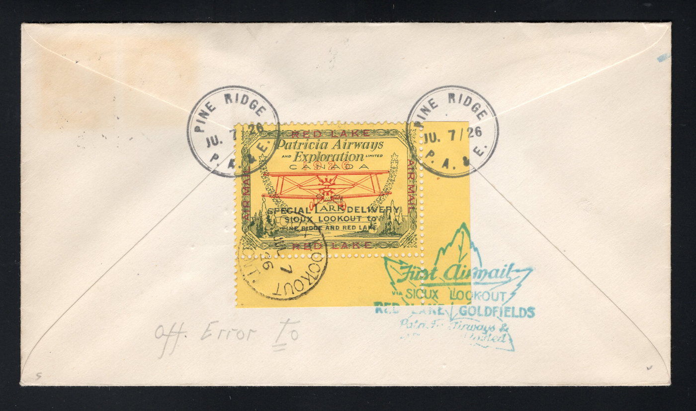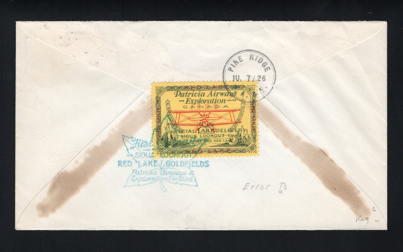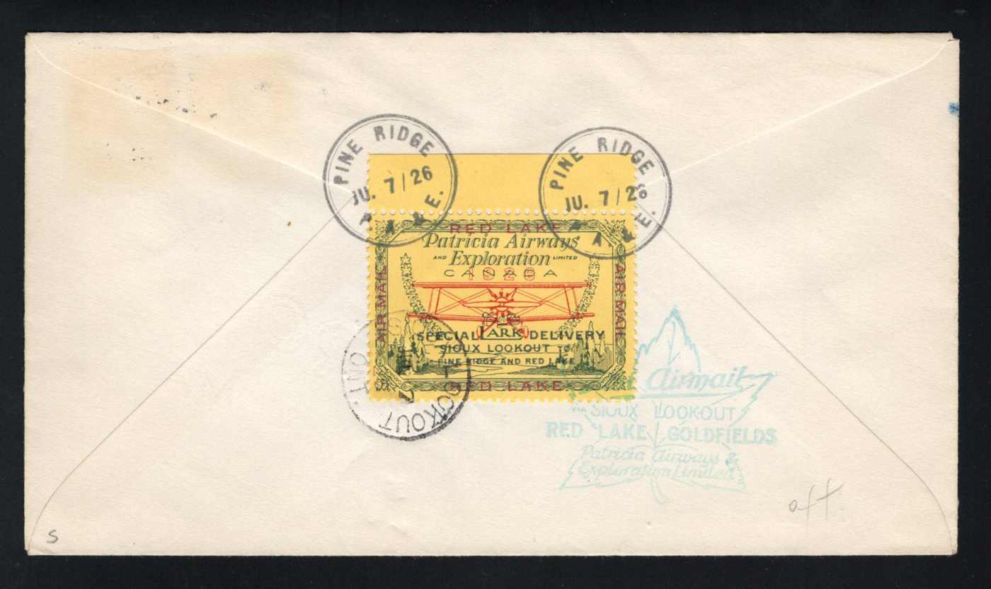 1070 CVR CL13b image1926 First Flight Cover Franked with a CL13 with "Small t in TO" Variety, the very fine stamp is tied on back of the cover by a green Maple Leaf cachet and JUL.7.1926 Pine Ridge datestamp. Front has a 2c Map stamp tied by a Sioux Lookout cds of same date, alongside a free strike of the green cachet. A very fine and scarce stamp on cover. (Scan 1) (Scan 2) (Scan 3) (All Scans)