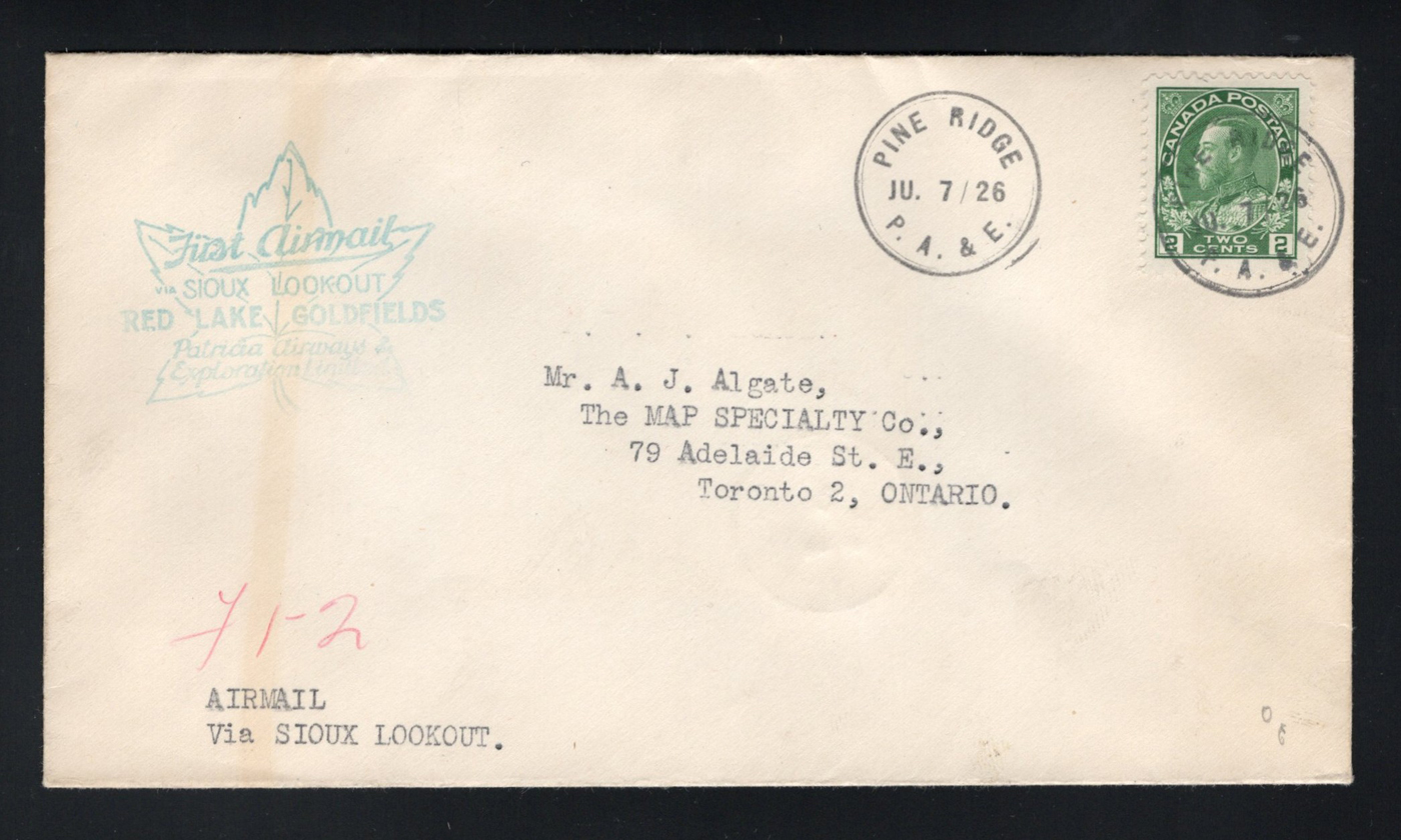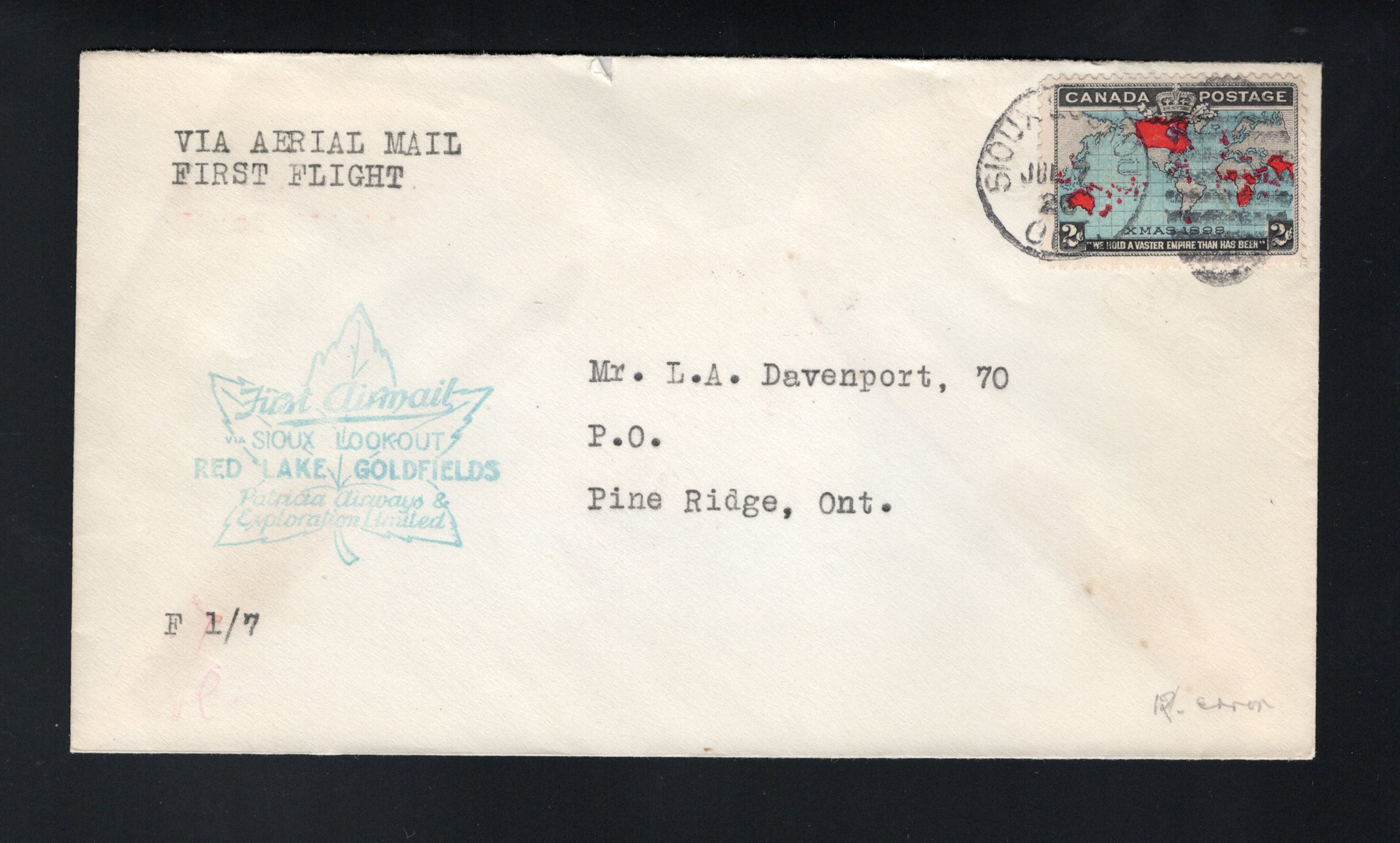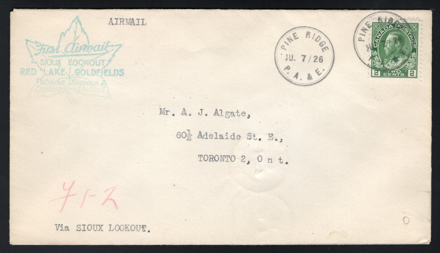 1070 CVR CL13b image1926 First Flight Cover Franked with a CL13 with "Small t in TO" Variety, the very fine stamp is tied on back of the cover by a green Maple Leaf cachet and JUL.7.1926 Pine Ridge datestamp. Front has a 2c Map stamp tied by a Sioux Lookout cds of same date, alongside a free strike of the green cachet. A very fine and scarce stamp on cover. (Scan 1) (Scan 2) (Scan 3) (All Scans)