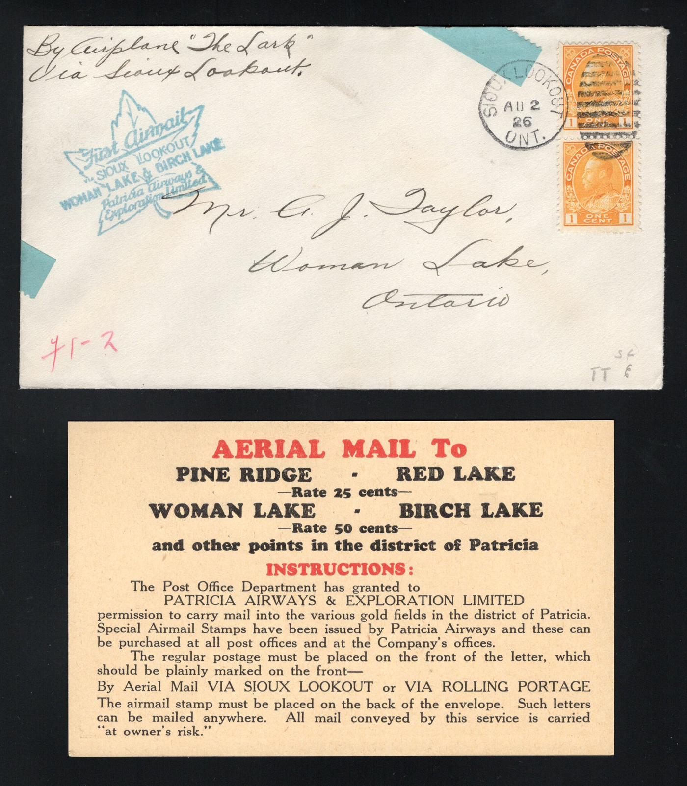 1075 CVR CL18c image1926 Flown Cover Franked with a CL18 Stamps with the "OTT" Variety, with Special Insert, mailed Sioux Lookout on AUG.2.1926 to Woman Lake, AUG.2 cds ties the variety stamp on back. Front and back show the Maple Leaf cachet in blue-green, a very fine and fresh cover which includes the special insert, being a Patricia Air Service card with map on one side and instructions on the other. (Scan 1) (Scan 2) (Scan 3) (All Scans)