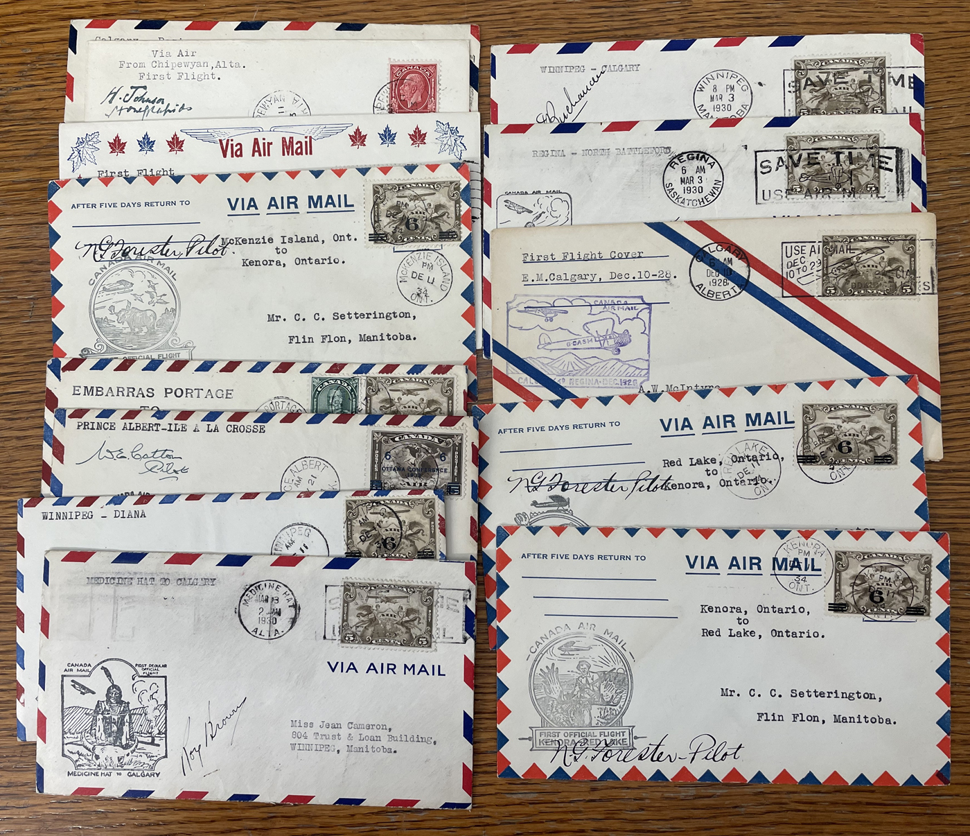 1063 CVR   imageGroup of 17 Pilot Signed First Flight Covers, 1928-1936, from roughly 10 different pilots, flying mostly Ontario or western first flights, noting signatures from Roy Brown, W.J. Buchanan, N.G. Forester, just to name a few. Most of the covers have Unitrade #s C1, C3 or C4 frankings. A nice lot for the aerophilatelist, overall fine to very fine. (Scan 1) (Scan 2) (All Scans)