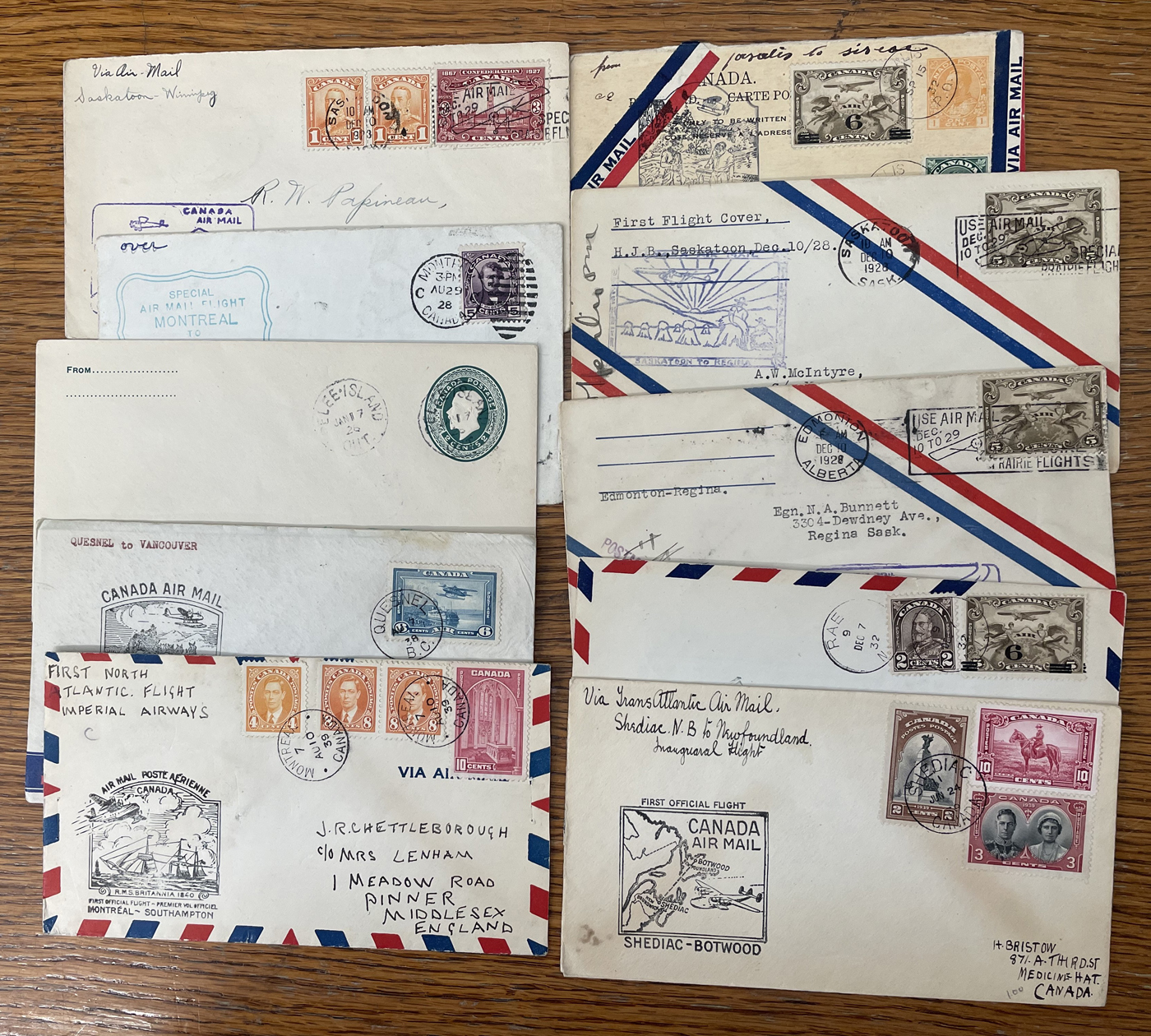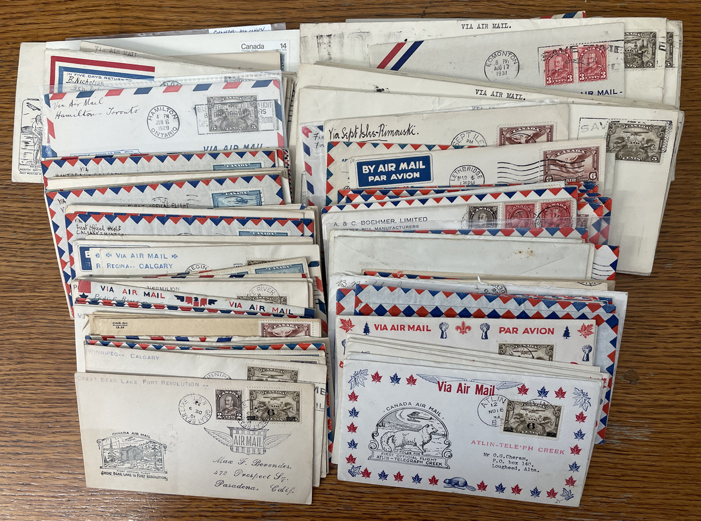 1064 CVR   imageGroup of Roughly 220 First Flight Covers, 1928-1939, with mostly C1-C6 frankings along with a few commemorative and definitive issues from the 1930s, with better representation from western provinces and the Northwest Territories, including a few Postmaster signed covers, C4 first day cover, and more. Duplication appears to be 1 to 5 for a few flights, with roughly 20% being #10 sized envelopes. A few corner faults with a few of the covers, still a nice lot for the aerophilatelist, overall fine to very fine. (Scan 1) (Scan 2) (Scan 3) (All Scans)