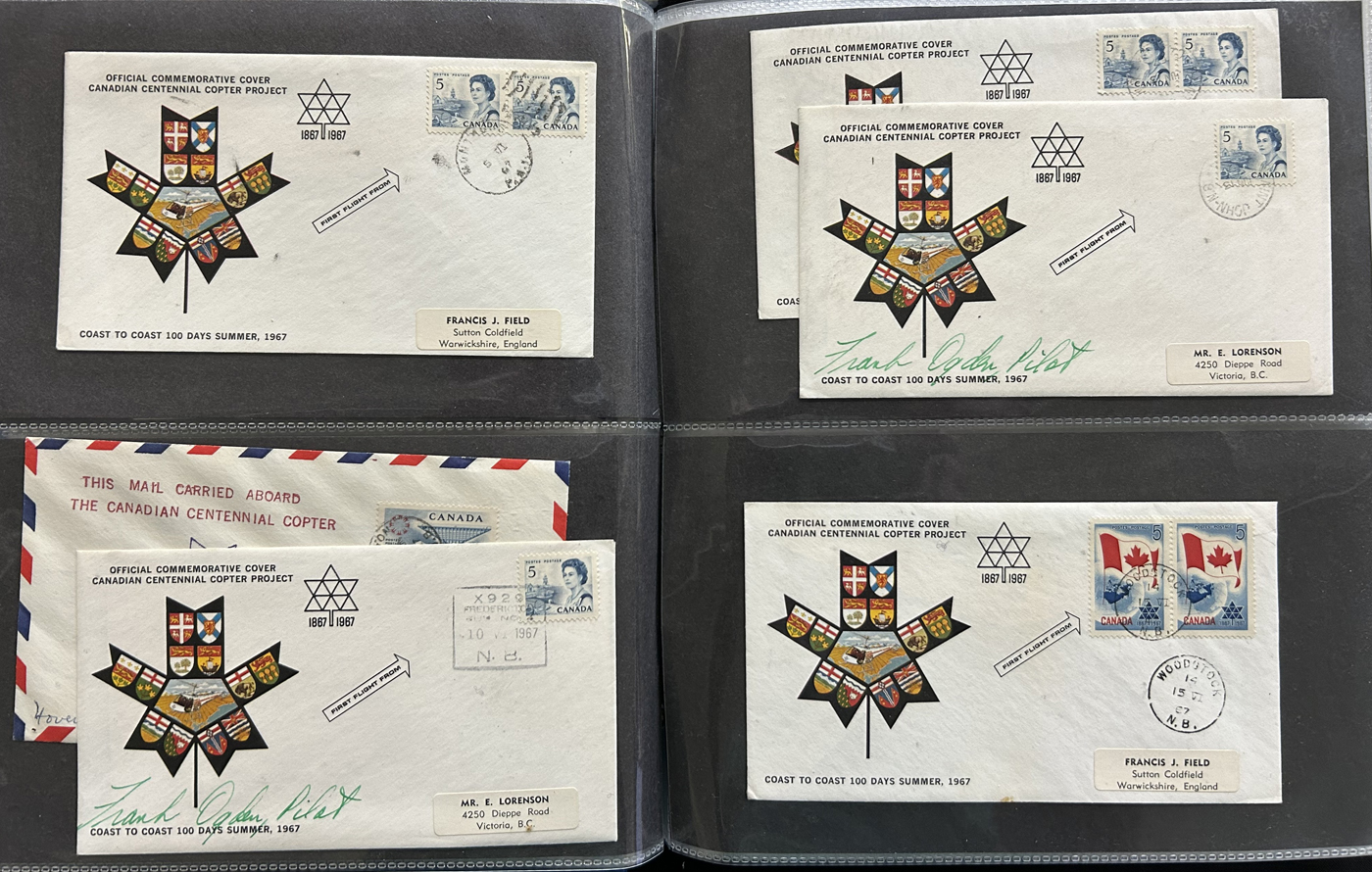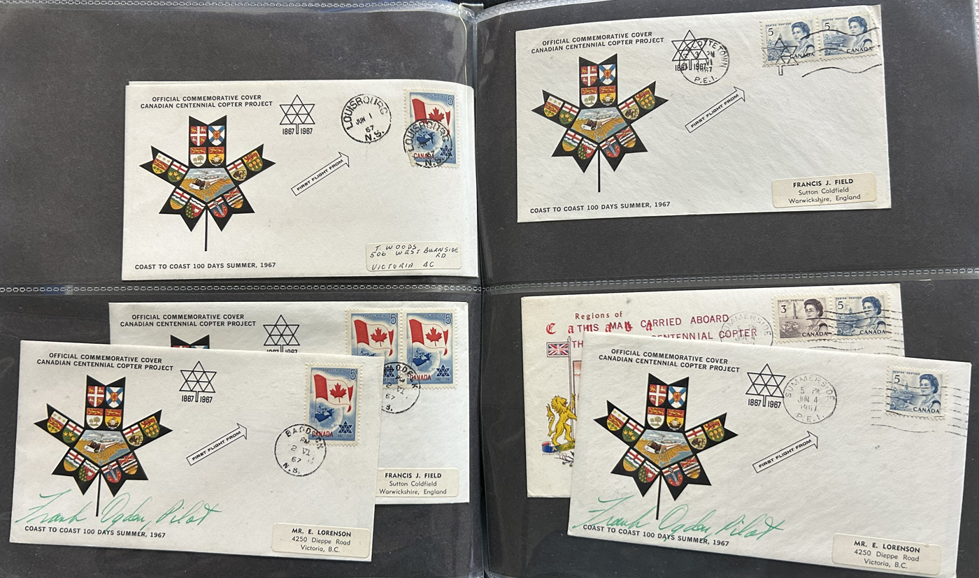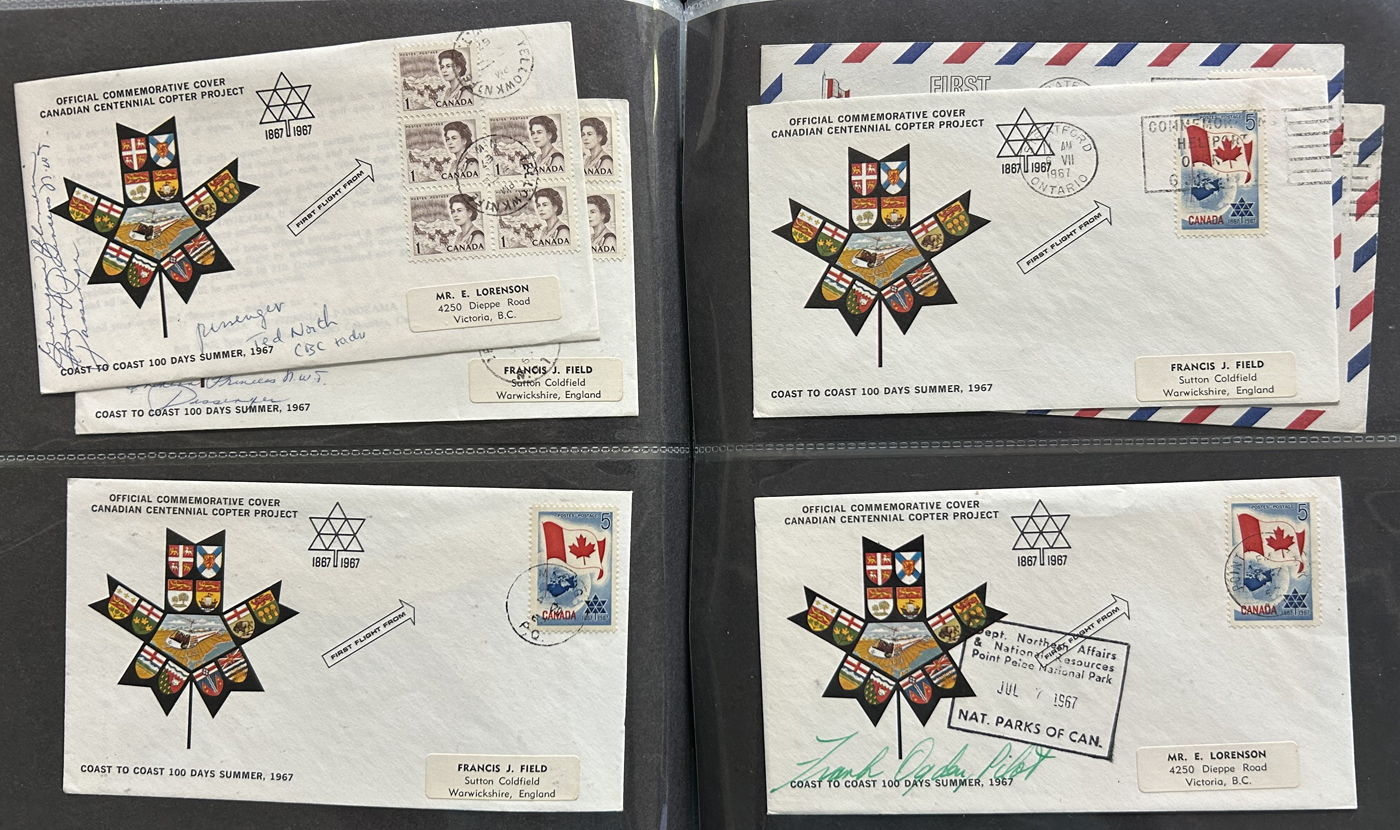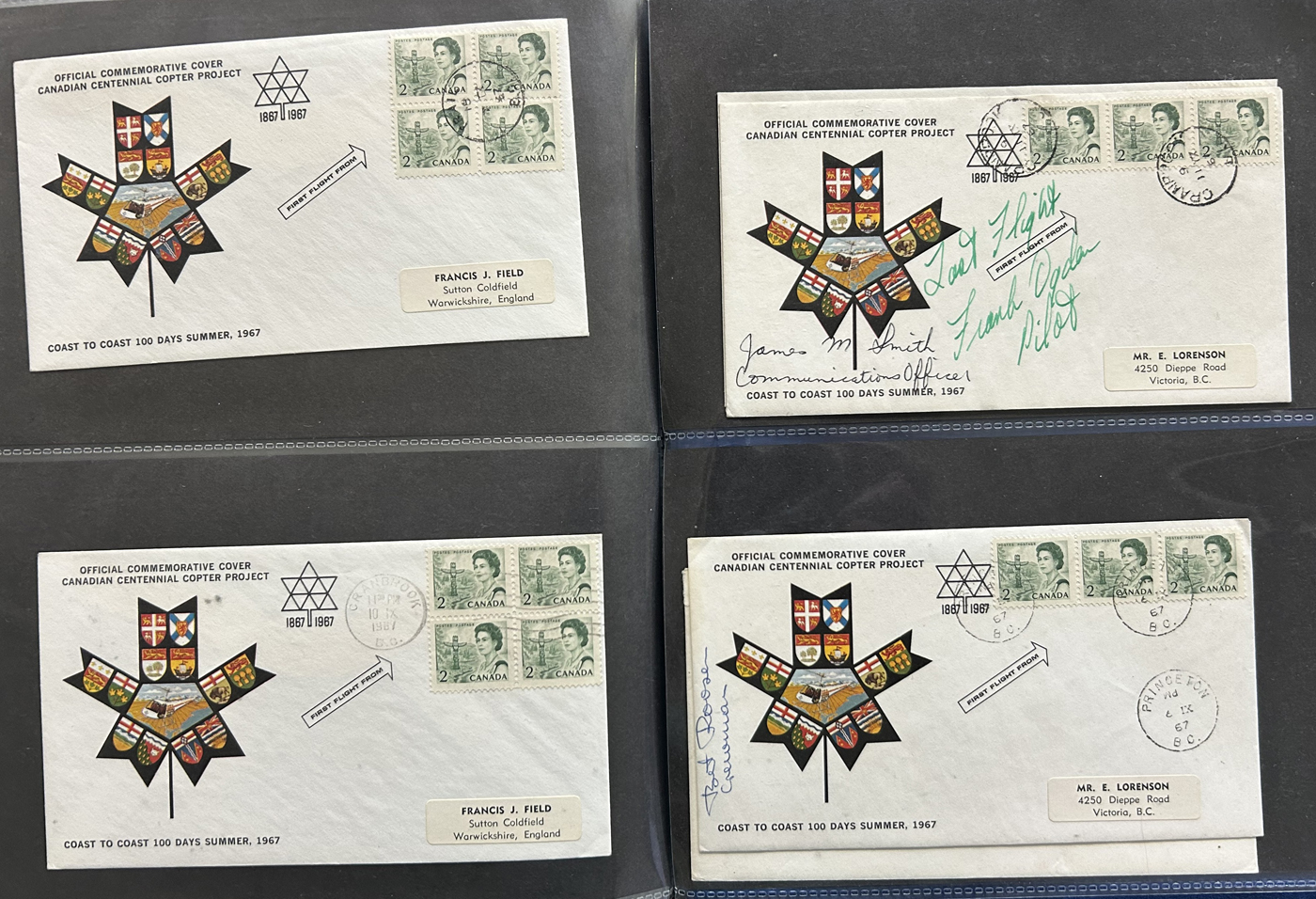 1065 CVR   imageCollection of Covers from the 1967 100-Day Helicopter Flight Across Canada, an apparently complete collection, with 140 Centennial-franked covers (incl. duplication of dates, often on different cover styles) with each dated on the 93 legs of the trip, which started on MAY.1.1967 in Michigan and ended on SEP.20.1967 in Alaska, going through all of Canada. Includes a published list of all the legs, to which this owner added 6 stops that it was missing. Very fine, and rarely seen so complete. (Scan 1) (Scan 2) (Scan 3) (Scan 4) (Scan 5) (All Scans)