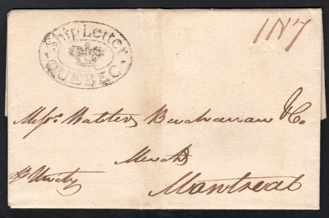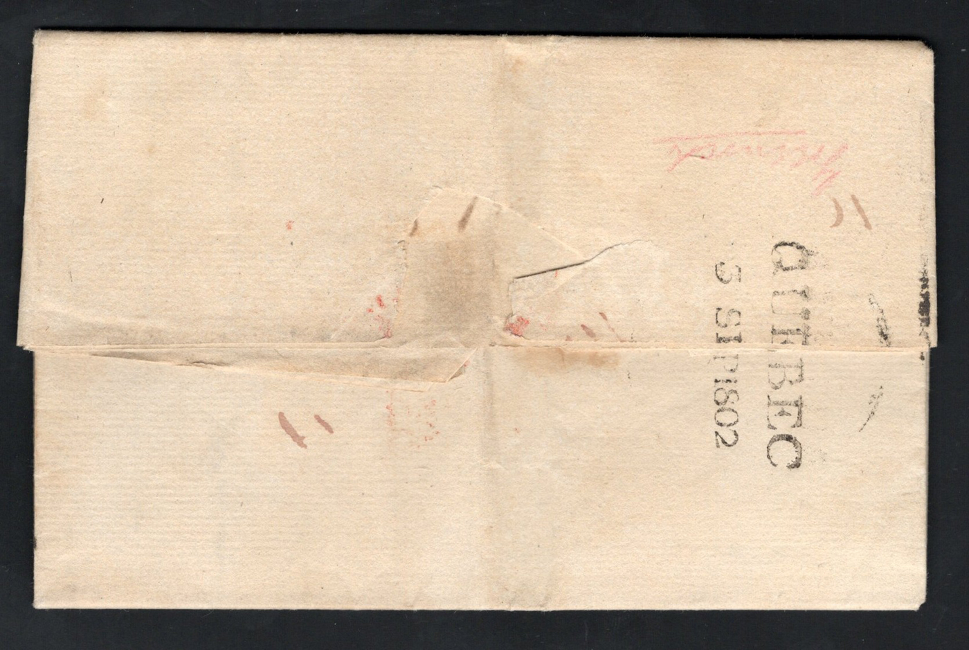 1079 CVR   image1802 Québec Straightline on Incoming Ship Letter Cover to Montréal, datelined inside Greenock AUG.6.1802 plus AUG.6.1802 docketing, with a beautiful strike of the Québec straightline transit dated "3 SEP 1802" also with a great strike of an oval "Québec Ship Letter" crown handstamp on front. Addressed to Montréal and manuscript rated "1N7". These postmarks are rarely seen this nice, very fine. A clean example of an early trans-Atlantic cover. (Scan 1) (Scan 2) (All Scans)