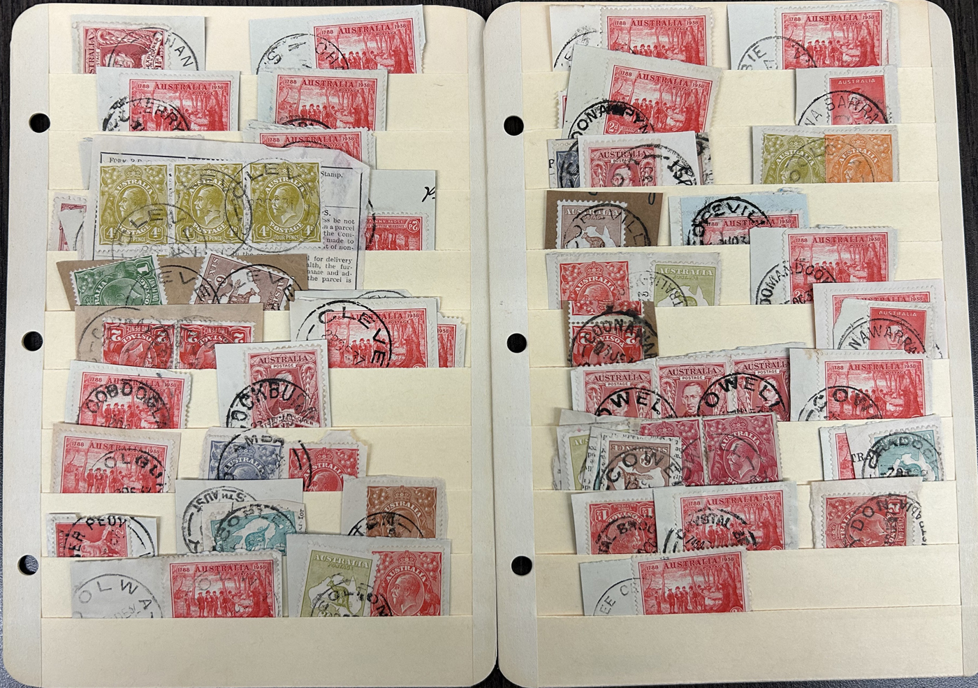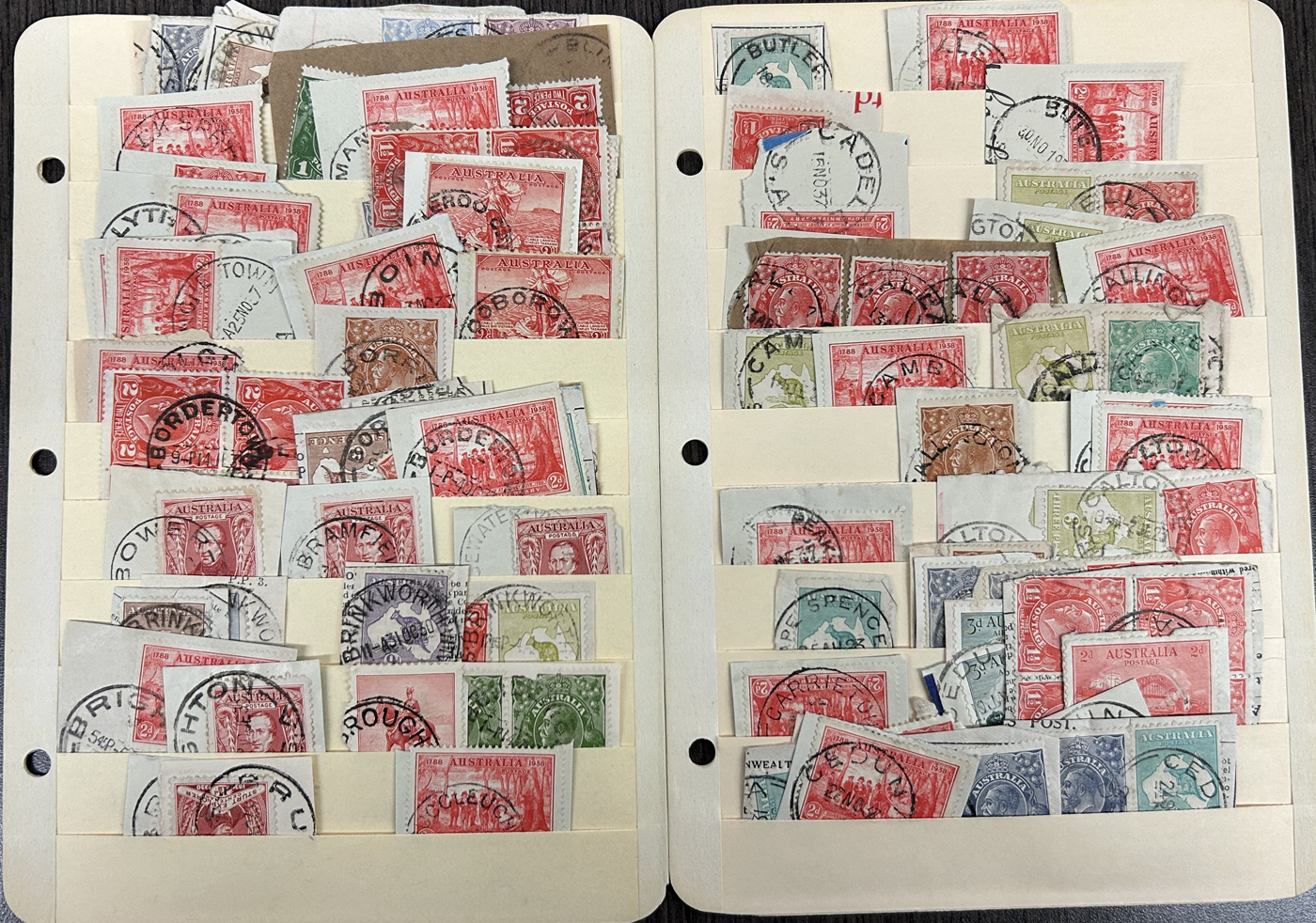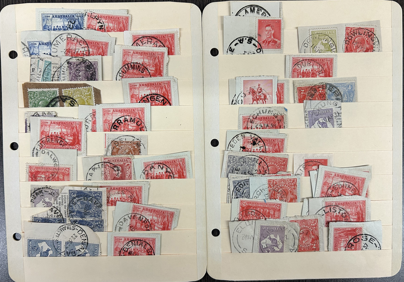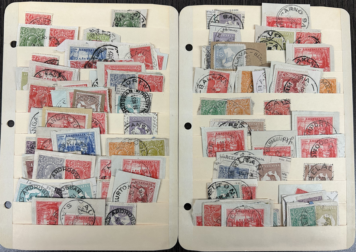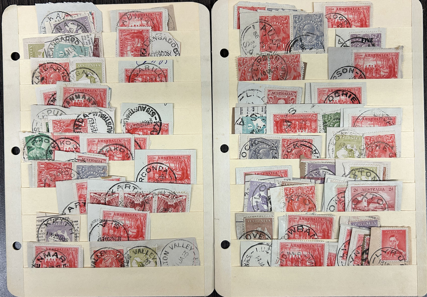 1220 O   imageCollection of Selected Australia Town Postmarks on Stamp on Piece, Roos to Late 1930s, with well over 1,000 pieces, with postmarks from all over the country sorted alphabetically in dealer-size manila pages. The great majority are c.d.s. types, from a large variety of different towns, noting duplication of some. A much above average lot for the quality of the strikes, which are for the most part complete and fully readable. See photos for an idea of what this lot contains. (Scan 1) (Scan 2) (Scan 3) (Scan 4) (Scan 5) (All Scans)