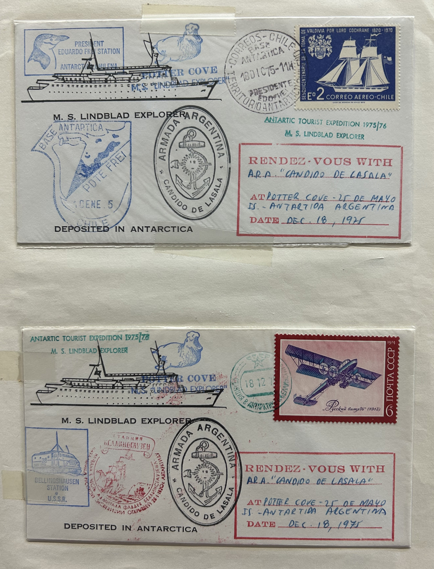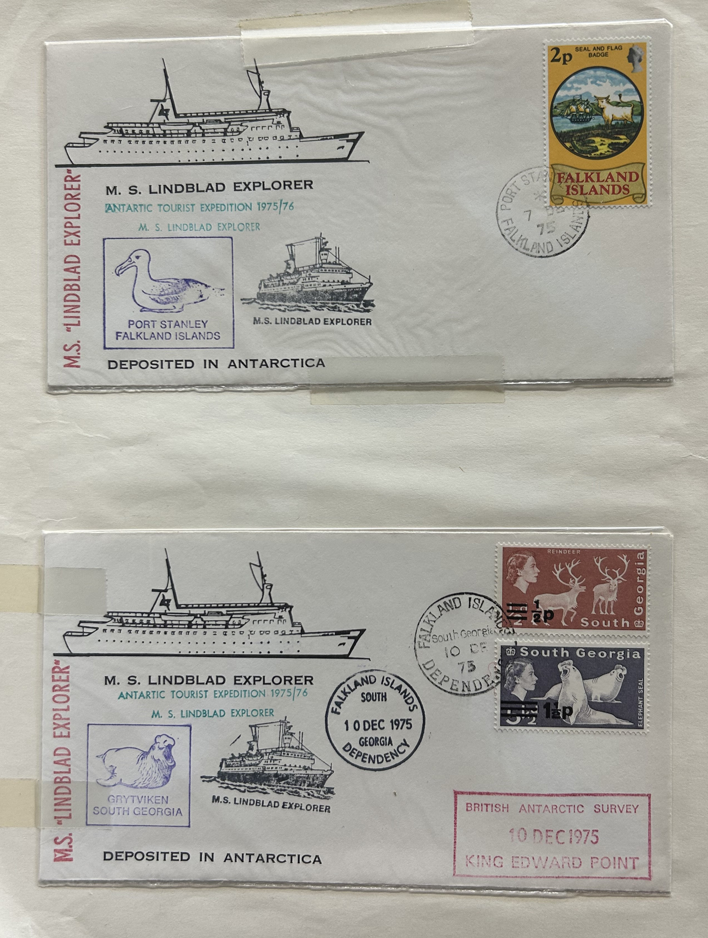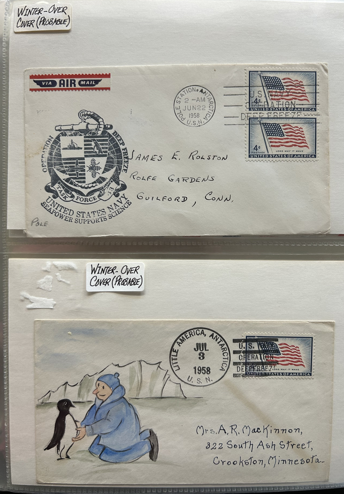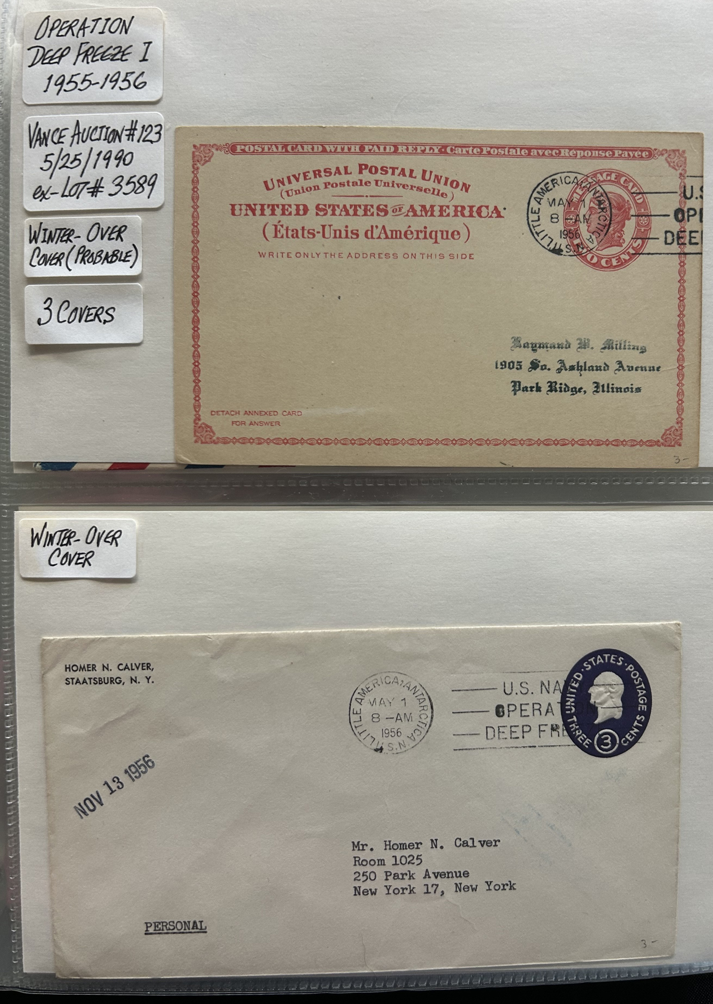 1218 CVR/nh   imageExtensive Collection of Antarctica Covers and Stamps in Three Volumes, Early 1950s to 2000s, consisting of 312 total covers and cards, with 67 in one binder from many different countries, plus 245 in the other two, mostly franked with United States stamps. All sorts of subjects covered, loaded with special cachets and postmarks, plus a lot of ephemera literature on each expedition, operation, project, expedition, etc. Very fine throughout. (Scan 1) (Scan 2) (Scan 3) (Scan 4) (Scan 5) (Scan 6) (Scan 7) (Scan 8) (Scan 9) (Scan 10) (Scan 11) (Scan 12) (Scan 13) (All Scans)