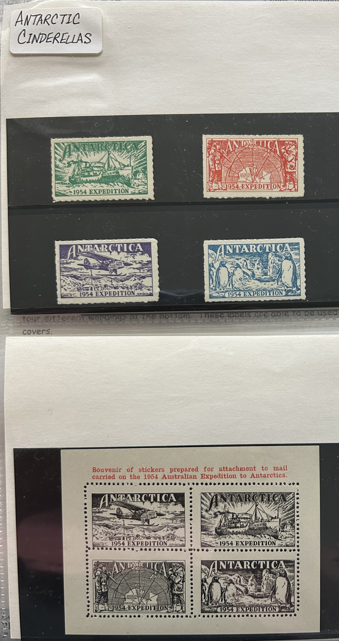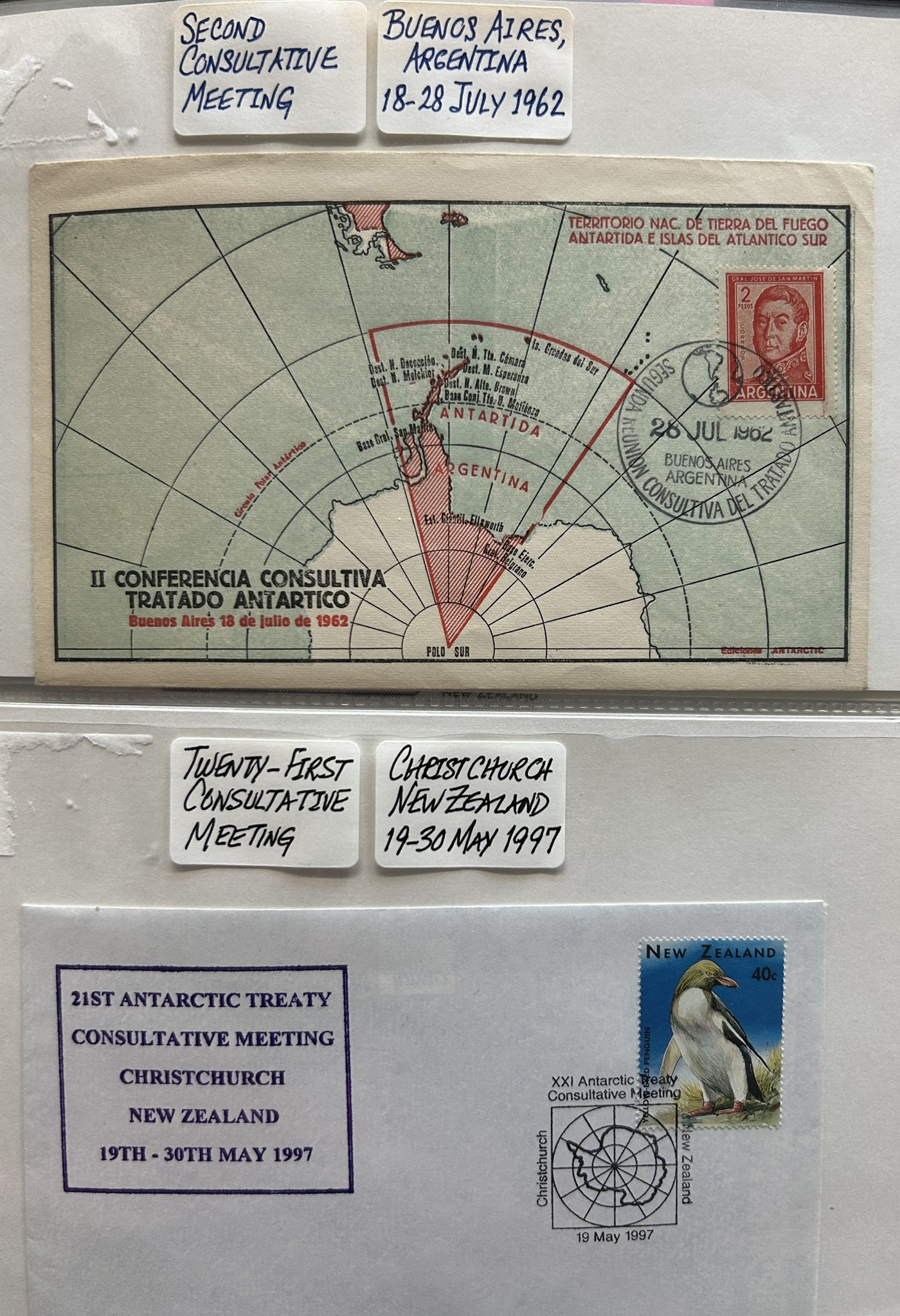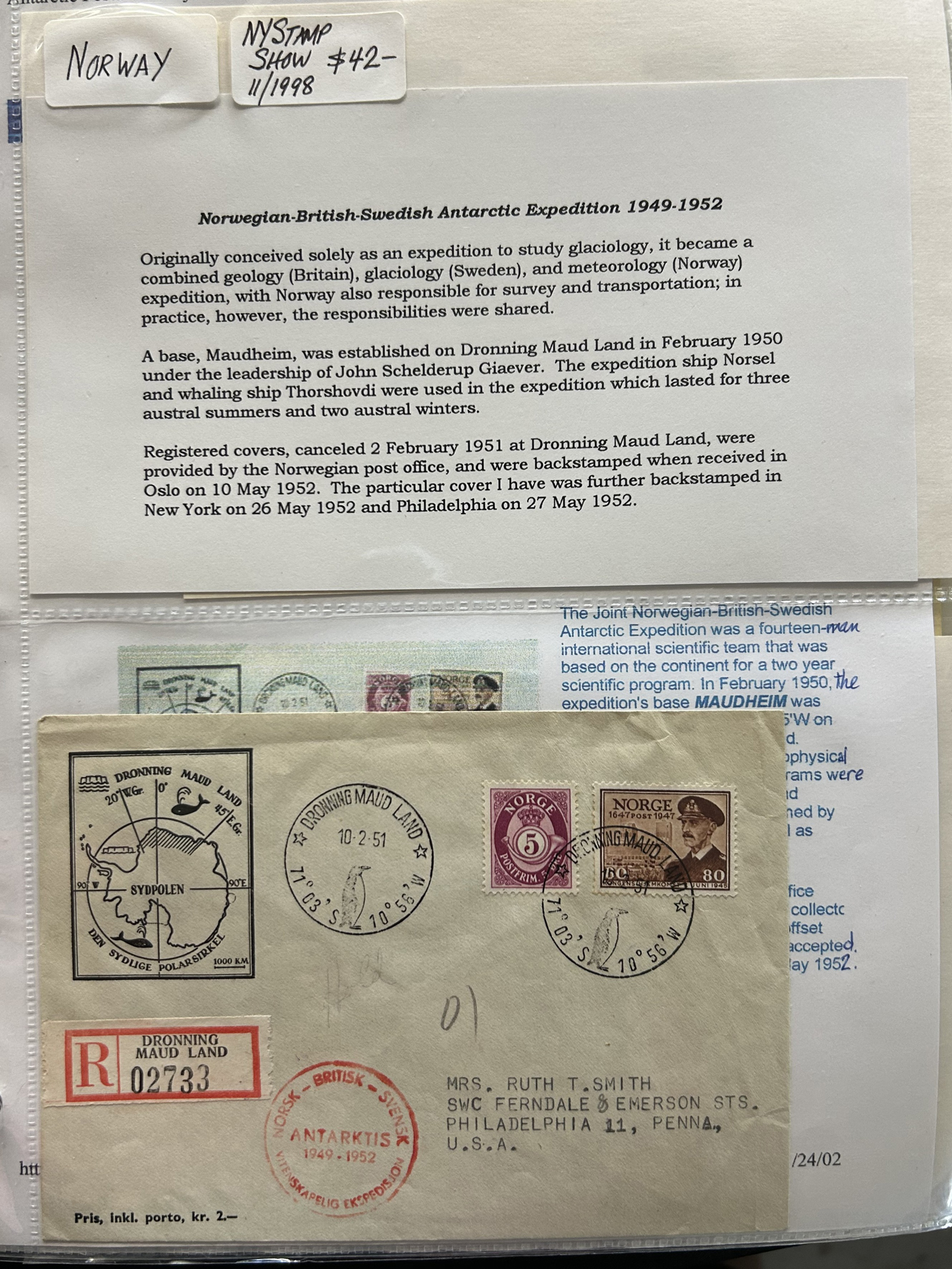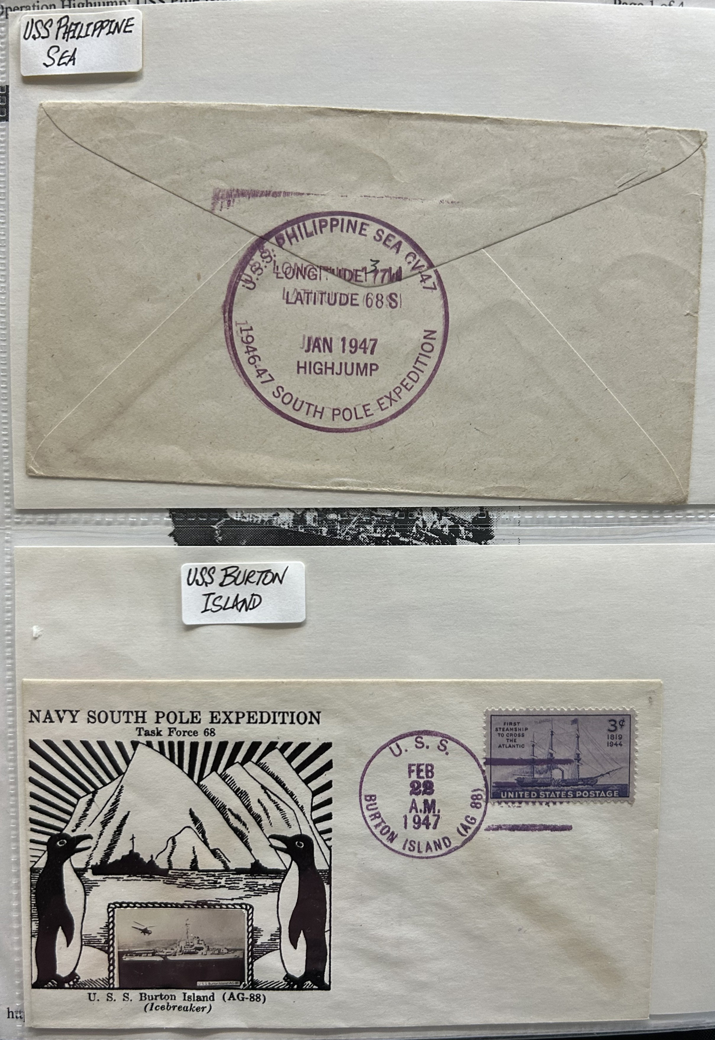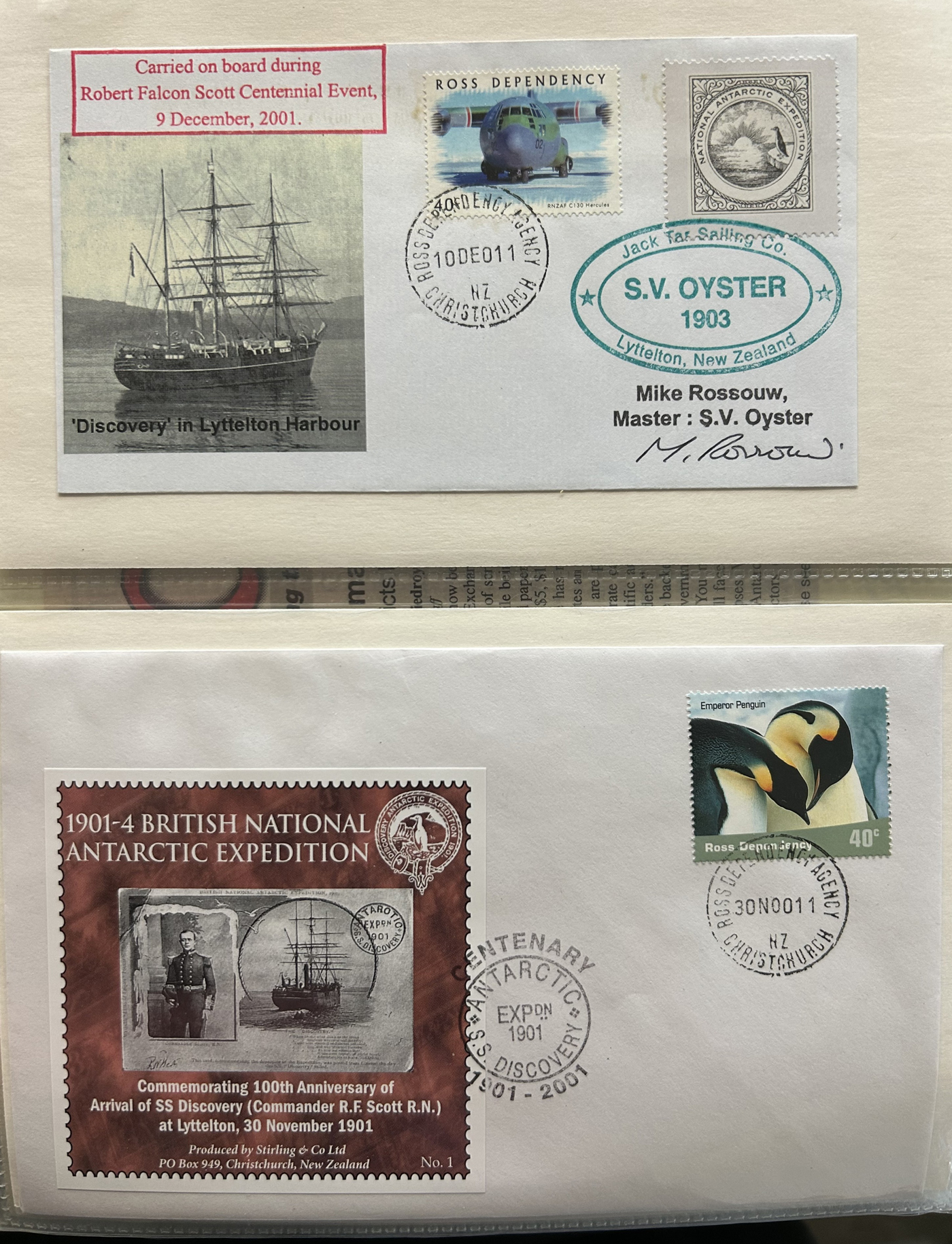 1218 CVR/nh   imageExtensive Collection of Antarctica Covers and Stamps in Three Volumes, Early 1950s to 2000s, consisting of 312 total covers and cards, with 67 in one binder from many different countries, plus 245 in the other two, mostly franked with United States stamps. All sorts of subjects covered, loaded with special cachets and postmarks, plus a lot of ephemera literature on each expedition, operation, project, expedition, etc. Very fine throughout. (Scan 1) (Scan 2) (Scan 3) (Scan 4) (Scan 5) (Scan 6) (Scan 7) (Scan 8) (Scan 9) (Scan 10) (Scan 11) (Scan 12) (Scan 13) (All Scans)