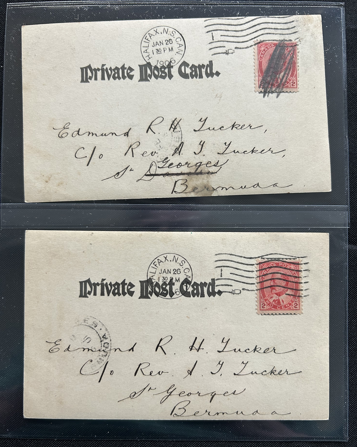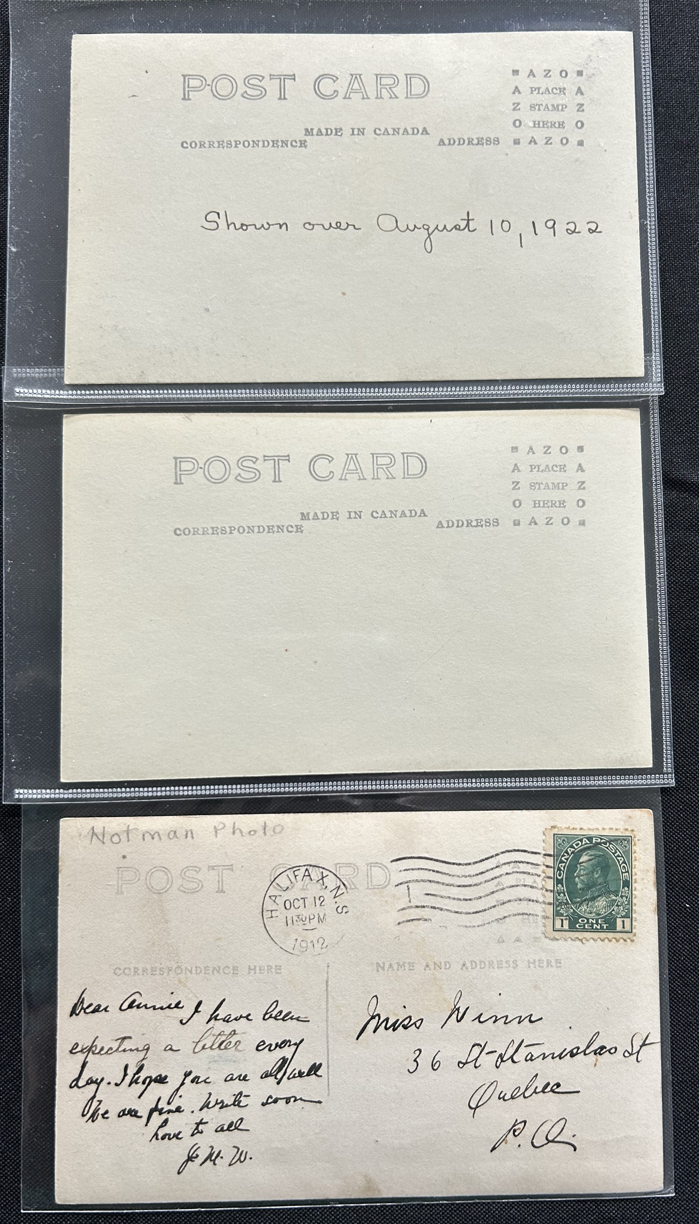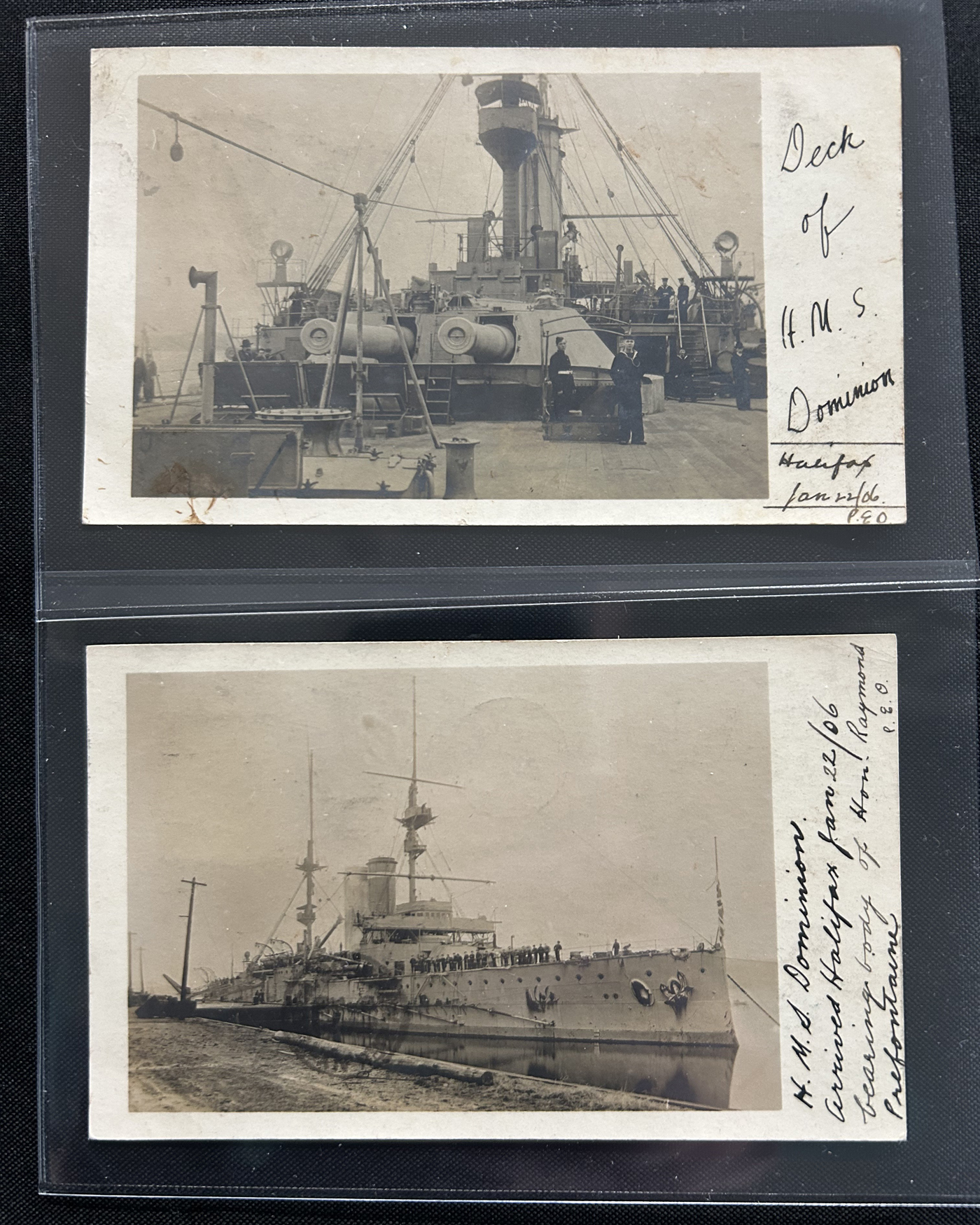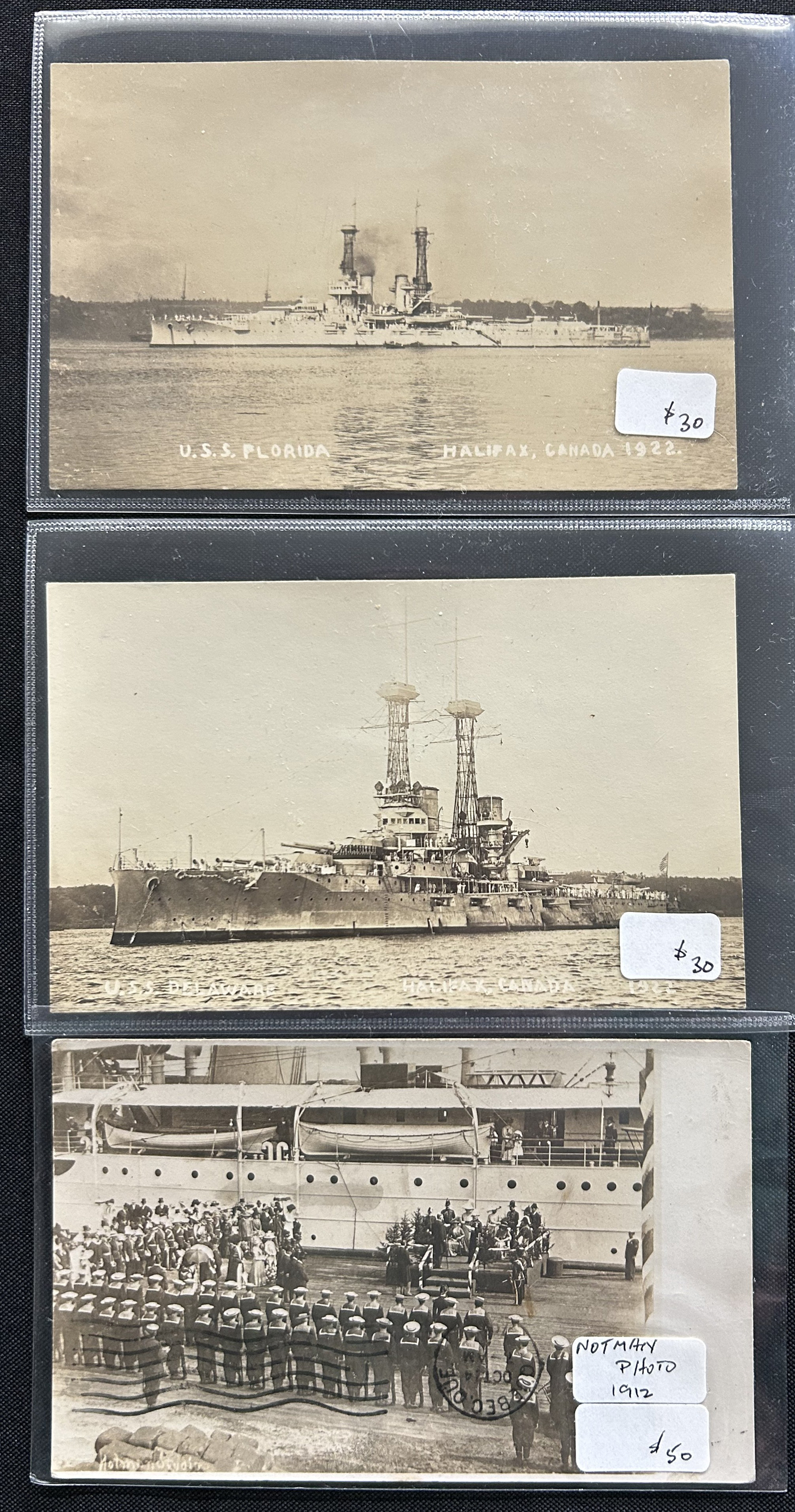 1210 PC   imageGroup of 5 Real Photo Postcards Depicting World War I Ships Docked in Halifax, two show HMS Dominion and are dated 1906 (these both mailed to Bermuda), one mailed in 1912 shows an unnamed ship and the inscription "Notman Photo", and two others show the U.S.S. Florida and U.S.S. Delaware and are dated 1922. Sleeved and priced in the $30 to $75 range, a very fine a nd rare group. (Scan 1) (Scan 2) (Scan 3) (Scan 4) (All Scans)