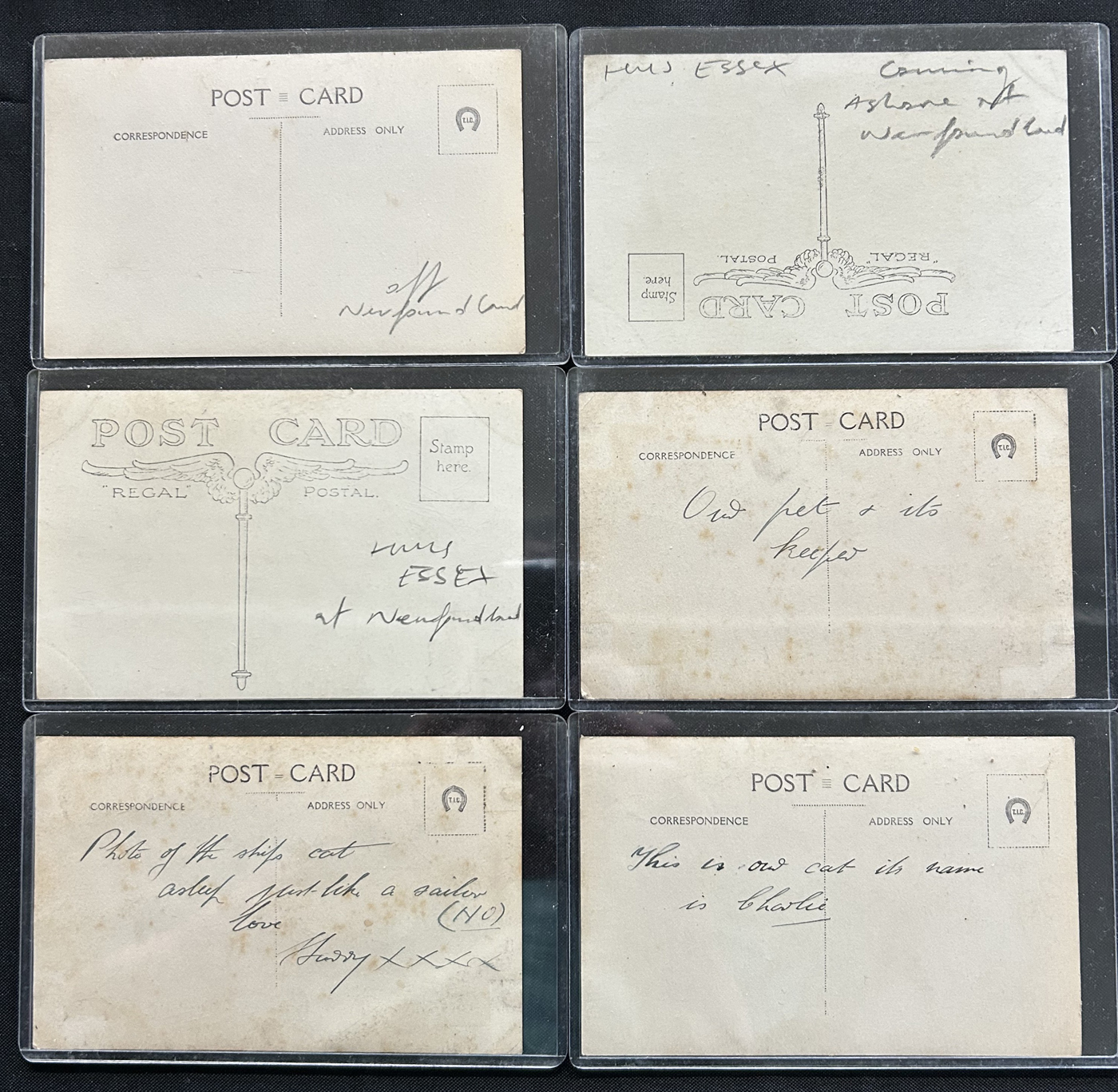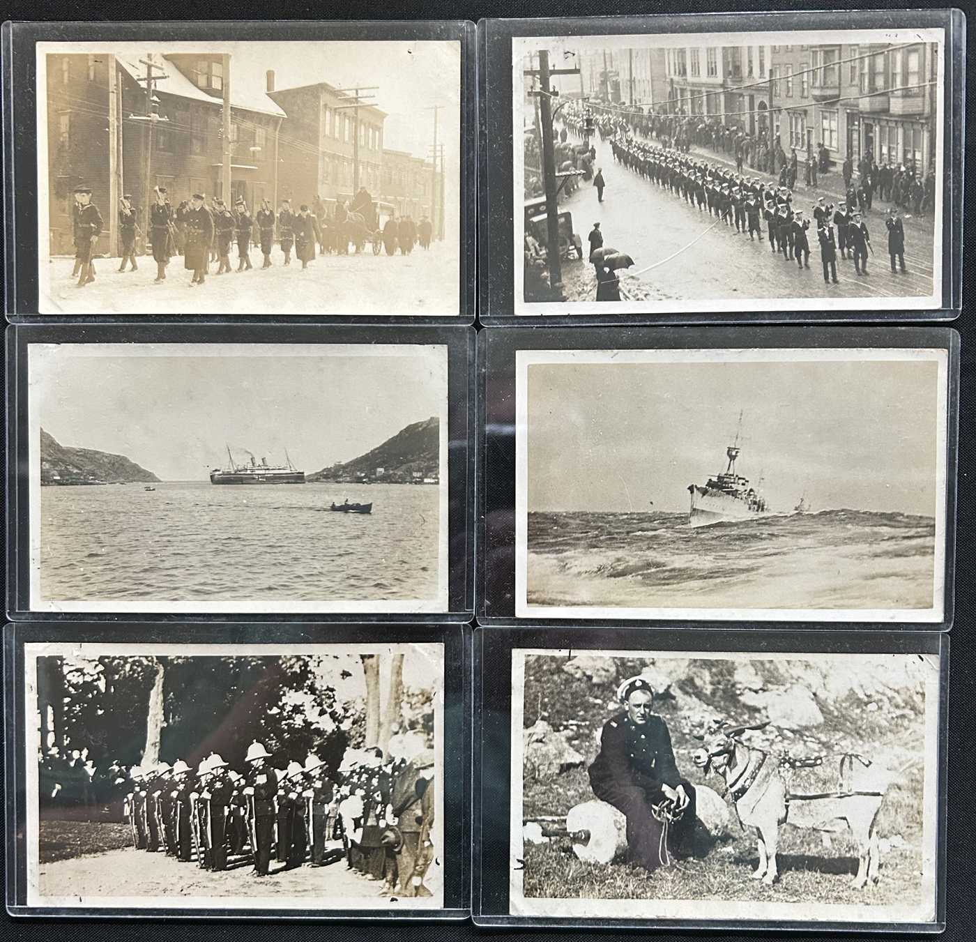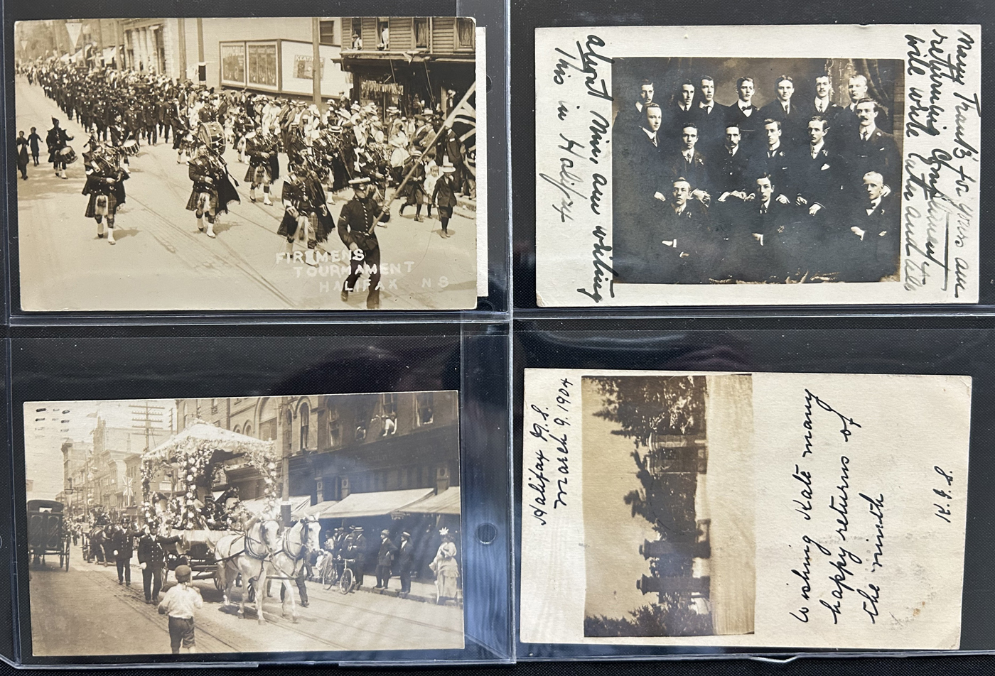 1209 PC   imageGroup of 19 Early Real Photo Postcards of Halifax Ships and Related Themes, all look to have been taken in the Halifax to St John's vicinity, noting pictured of an iceberg, two photos with note on back "HMS Essex", some show military parades (Halifax?), various ships, a sailor and his goat with note "one pet and its keeper", two photos of a cat, each with a pencil note "photo of the ships cat asleep just like a sailor (no) love Harry" and "This is our cat its name is Charlie" and more. All unused, a rare and mostly very fine grouping. (Scan 1) (Scan 2) (Scan 3) (Scan 4) (All Scans)