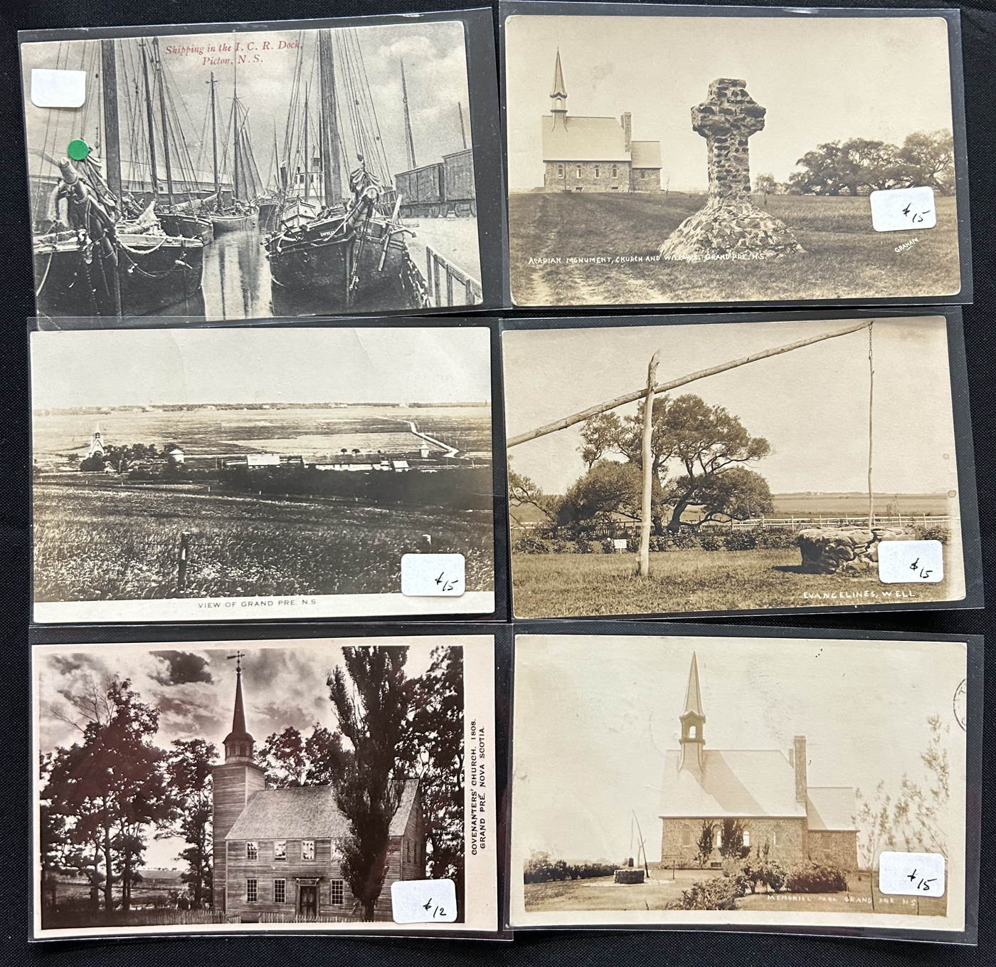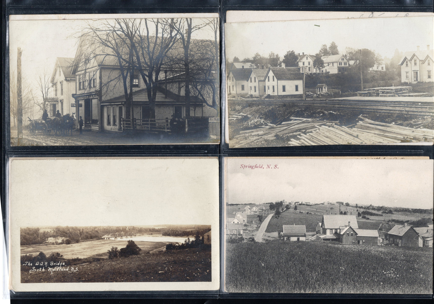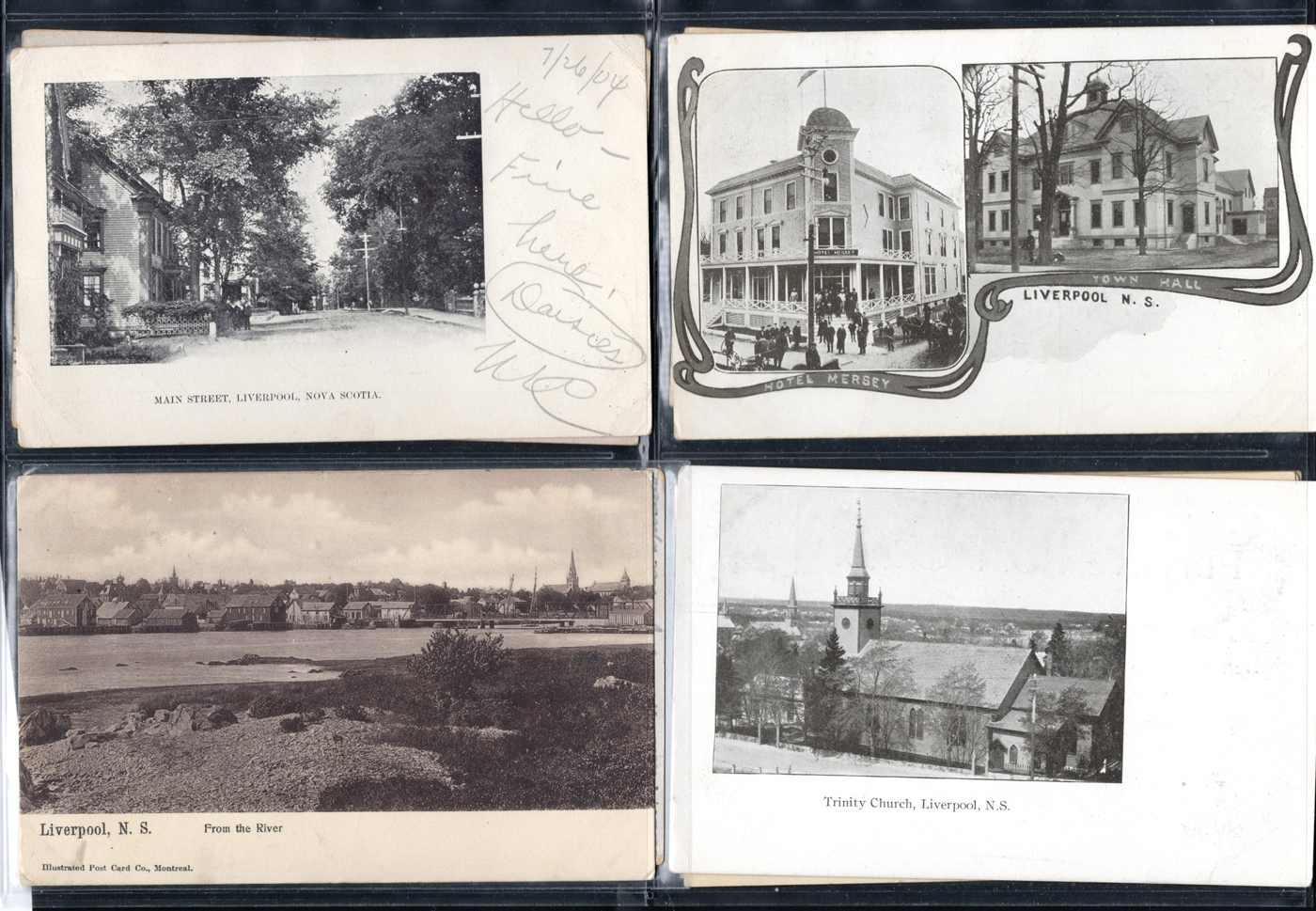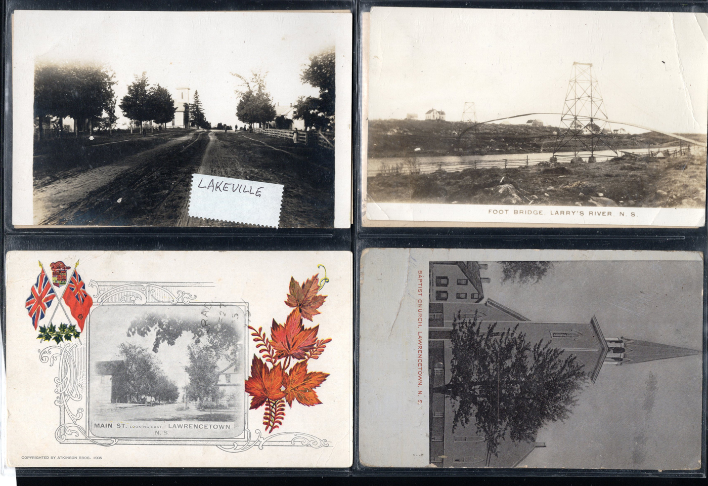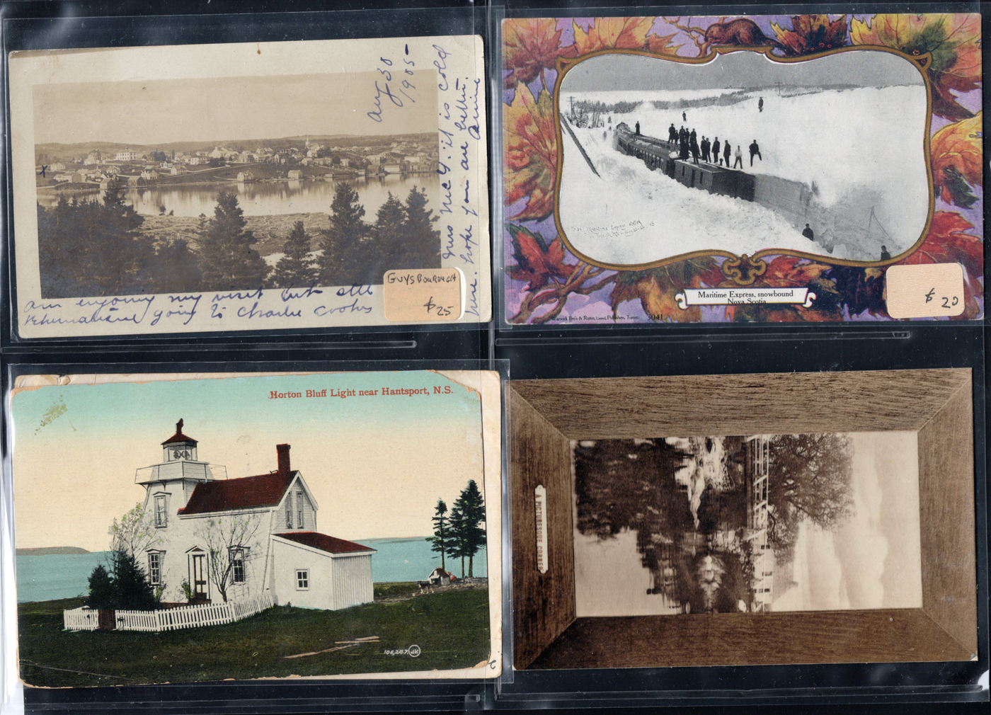 1203 PC   imageCollection of "K to M" Nova Scotia Towns Early Picture Postcards, with about 177 different mostly pre-World War II cards, sorted alphabetically by town in a postcard binder. We note a good variety of types, with real photo (many), town views, patriotic (several types, incl. series) with several scarce to rare cards. There is a mix of used and unused, so there can be postmark interest as well. Some edge, etc. faults noted, still overall fine to very fine. Photos show a good sampling. (Scan 1) (Scan 2) (Scan 3) (Scan 4) (Scan 5) (Scan 6) (Scan 7) (Scan 8) (Scan 9) (Scan 10) (Scan 11) (Scan 12) (Scan 13) (Scan 14) (Scan 15) (Scan 16) (Scan 17) (Scan 18) (Scan 19) (Scan 20) (All Scans)