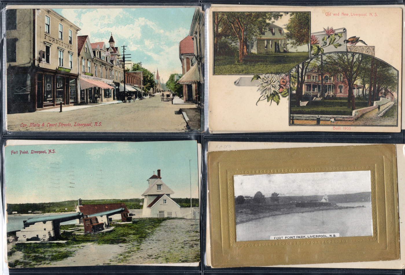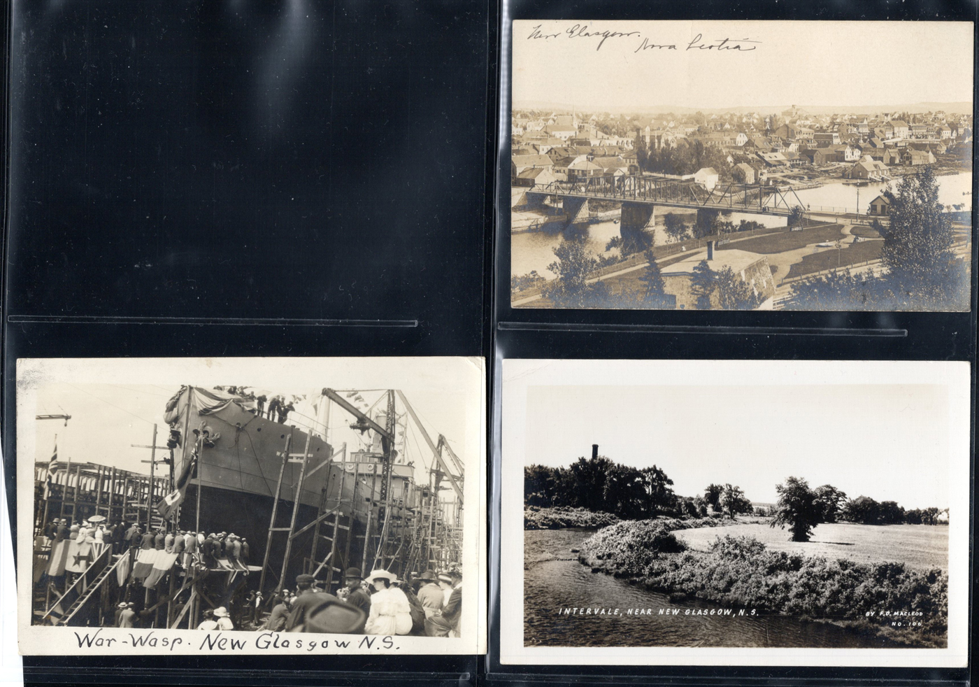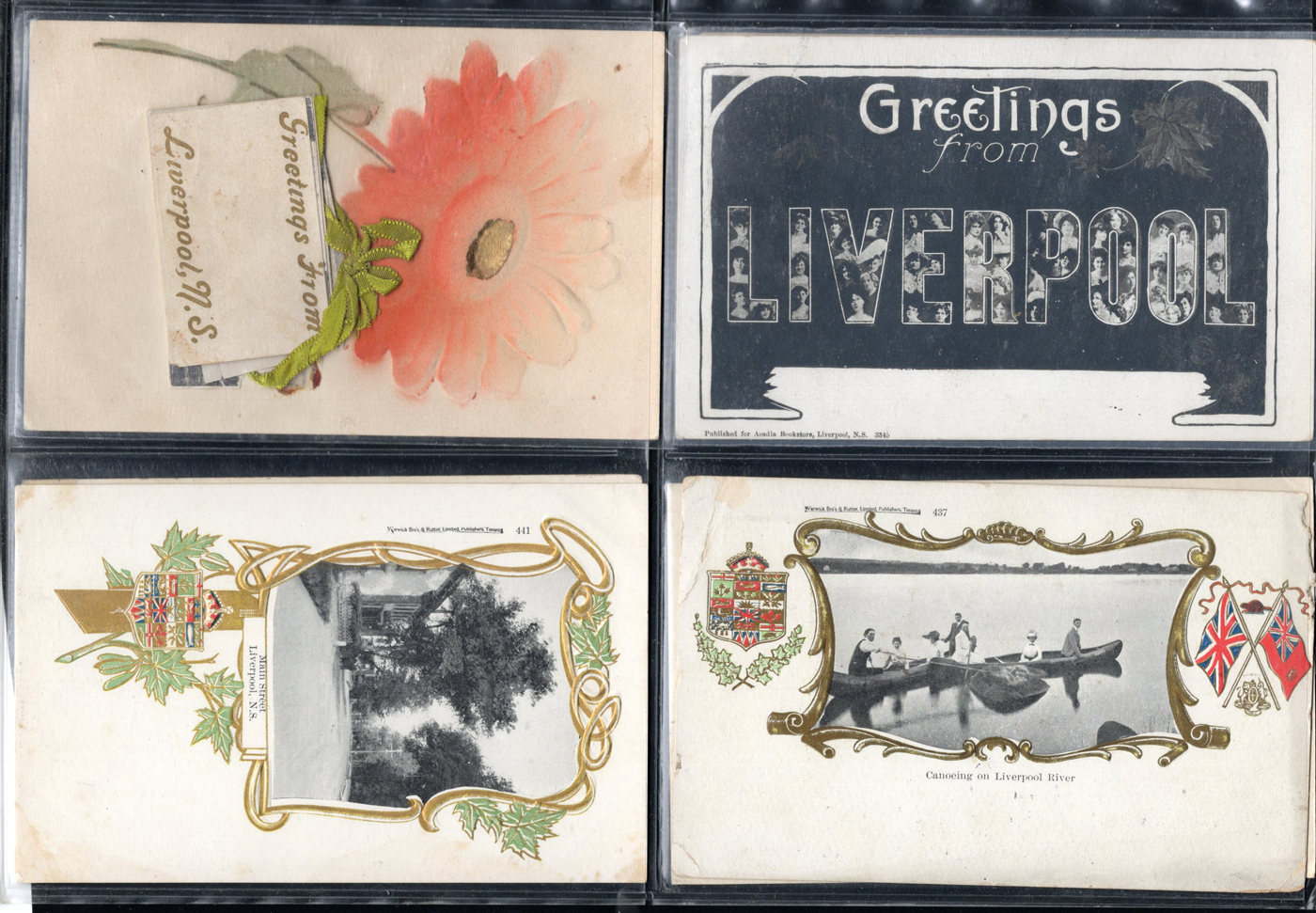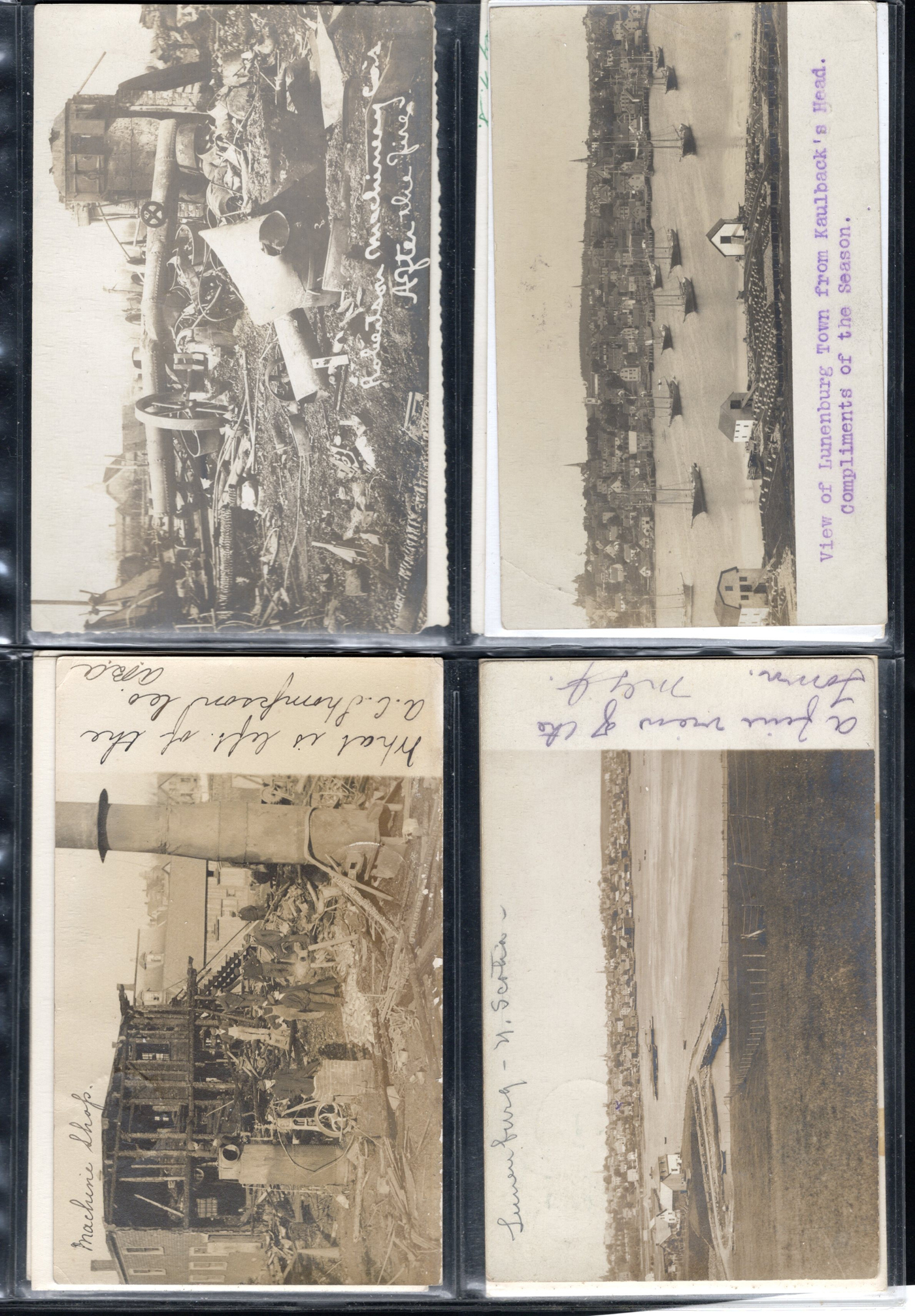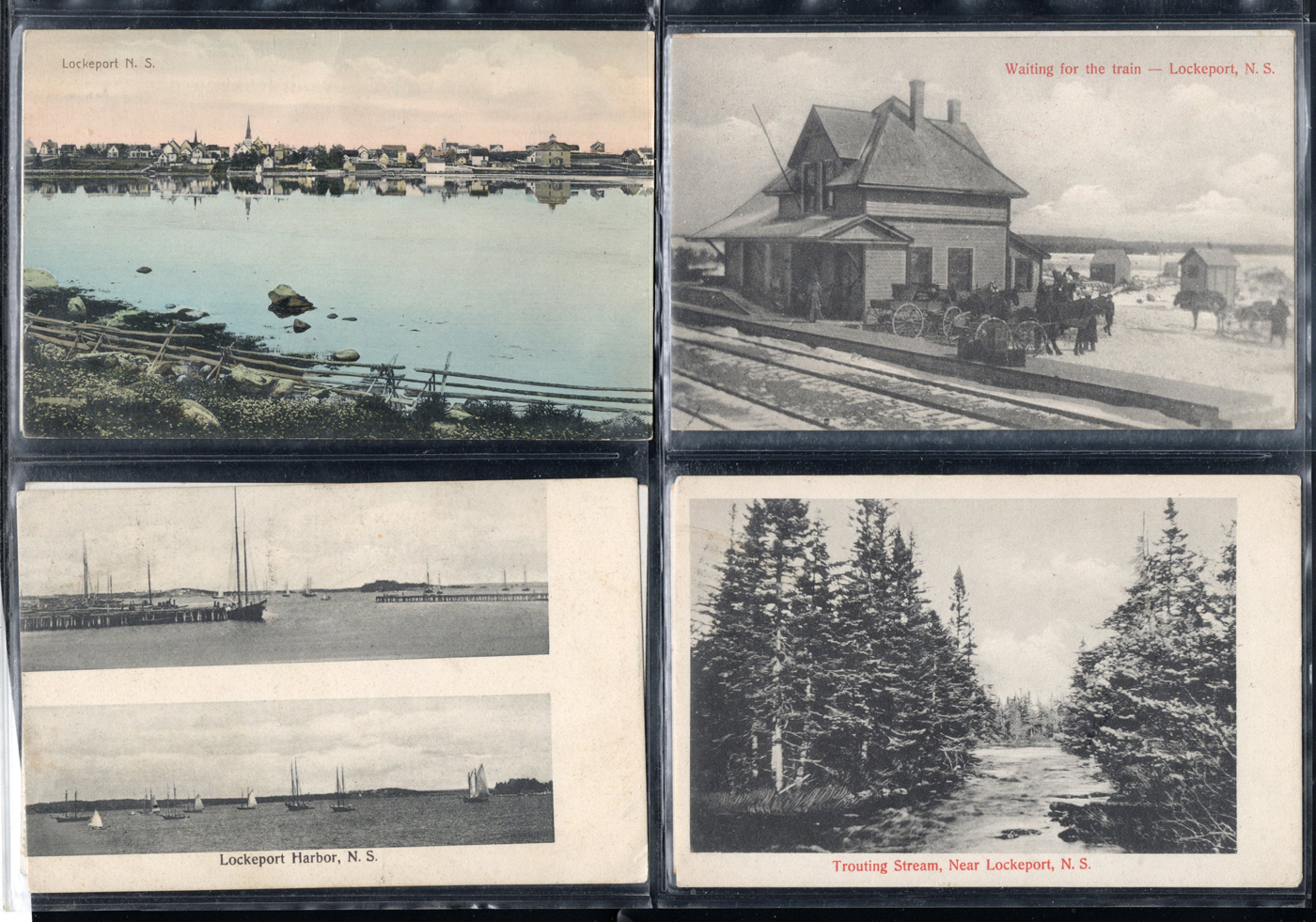 1203 PC   imageCollection of "K to M" Nova Scotia Towns Early Picture Postcards, with about 177 different mostly pre-World War II cards, sorted alphabetically by town in a postcard binder. We note a good variety of types, with real photo (many), town views, patriotic (several types, incl. series) with several scarce to rare cards. There is a mix of used and unused, so there can be postmark interest as well. Some edge, etc. faults noted, still overall fine to very fine. Photos show a good sampling. (Scan 1) (Scan 2) (Scan 3) (Scan 4) (Scan 5) (Scan 6) (Scan 7) (Scan 8) (Scan 9) (Scan 10) (Scan 11) (Scan 12) (Scan 13) (Scan 14) (Scan 15) (Scan 16) (Scan 17) (Scan 18) (Scan 19) (Scan 20) (All Scans)