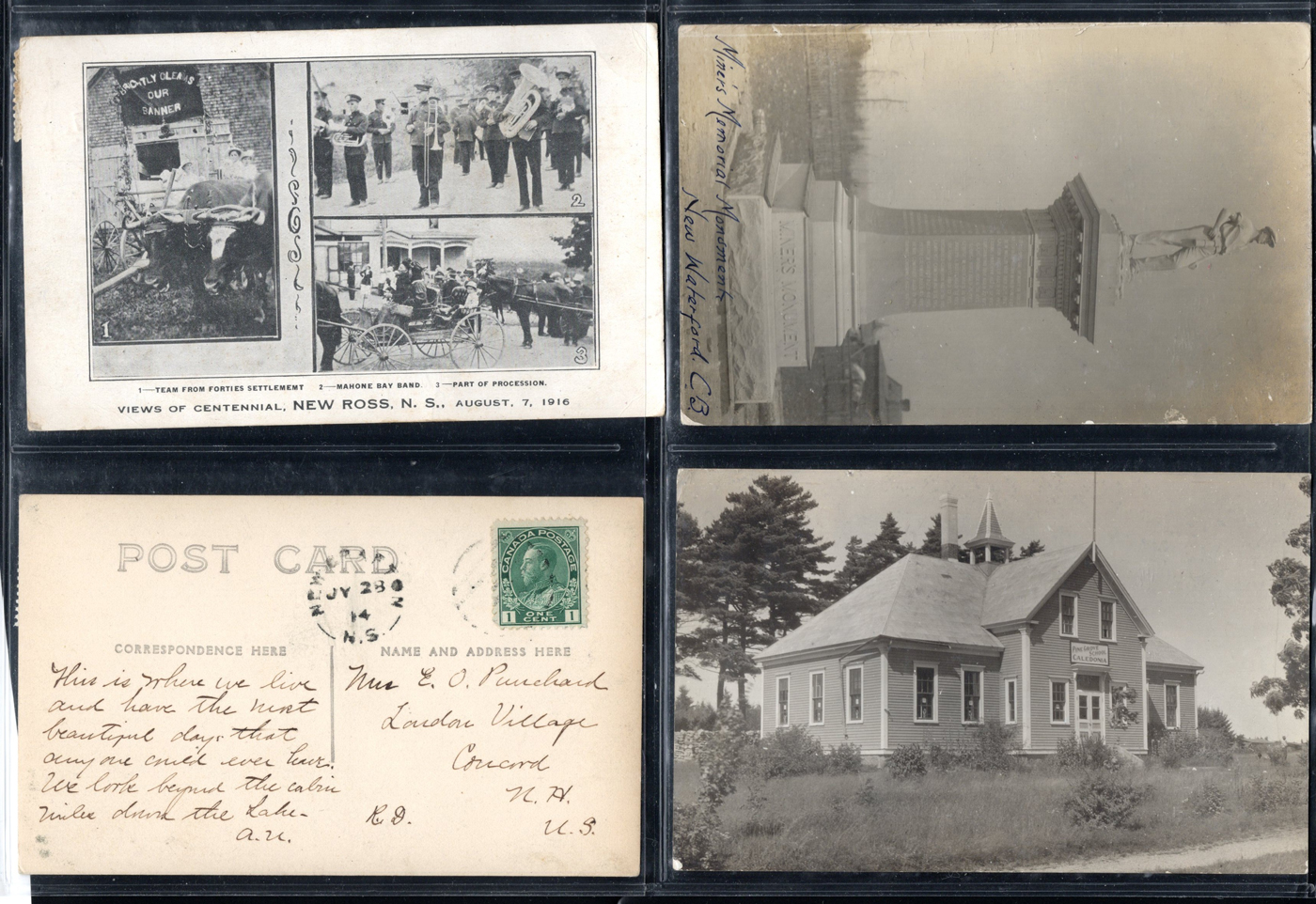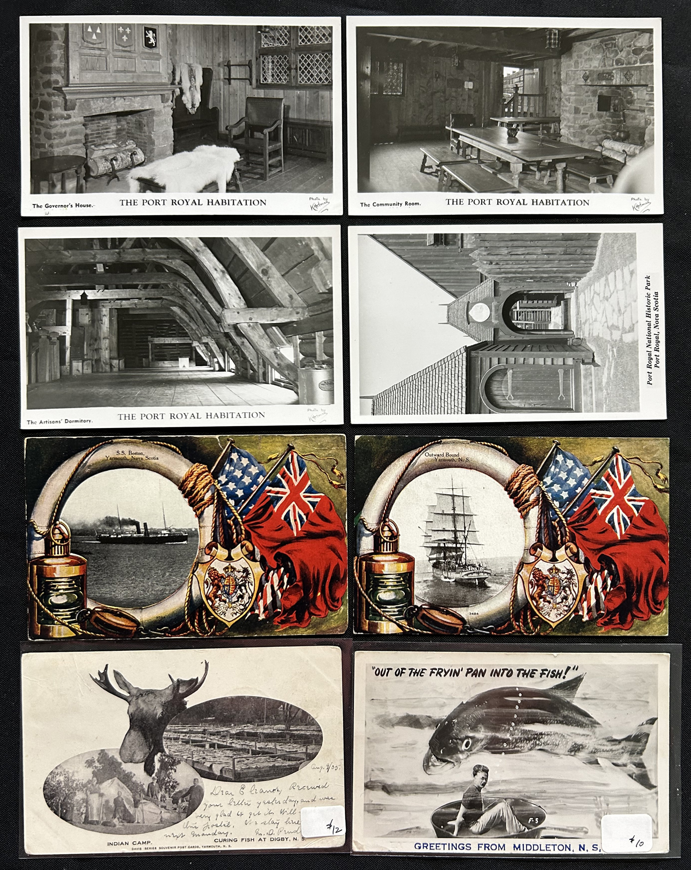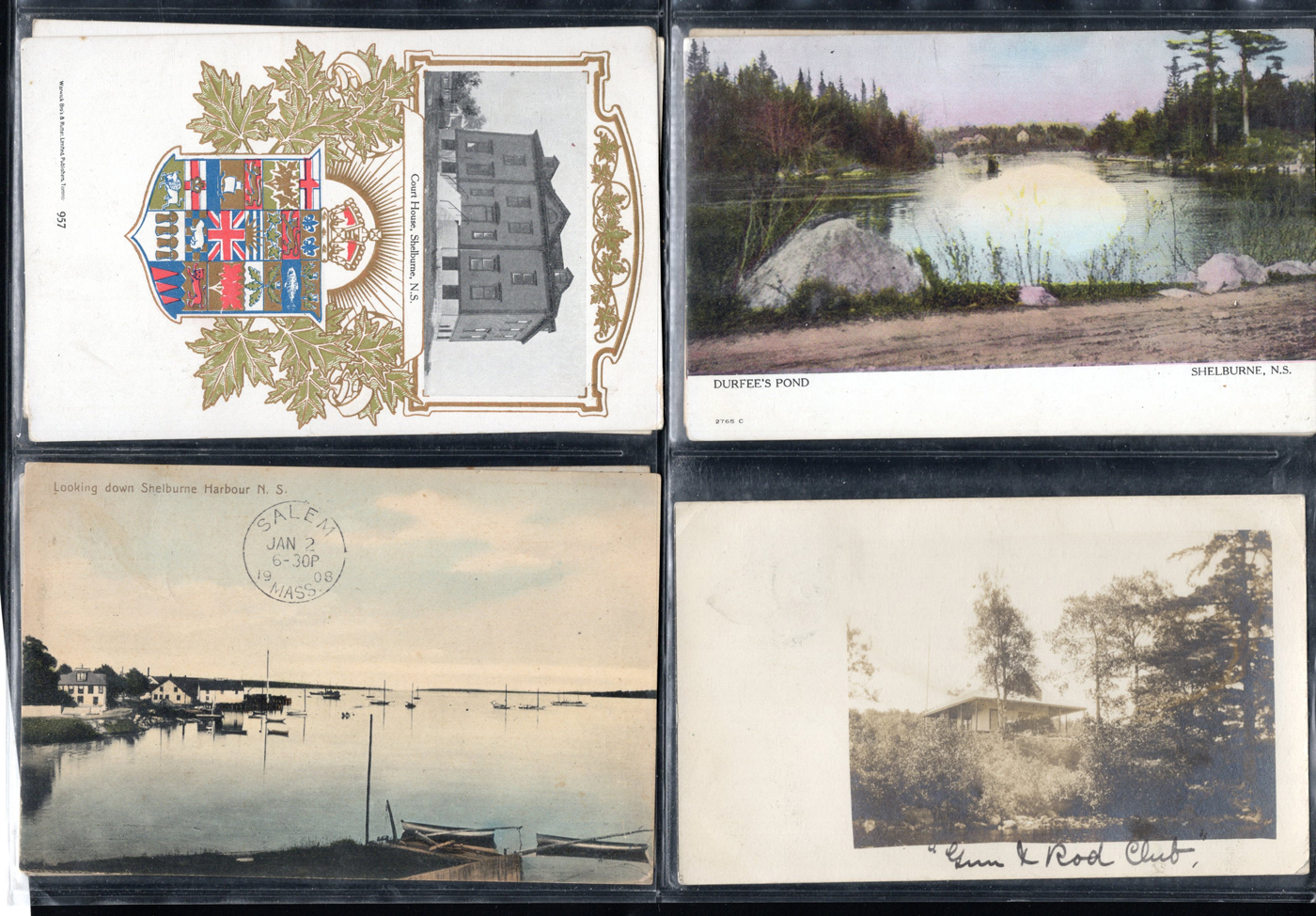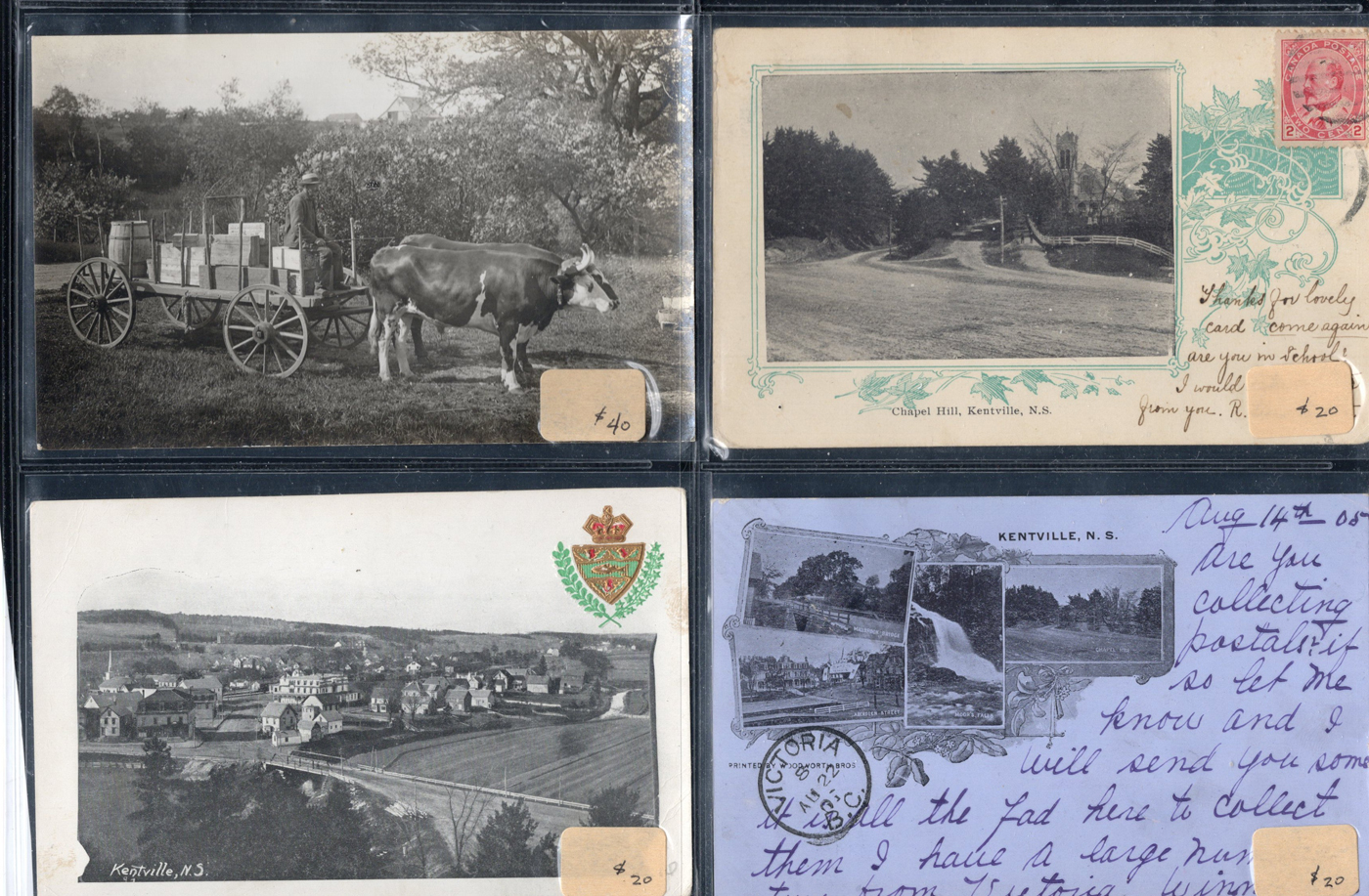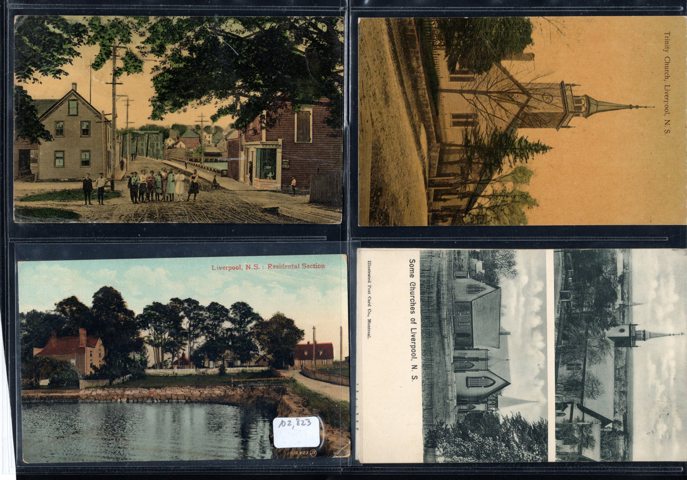 1203 PC   imageCollection of "K to M" Nova Scotia Towns Early Picture Postcards, with about 177 different mostly pre-World War II cards, sorted alphabetically by town in a postcard binder. We note a good variety of types, with real photo (many), town views, patriotic (several types, incl. series) with several scarce to rare cards. There is a mix of used and unused, so there can be postmark interest as well. Some edge, etc. faults noted, still overall fine to very fine. Photos show a good sampling. (Scan 1) (Scan 2) (Scan 3) (Scan 4) (Scan 5) (Scan 6) (Scan 7) (Scan 8) (Scan 9) (Scan 10) (Scan 11) (Scan 12) (Scan 13) (Scan 14) (Scan 15) (Scan 16) (Scan 17) (Scan 18) (Scan 19) (Scan 20) (All Scans)
