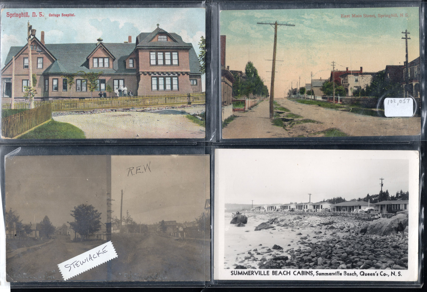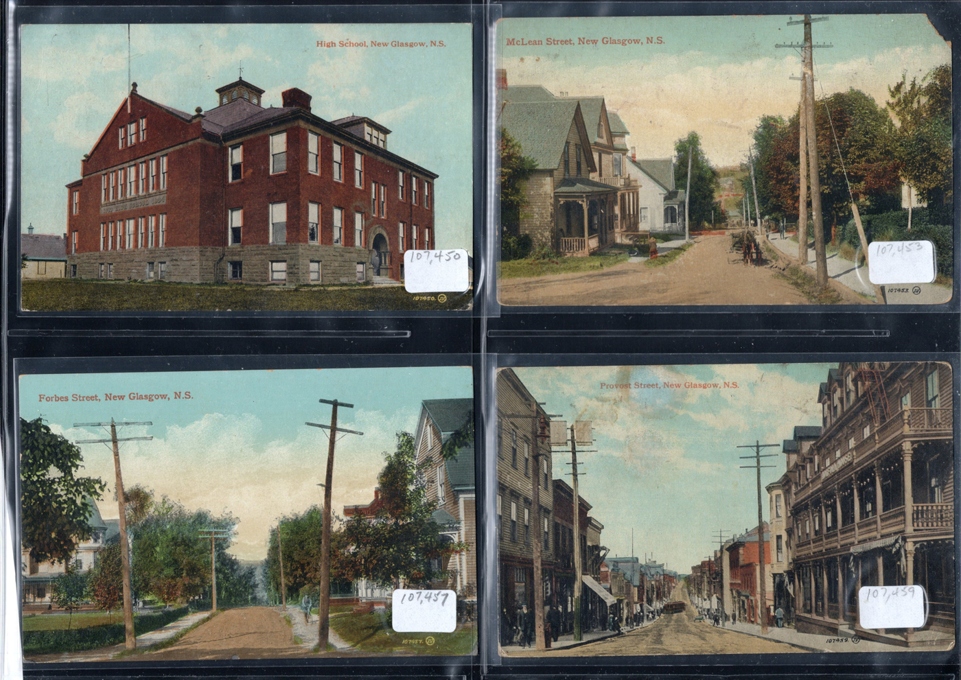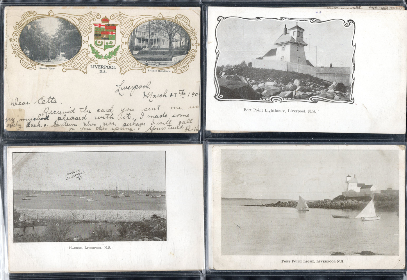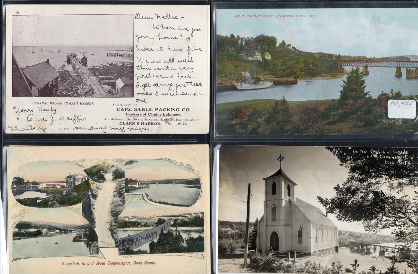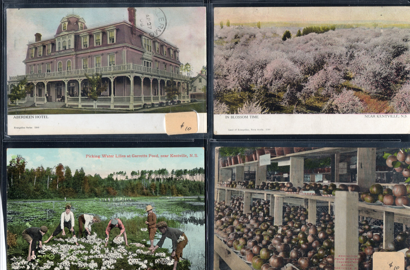 1203 PC   imageCollection of "K to M" Nova Scotia Towns Early Picture Postcards, with about 177 different mostly pre-World War II cards, sorted alphabetically by town in a postcard binder. We note a good variety of types, with real photo (many), town views, patriotic (several types, incl. series) with several scarce to rare cards. There is a mix of used and unused, so there can be postmark interest as well. Some edge, etc. faults noted, still overall fine to very fine. Photos show a good sampling. (Scan 1) (Scan 2) (Scan 3) (Scan 4) (Scan 5) (Scan 6) (Scan 7) (Scan 8) (Scan 9) (Scan 10) (Scan 11) (Scan 12) (Scan 13) (Scan 14) (Scan 15) (Scan 16) (Scan 17) (Scan 18) (Scan 19) (Scan 20) (All Scans)