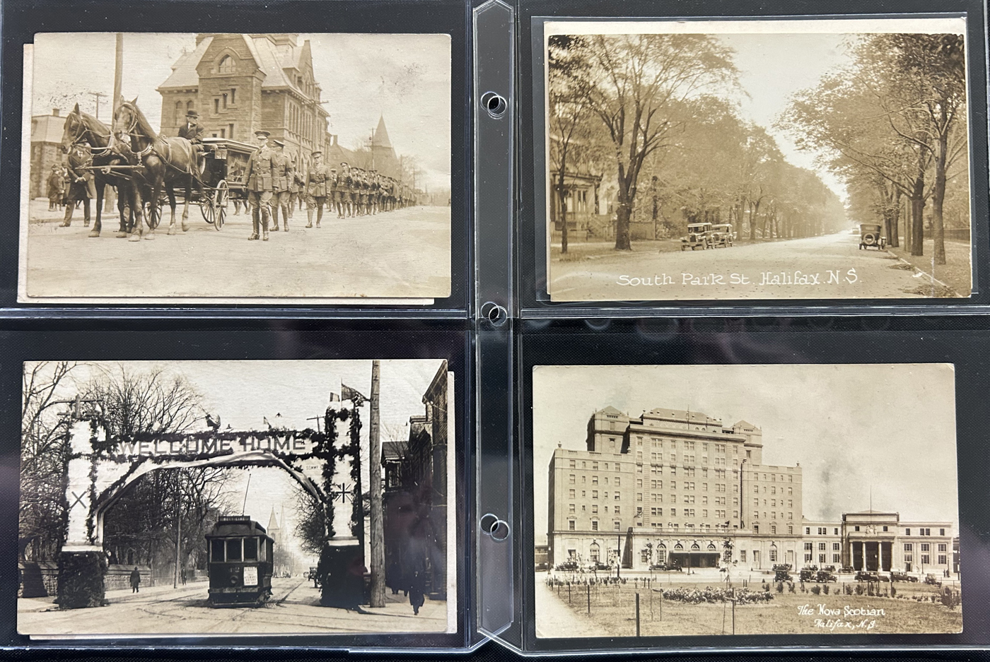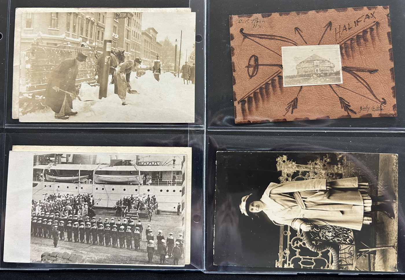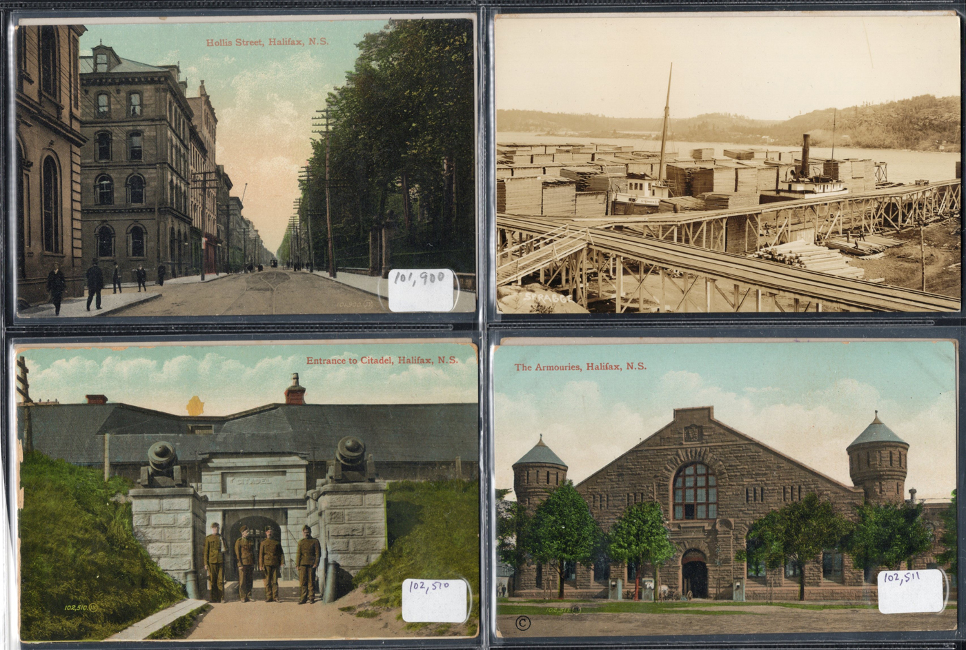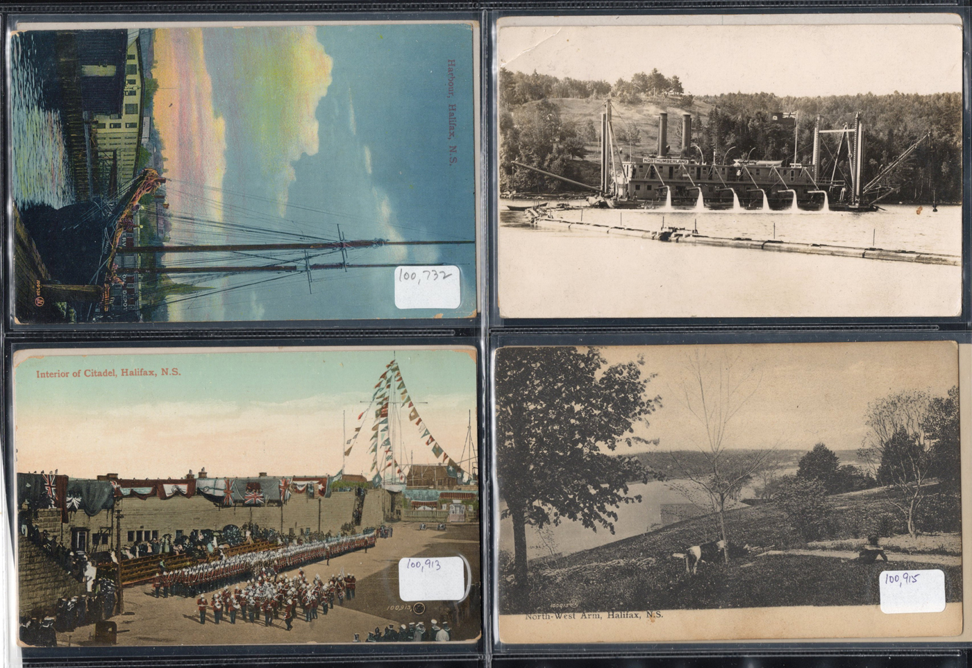 1212 PC   imageCollection of About 300 Halifax, Nova Scotia Picture Postcards, with a wide range of subjects depicted, including World War I themes (ships, soldiers, barracks, parades), patriotics, buildings, the 1917 Halifax explosion, real photos, winter scenes, and much more. Most are pre-World War II, noted a dozen or so sepia and chrome cards. We estimate over half have been mailed, so there is also postmark interest. Overall fine or better, see photos for a sampling. (Scan 1) (Scan 2) (Scan 3) (Scan 4) (Scan 5) (Scan 6) (Scan 7) (Scan 8) (All Scans)