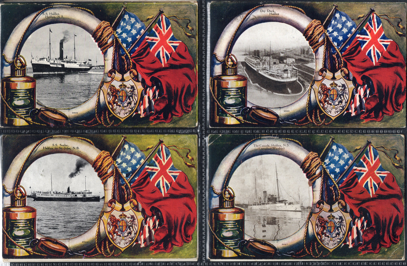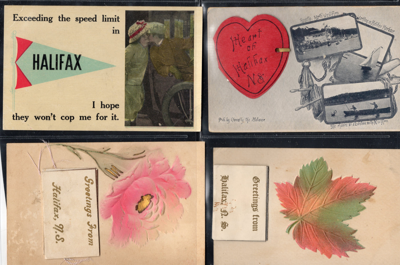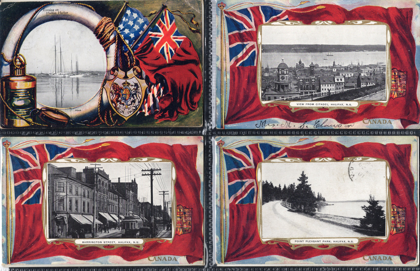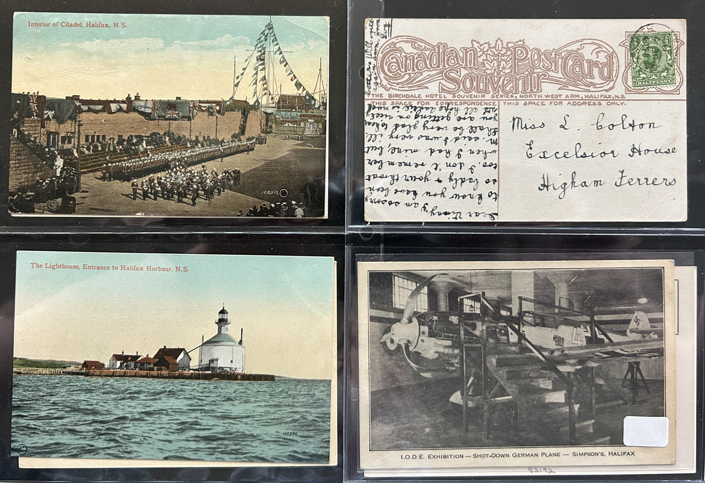 1212 PC   imageCollection of About 300 Halifax, Nova Scotia Picture Postcards, with a wide range of subjects depicted, including World War I themes (ships, soldiers, barracks, parades), patriotics, buildings, the 1917 Halifax explosion, real photos, winter scenes, and much more. Most are pre-World War II, noted a dozen or so sepia and chrome cards. We estimate over half have been mailed, so there is also postmark interest. Overall fine or better, see photos for a sampling. (Scan 1) (Scan 2) (Scan 3) (Scan 4) (Scan 5) (Scan 6) (Scan 7) (Scan 8) (All Scans)