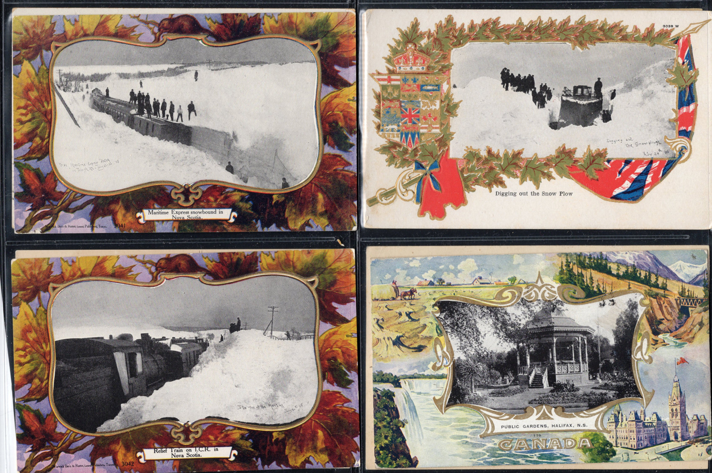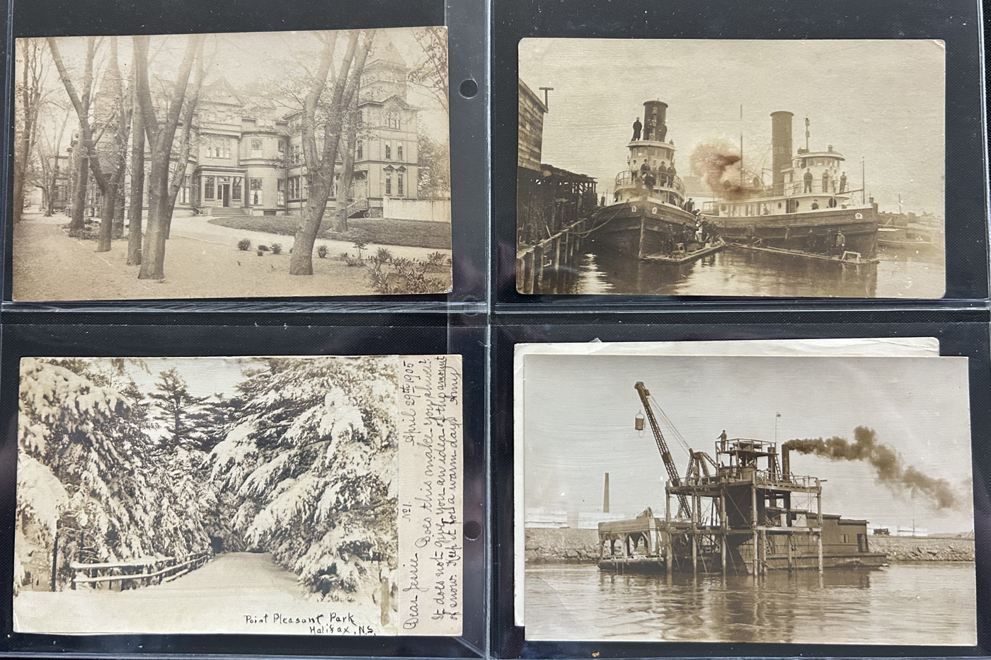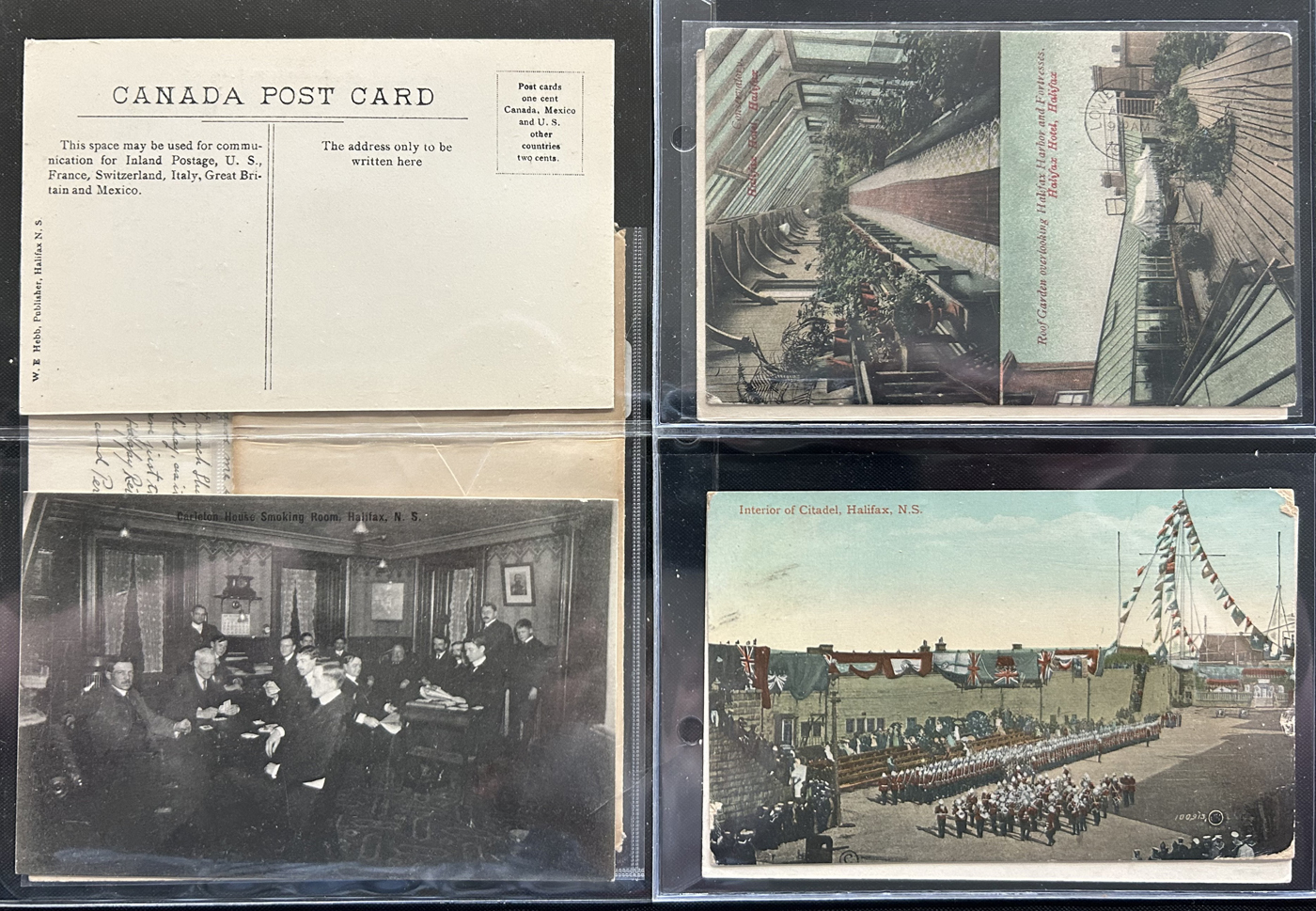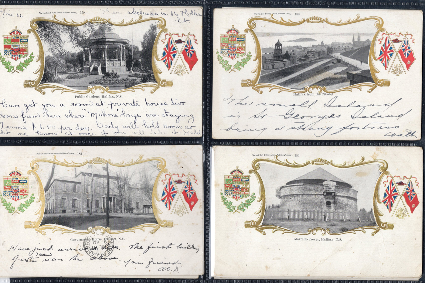 1212 PC   imageCollection of About 300 Halifax, Nova Scotia Picture Postcards, with a wide range of subjects depicted, including World War I themes (ships, soldiers, barracks, parades), patriotics, buildings, the 1917 Halifax explosion, real photos, winter scenes, and much more. Most are pre-World War II, noted a dozen or so sepia and chrome cards. We estimate over half have been mailed, so there is also postmark interest. Overall fine or better, see photos for a sampling. (Scan 1) (Scan 2) (Scan 3) (Scan 4) (Scan 5) (Scan 6) (Scan 7) (Scan 8) (All Scans)