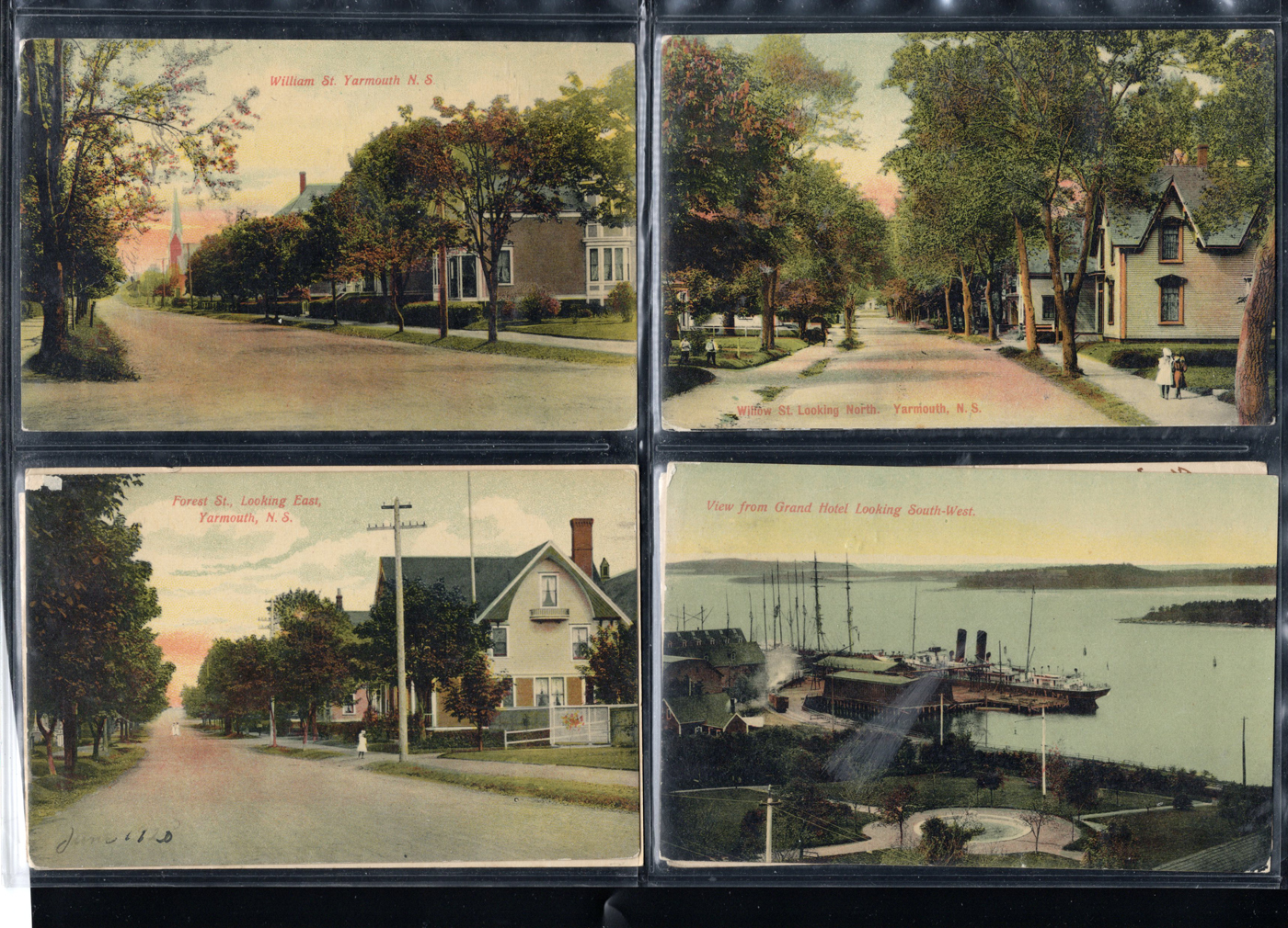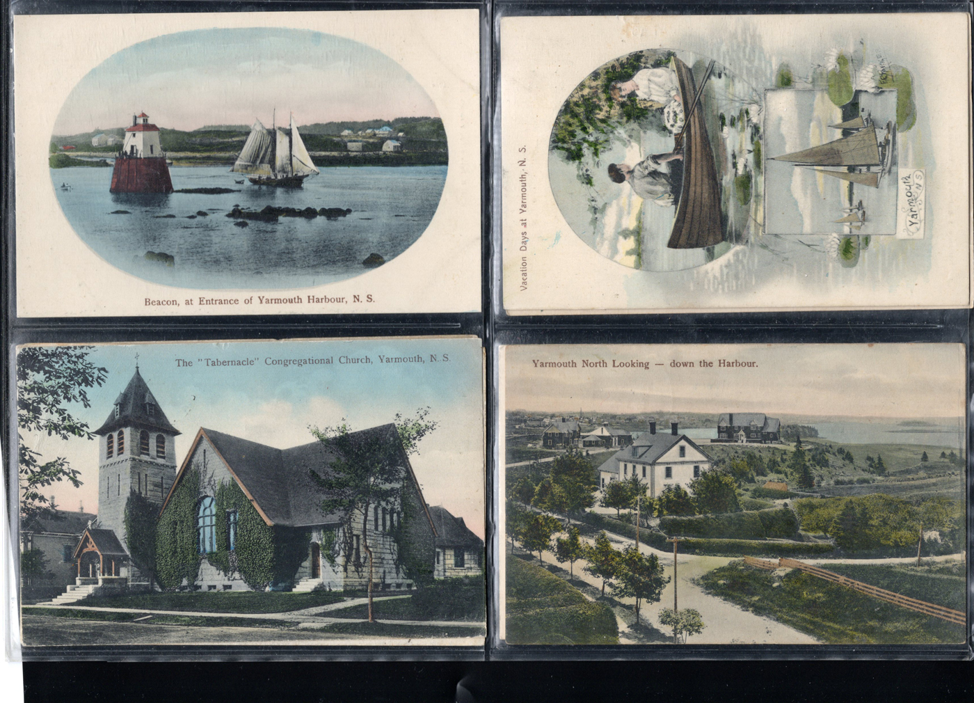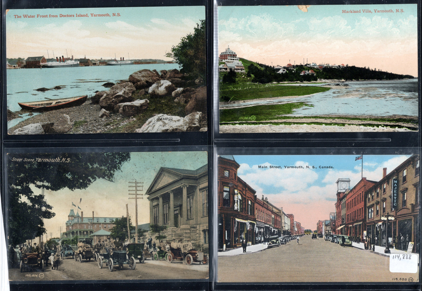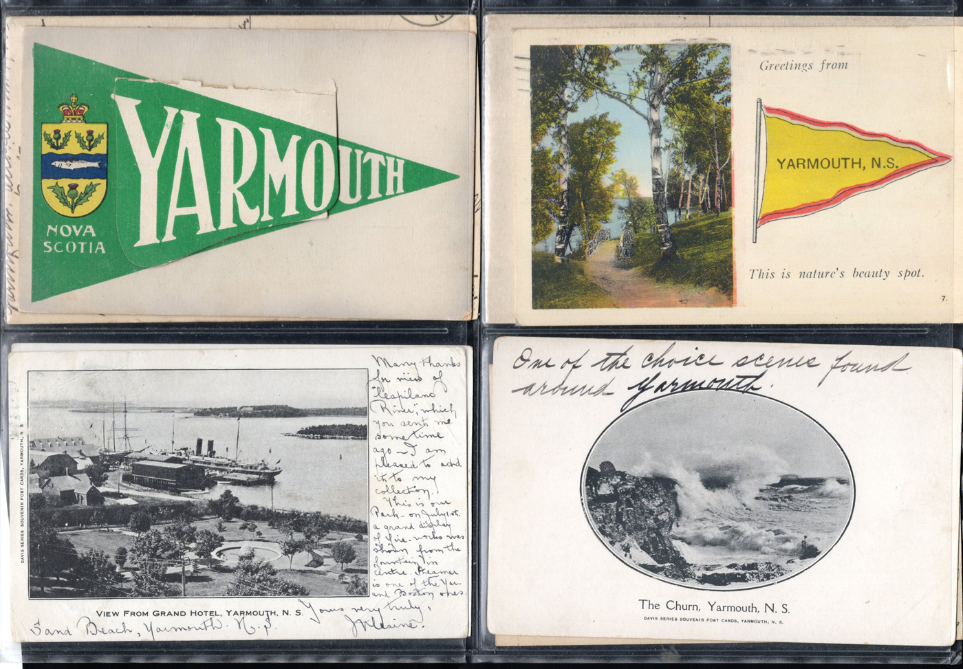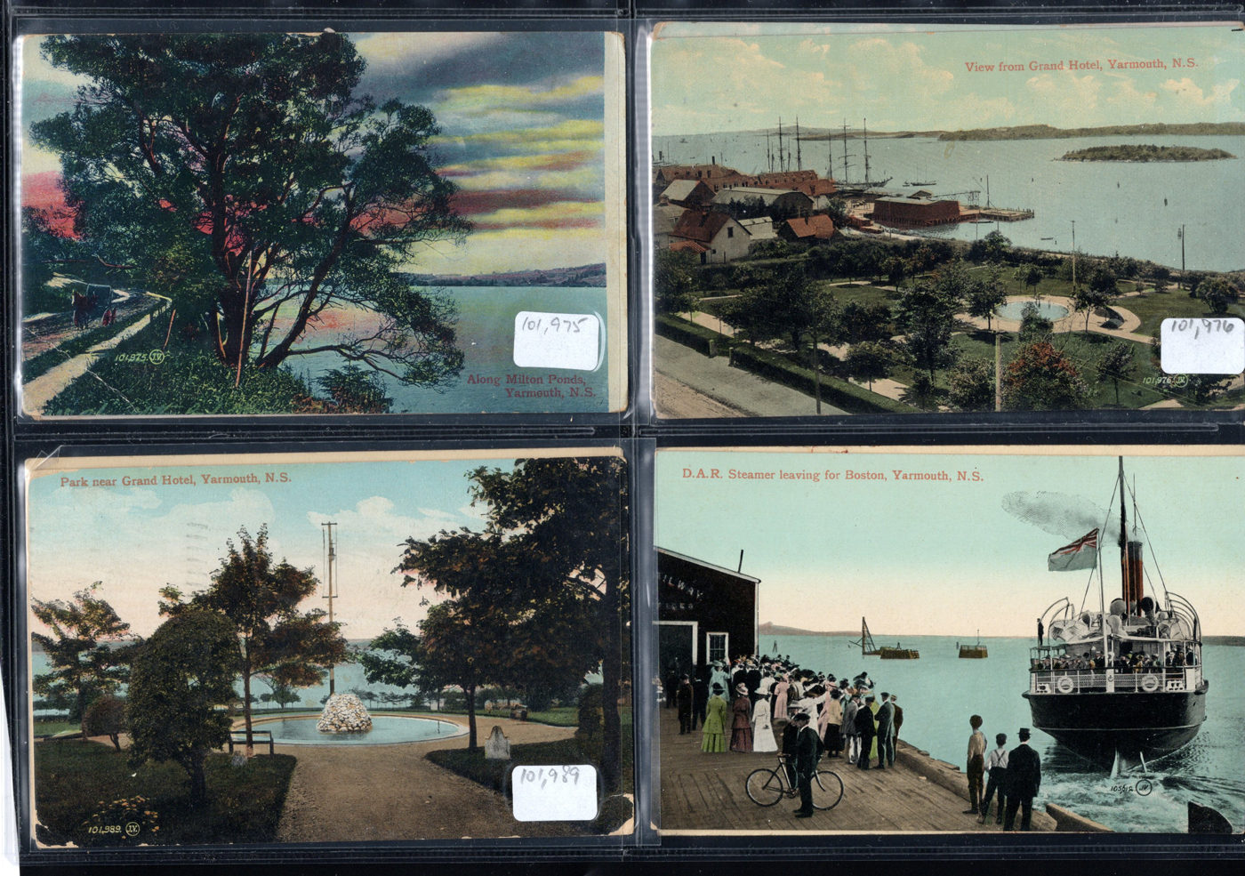 1207 PC   imageCollection of Yarmouth, Nova Scotia Towns Early Picture Postcards, with about 118 different mostly pre-World War II cards, sorted alphabetically by town in a postcard binder. We note a good variety of types, with real photo (many), town views, patriotic (several types, incl. series) with several scarce to rare cards. There is a mix of used and unused, so there can be postmark interest as well. Some edge, etc. faults noted, still overall fine to very fine. Photos show a good sampling. (Scan 1) (Scan 2) (Scan 3) (Scan 4) (Scan 5) (Scan 6) (Scan 7) (Scan 8) (Scan 9) (Scan 10) (Scan 11) (Scan 12) (Scan 13) (Scan 14) (Scan 15) (Scan 16) (Scan 17) (All Scans)