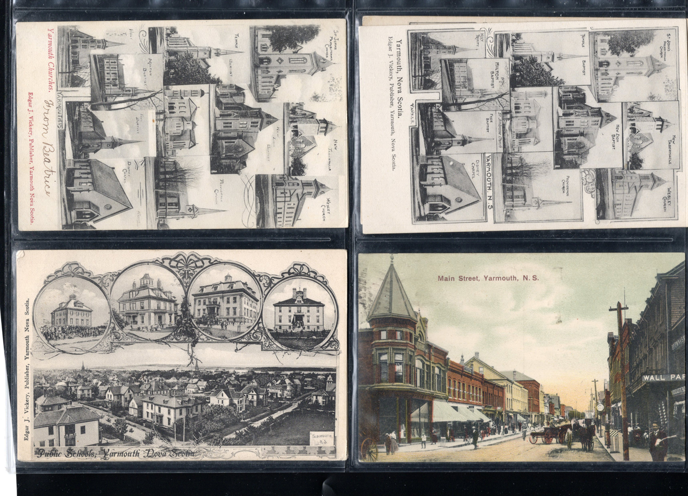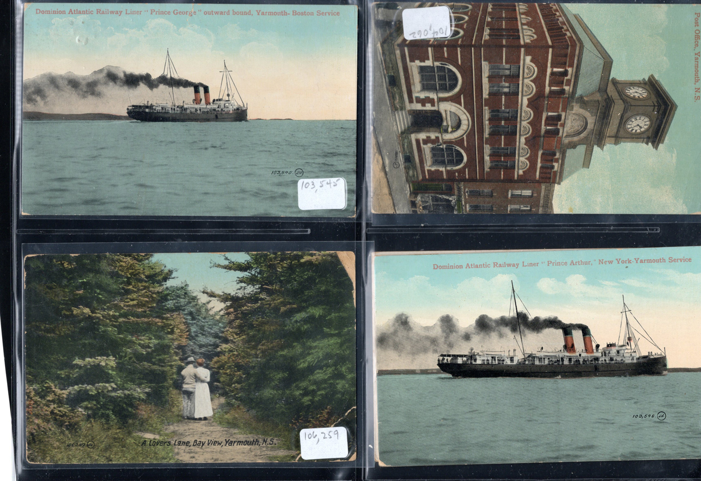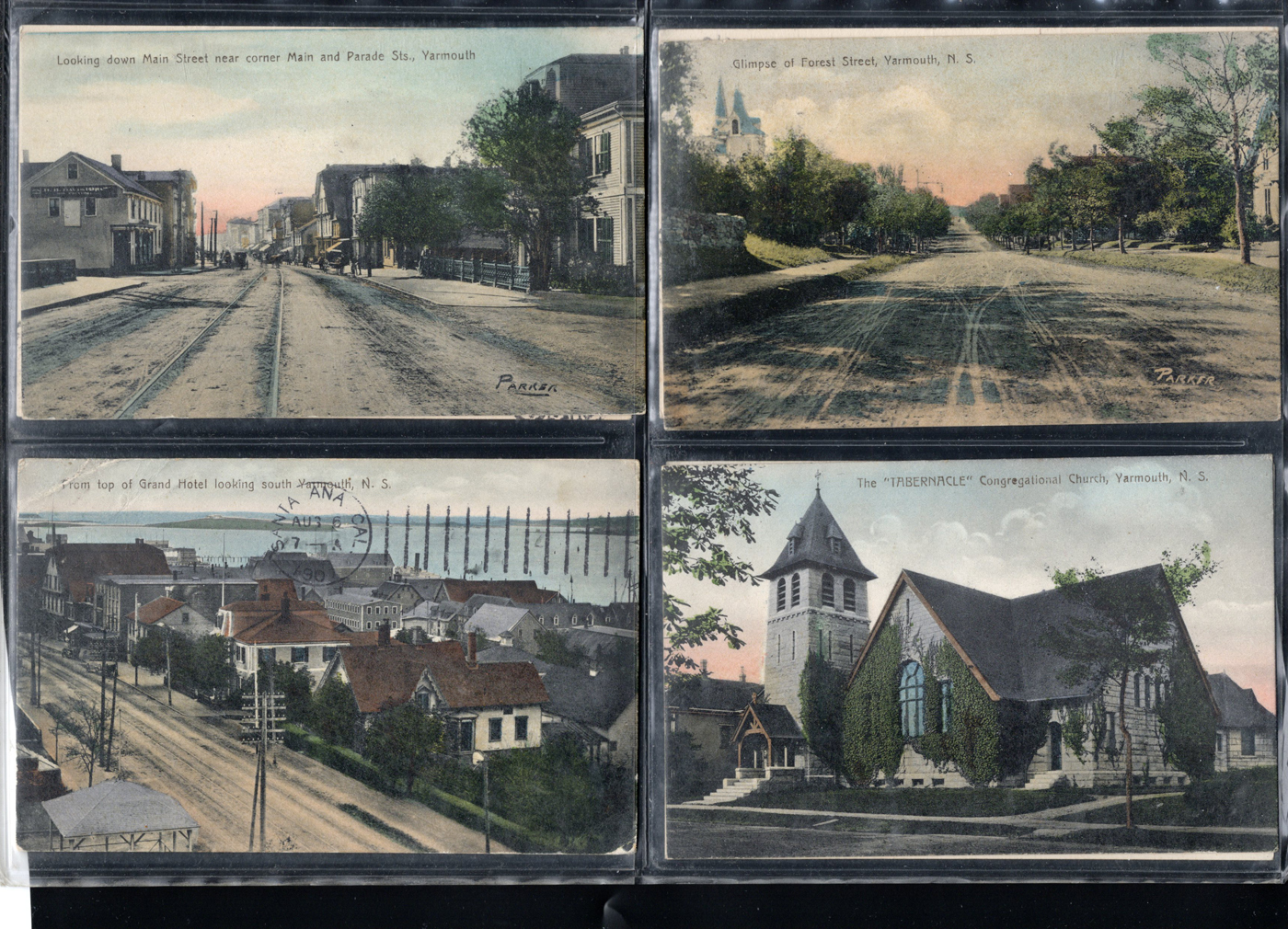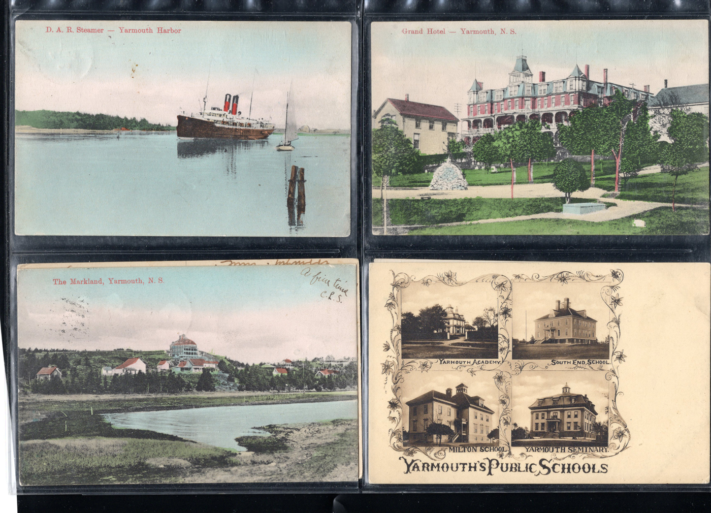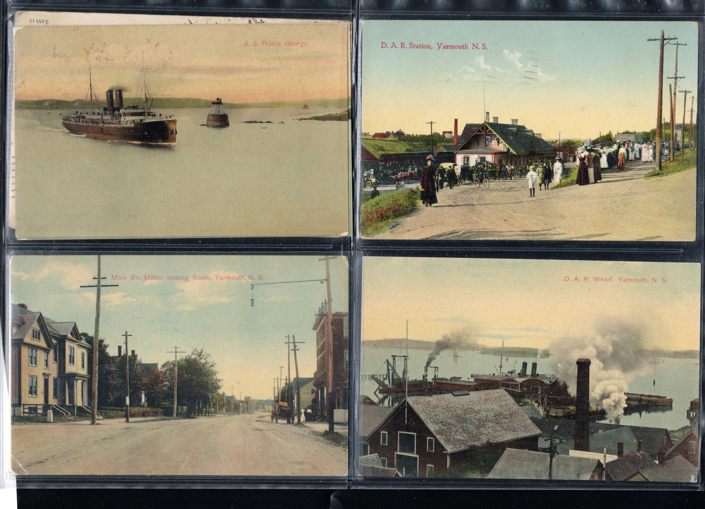 1207 PC   imageCollection of Yarmouth, Nova Scotia Towns Early Picture Postcards, with about 118 different mostly pre-World War II cards, sorted alphabetically by town in a postcard binder. We note a good variety of types, with real photo (many), town views, patriotic (several types, incl. series) with several scarce to rare cards. There is a mix of used and unused, so there can be postmark interest as well. Some edge, etc. faults noted, still overall fine to very fine. Photos show a good sampling. (Scan 1) (Scan 2) (Scan 3) (Scan 4) (Scan 5) (Scan 6) (Scan 7) (Scan 8) (Scan 9) (Scan 10) (Scan 11) (Scan 12) (Scan 13) (Scan 14) (Scan 15) (Scan 16) (Scan 17) (All Scans)