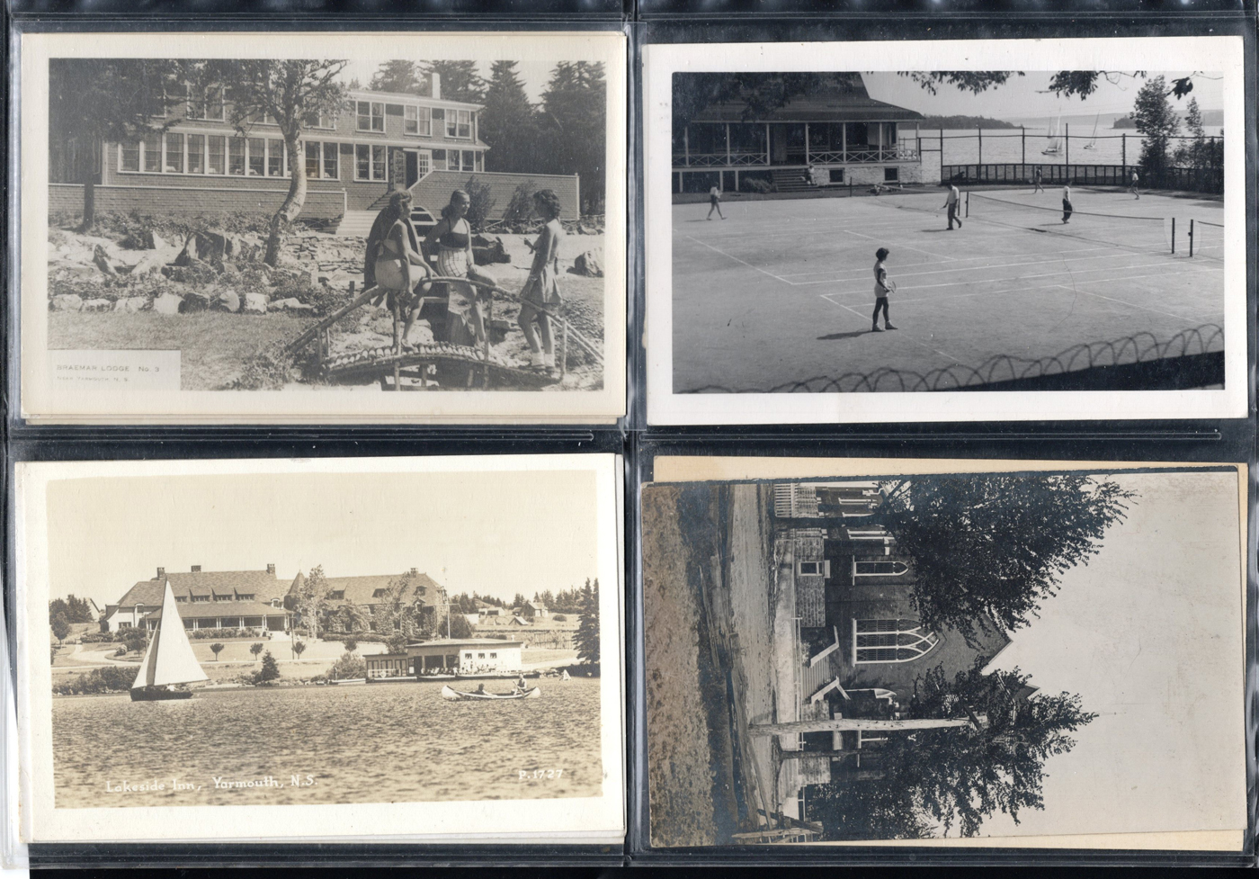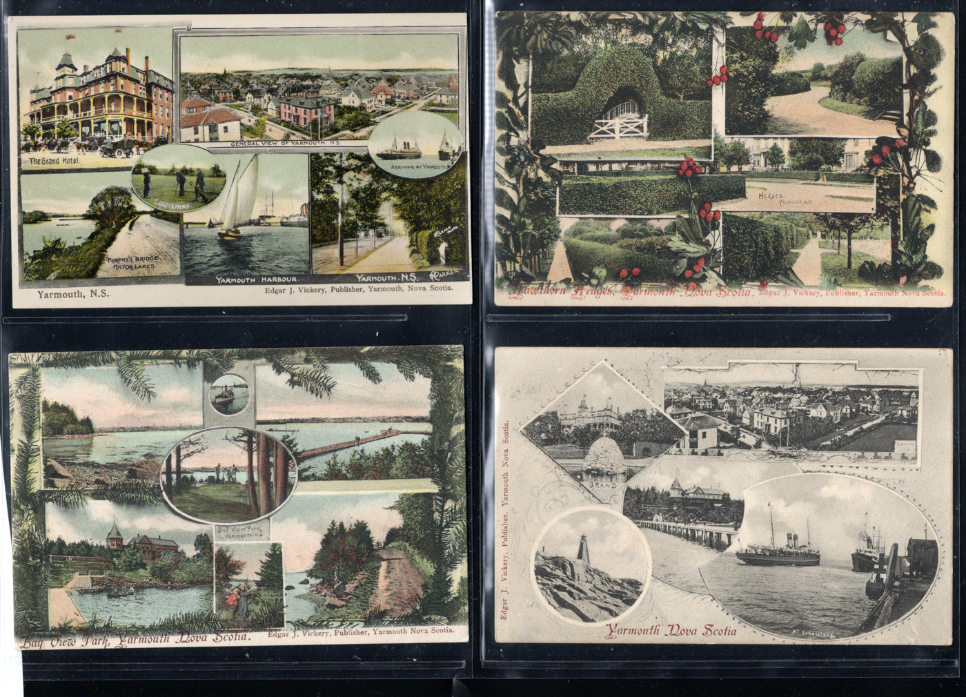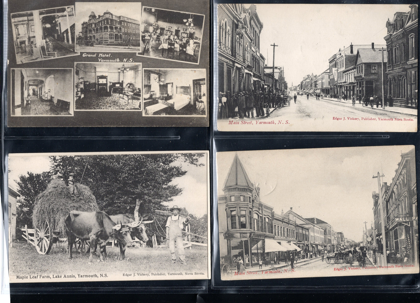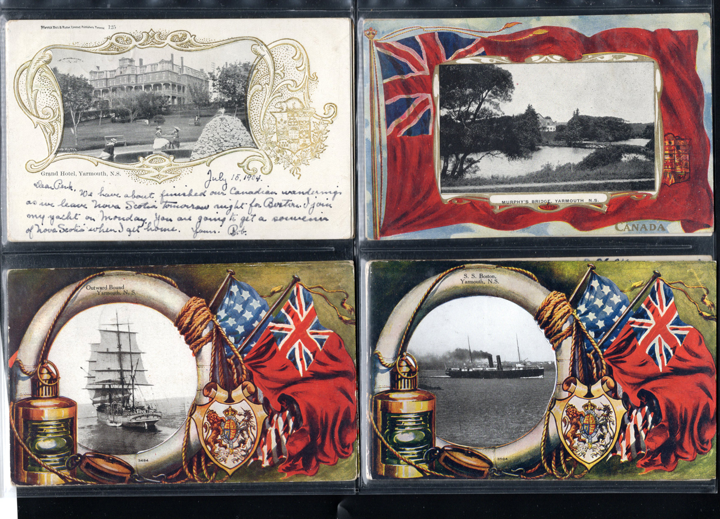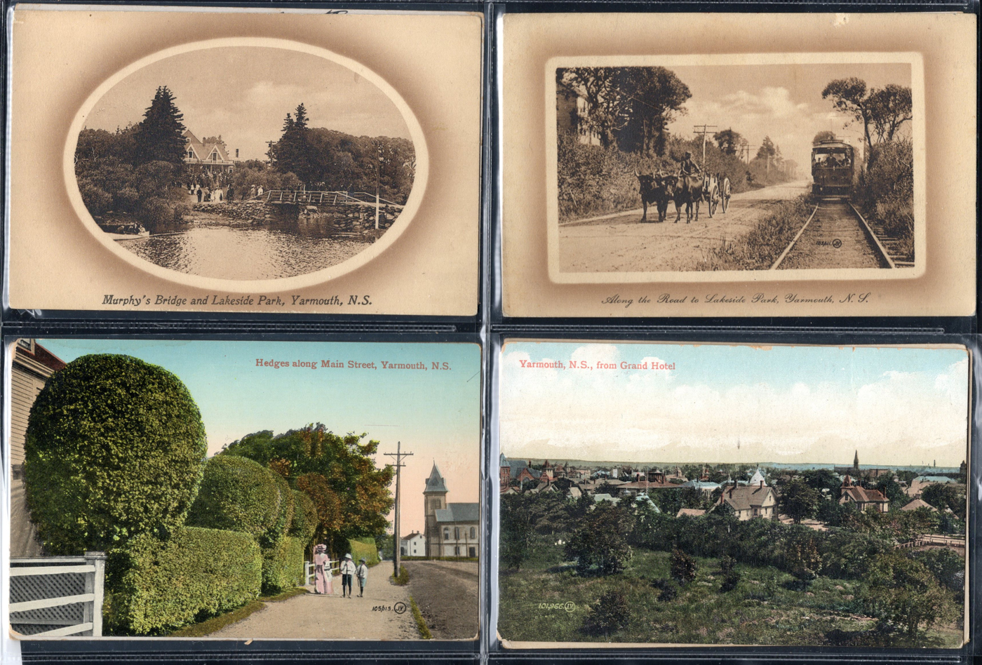 1207 PC   imageCollection of Yarmouth, Nova Scotia Towns Early Picture Postcards, with about 118 different mostly pre-World War II cards, sorted alphabetically by town in a postcard binder. We note a good variety of types, with real photo (many), town views, patriotic (several types, incl. series) with several scarce to rare cards. There is a mix of used and unused, so there can be postmark interest as well. Some edge, etc. faults noted, still overall fine to very fine. Photos show a good sampling. (Scan 1) (Scan 2) (Scan 3) (Scan 4) (Scan 5) (Scan 6) (Scan 7) (Scan 8) (Scan 9) (Scan 10) (Scan 11) (Scan 12) (Scan 13) (Scan 14) (Scan 15) (Scan 16) (Scan 17) (All Scans)