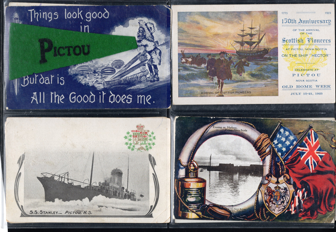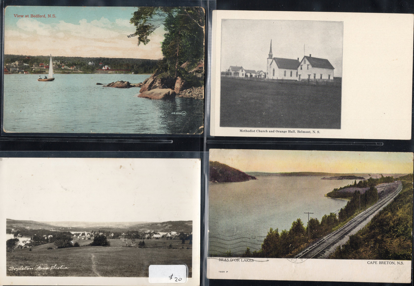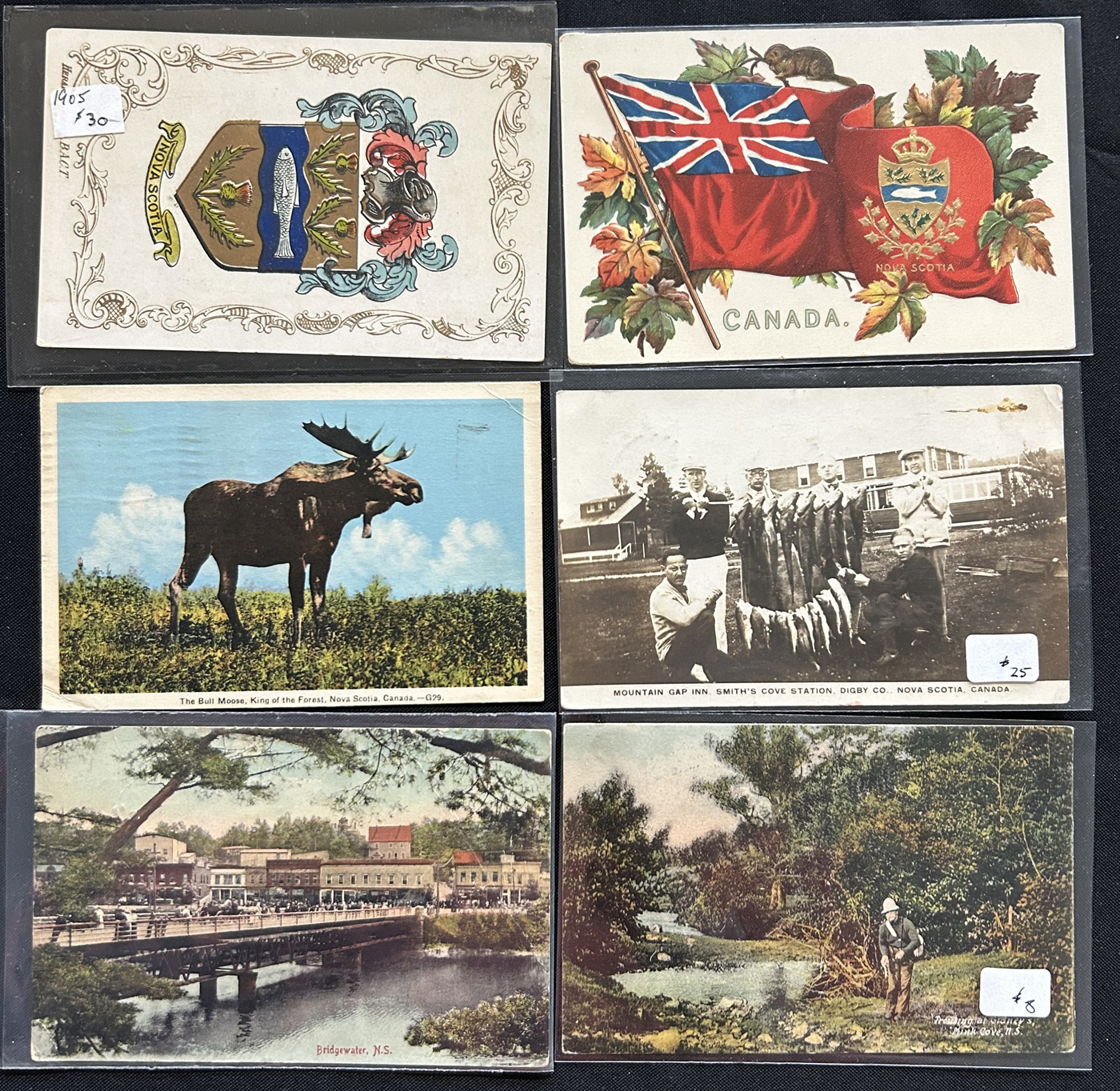 1216 PC   imageGroup of 45 Better Early Nova Scotia Picture Postcards, many are sleeved and still priced at between $8 and $20 (most are $15). We note patriotic cards for the province or for towns, several real photos, town views and more. About a dozen of the cards are used, all cards pictured online. Overall fine to very fine. (Scan 1) (Scan 2) (Scan 3) (Scan 4) (Scan 5) (Scan 6) (Scan 7) (All Scans)