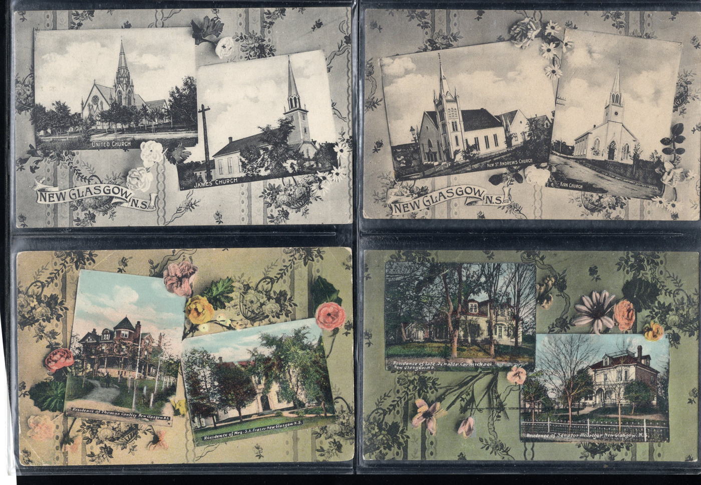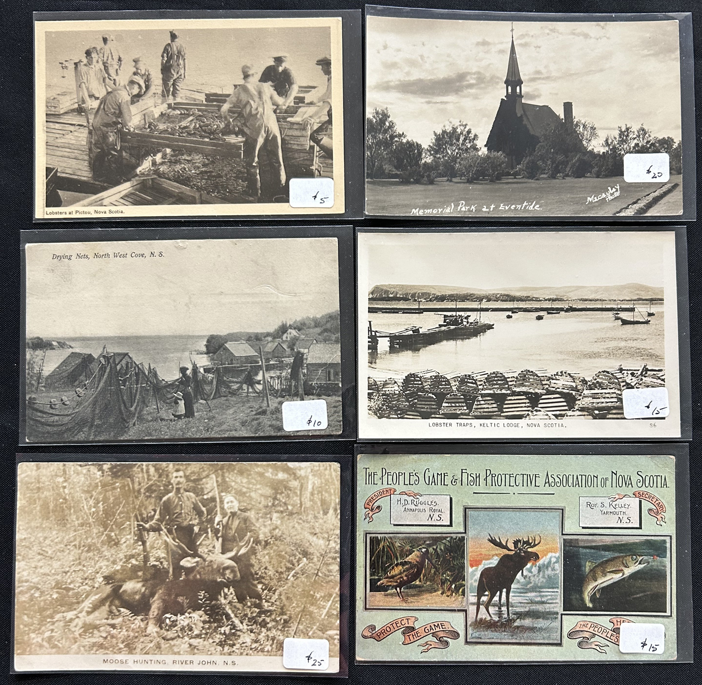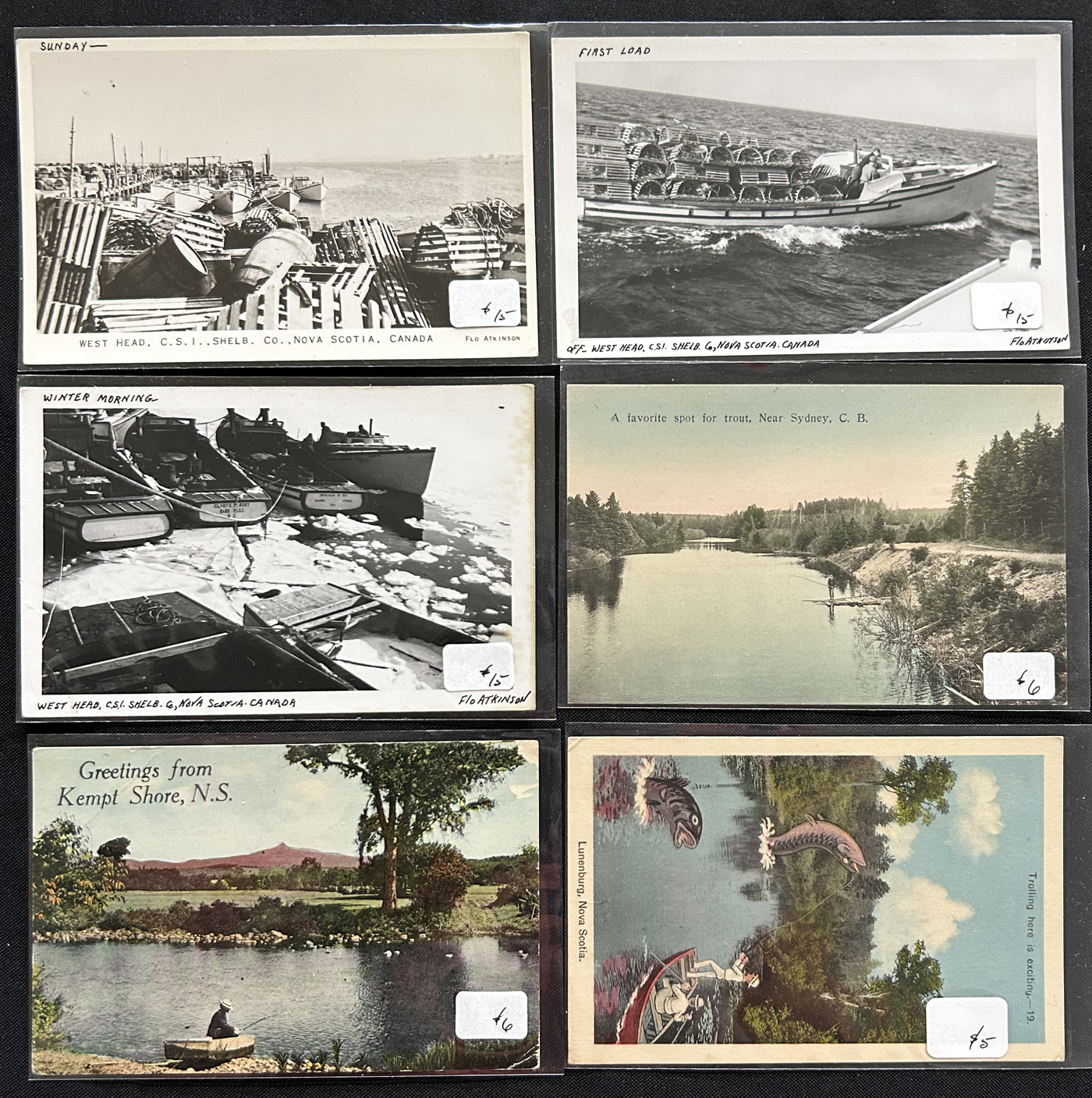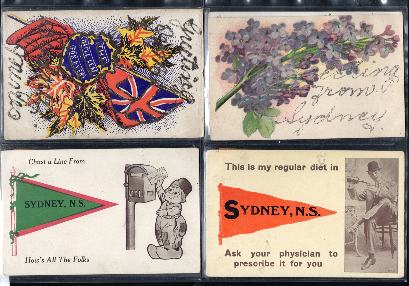 1216 PC   imageGroup of 45 Better Early Nova Scotia Picture Postcards, many are sleeved and still priced at between $8 and $20 (most are $15). We note patriotic cards for the province or for towns, several real photos, town views and more. About a dozen of the cards are used, all cards pictured online. Overall fine to very fine. (Scan 1) (Scan 2) (Scan 3) (Scan 4) (Scan 5) (Scan 6) (Scan 7) (All Scans)