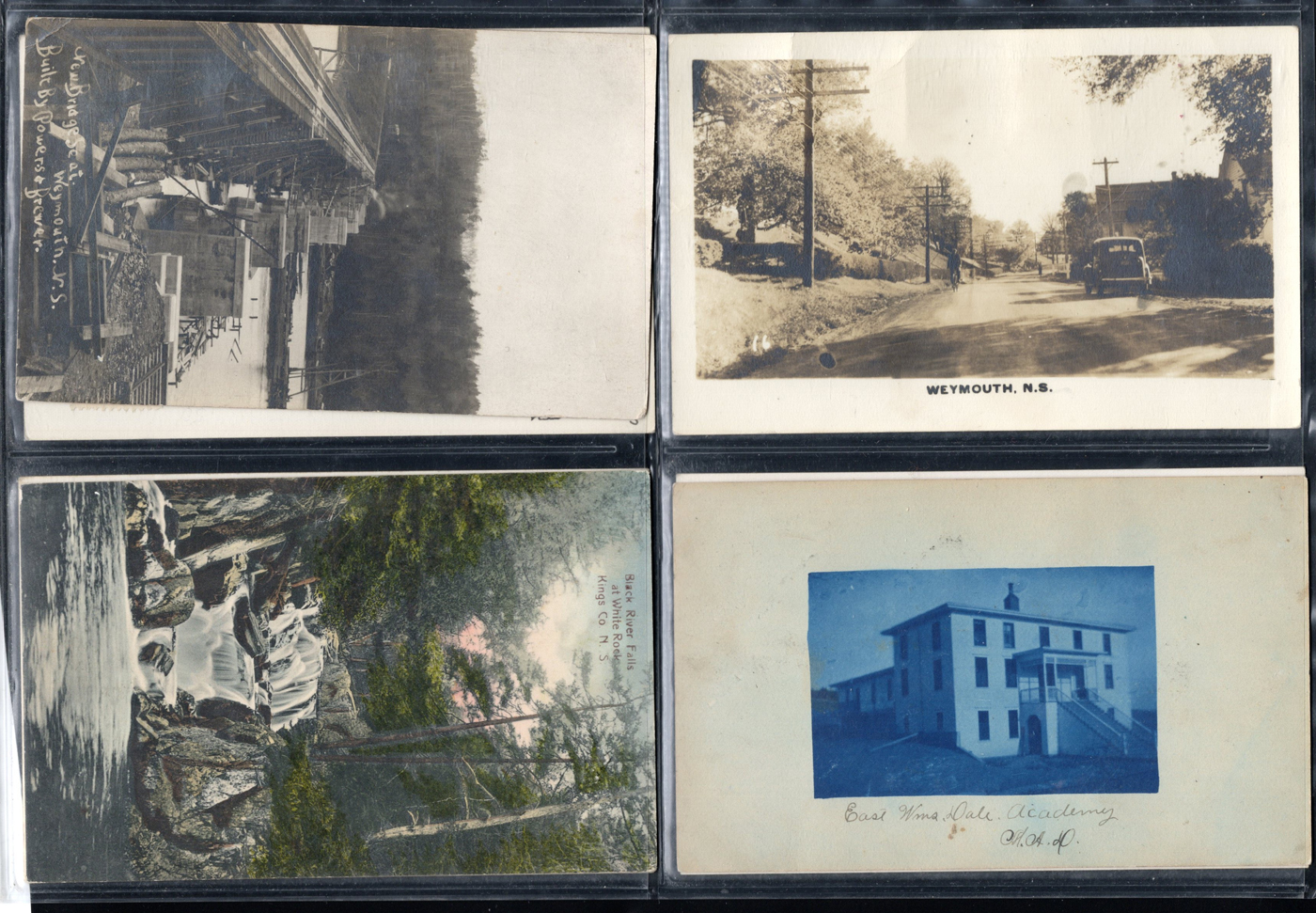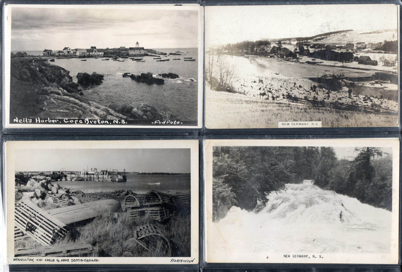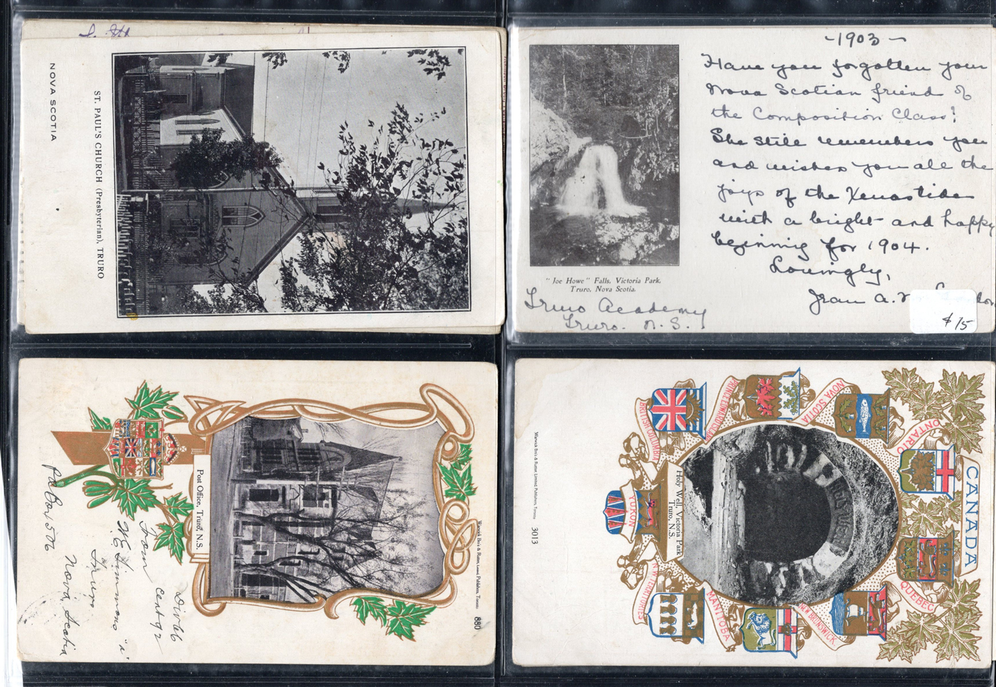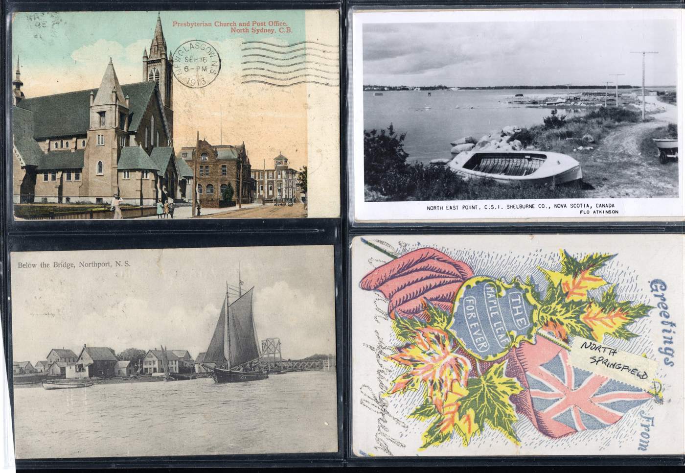 1204 PC   imageCollection of "N to P" Nova Scotia Towns Early Picture Postcards, with about 195 different mostly pre-World War II cards, sorted alphabetically by town in a postcard binder. We note a good variety of types, with real photo (many), town views, patriotic (several types, incl. series) with several scarce to rare cards. There is a mix of used and unused, so there can be postmark interest as well. Some edge, etc. faults noted, still overall fine to very fine. Photos show a good sampling. (Scan 1) (Scan 2) (Scan 3) (Scan 4) (Scan 5) (Scan 6) (Scan 7) (Scan 8) (Scan 9) (Scan 10) (Scan 11) (Scan 12) (Scan 13) (Scan 14) (Scan 15) (Scan 16) (Scan 17) (Scan 18) (Scan 19) (Scan 20) (Scan 21) (Scan 22) (Scan 23) (Scan 24) (Scan 25) (All Scans)