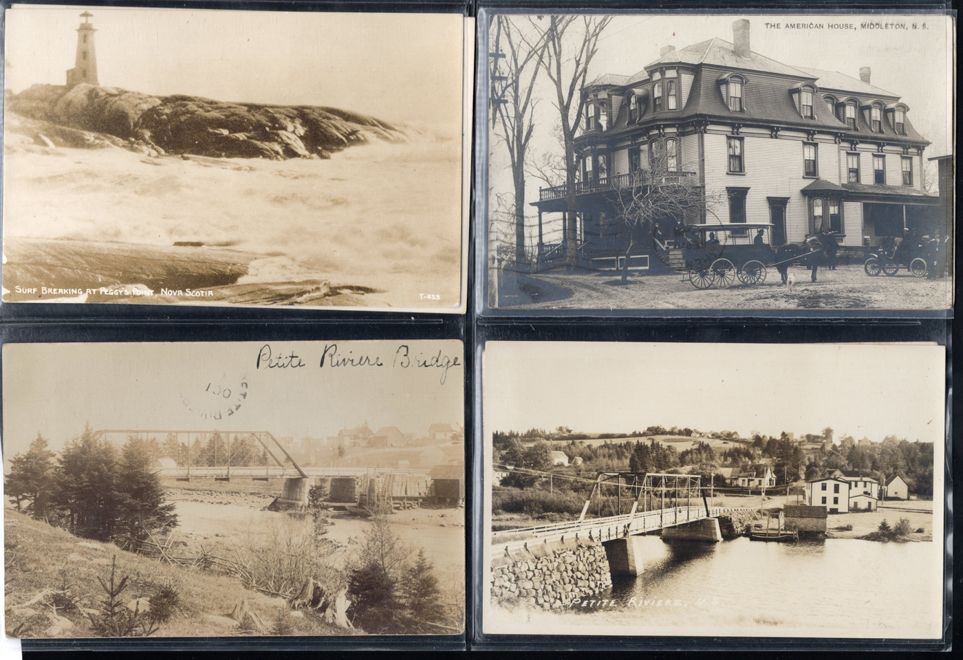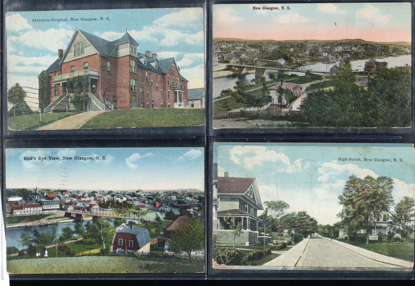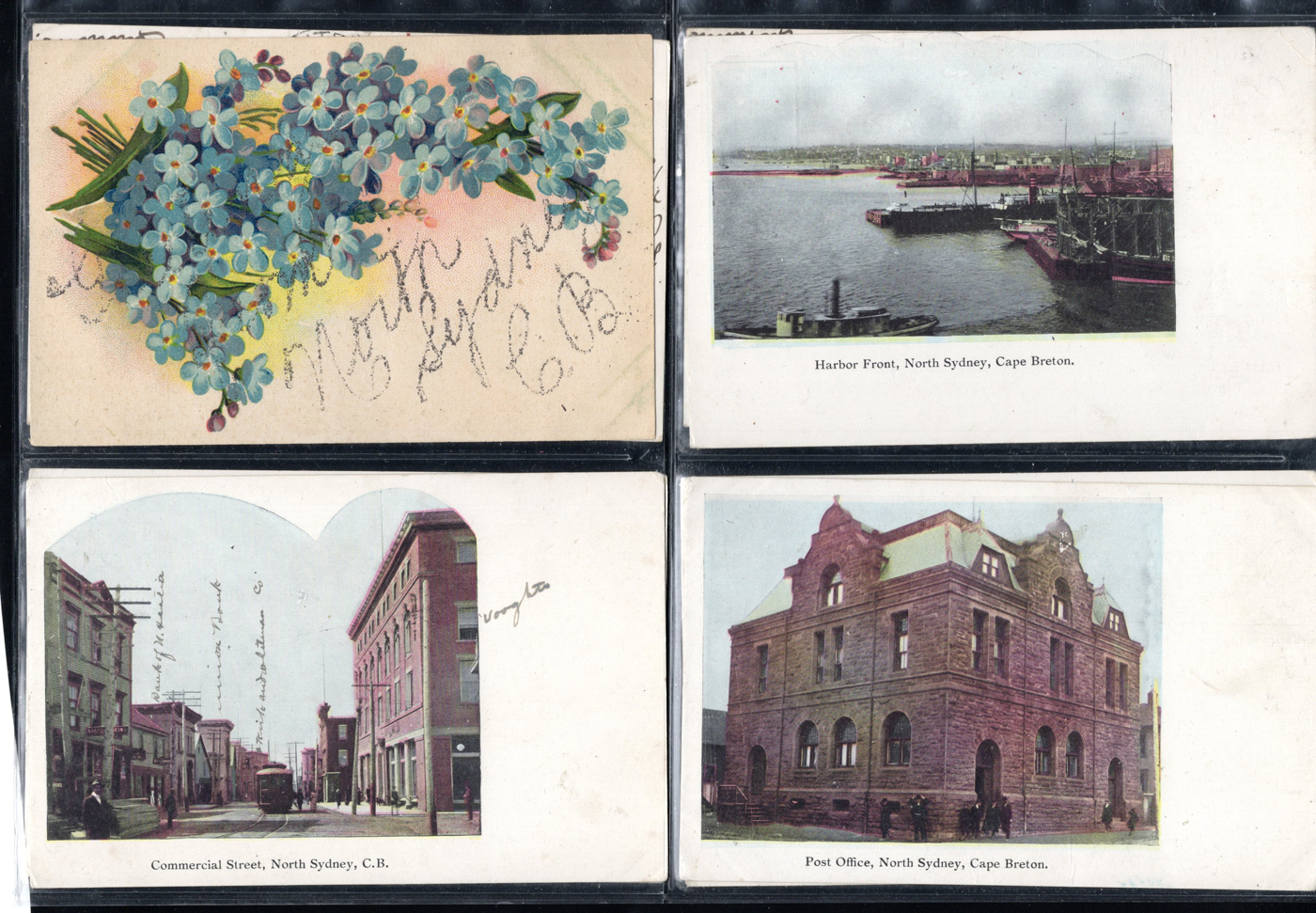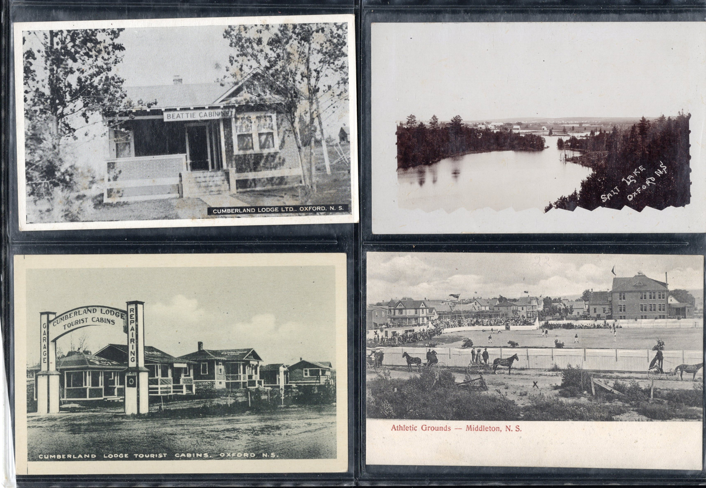 1204 PC   imageCollection of "N to P" Nova Scotia Towns Early Picture Postcards, with about 195 different mostly pre-World War II cards, sorted alphabetically by town in a postcard binder. We note a good variety of types, with real photo (many), town views, patriotic (several types, incl. series) with several scarce to rare cards. There is a mix of used and unused, so there can be postmark interest as well. Some edge, etc. faults noted, still overall fine to very fine. Photos show a good sampling. (Scan 1) (Scan 2) (Scan 3) (Scan 4) (Scan 5) (Scan 6) (Scan 7) (Scan 8) (Scan 9) (Scan 10) (Scan 11) (Scan 12) (Scan 13) (Scan 14) (Scan 15) (Scan 16) (Scan 17) (Scan 18) (Scan 19) (Scan 20) (Scan 21) (Scan 22) (Scan 23) (Scan 24) (Scan 25) (All Scans)