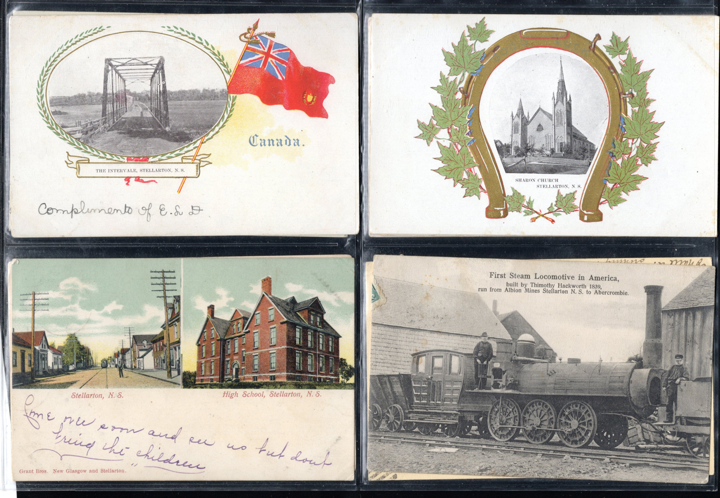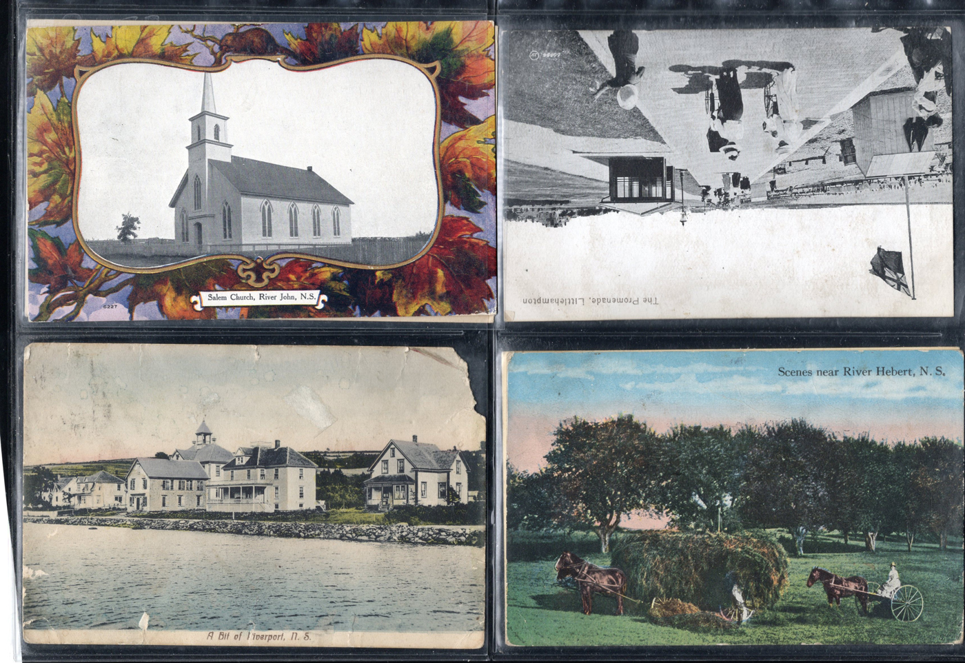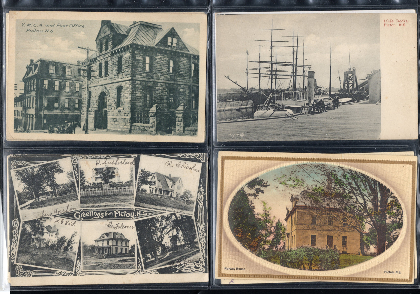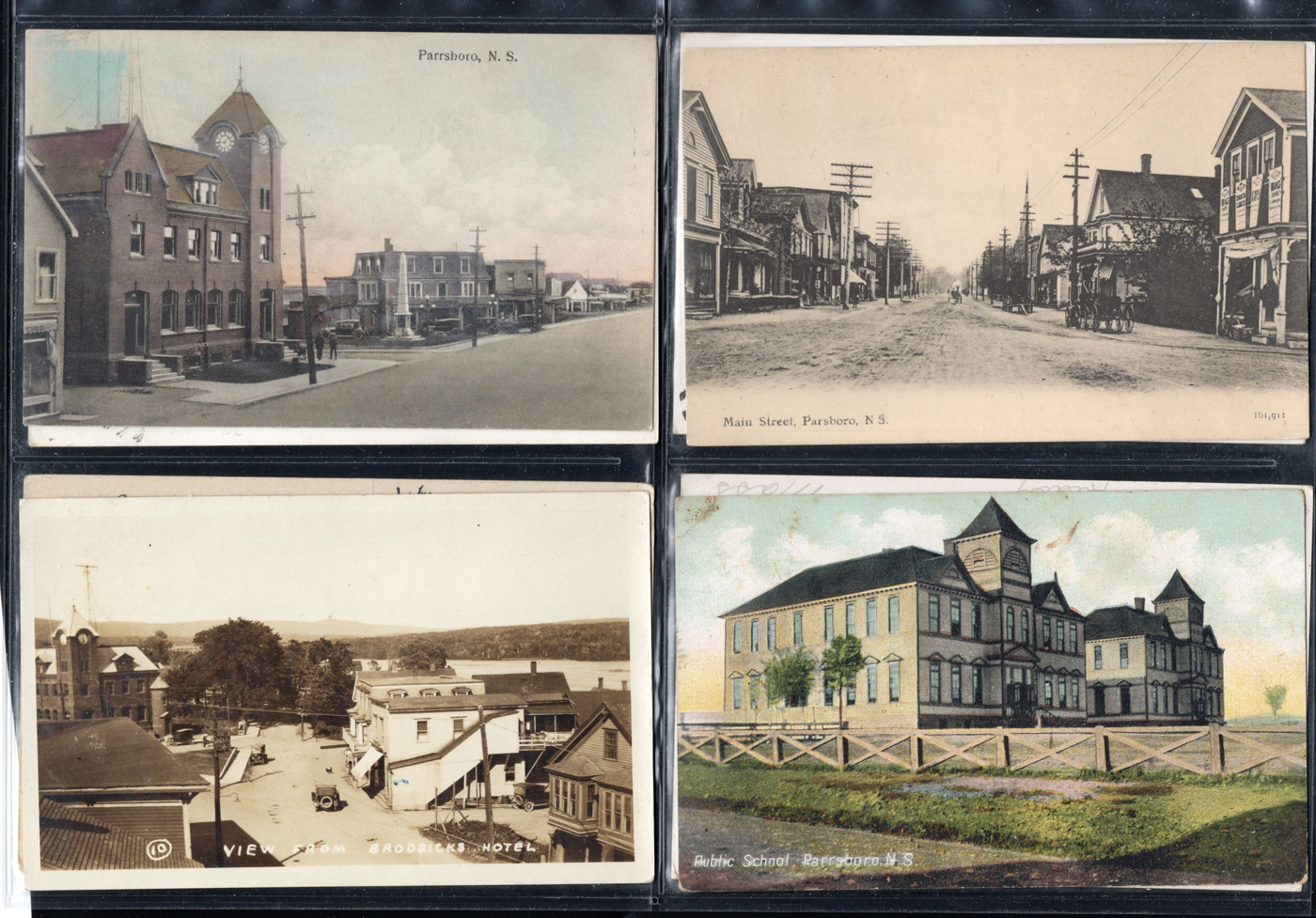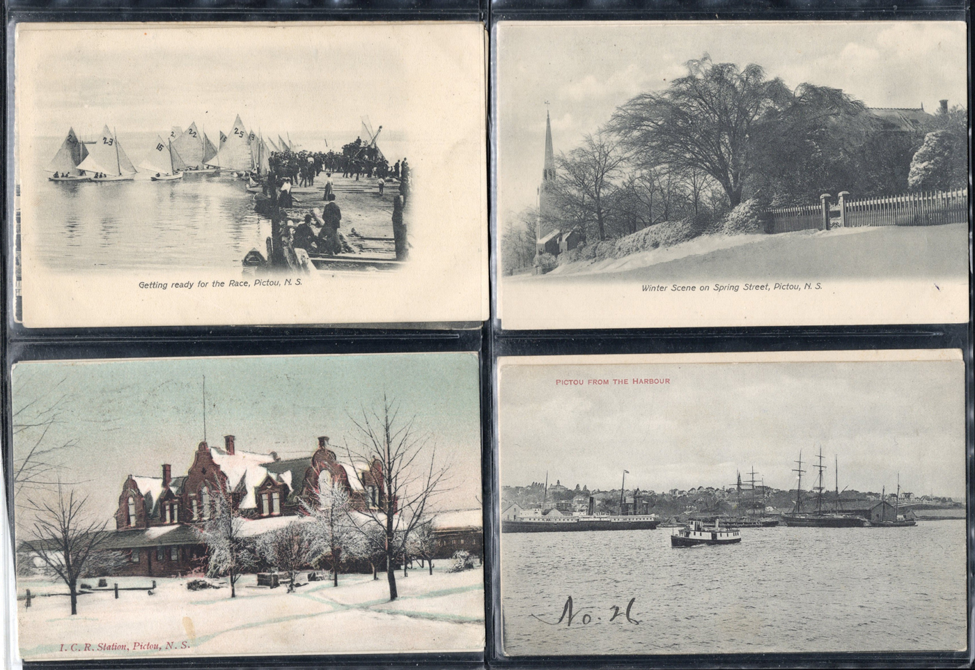 1204 PC   imageCollection of "N to P" Nova Scotia Towns Early Picture Postcards, with about 195 different mostly pre-World War II cards, sorted alphabetically by town in a postcard binder. We note a good variety of types, with real photo (many), town views, patriotic (several types, incl. series) with several scarce to rare cards. There is a mix of used and unused, so there can be postmark interest as well. Some edge, etc. faults noted, still overall fine to very fine. Photos show a good sampling. (Scan 1) (Scan 2) (Scan 3) (Scan 4) (Scan 5) (Scan 6) (Scan 7) (Scan 8) (Scan 9) (Scan 10) (Scan 11) (Scan 12) (Scan 13) (Scan 14) (Scan 15) (Scan 16) (Scan 17) (Scan 18) (Scan 19) (Scan 20) (Scan 21) (Scan 22) (Scan 23) (Scan 24) (Scan 25) (All Scans)