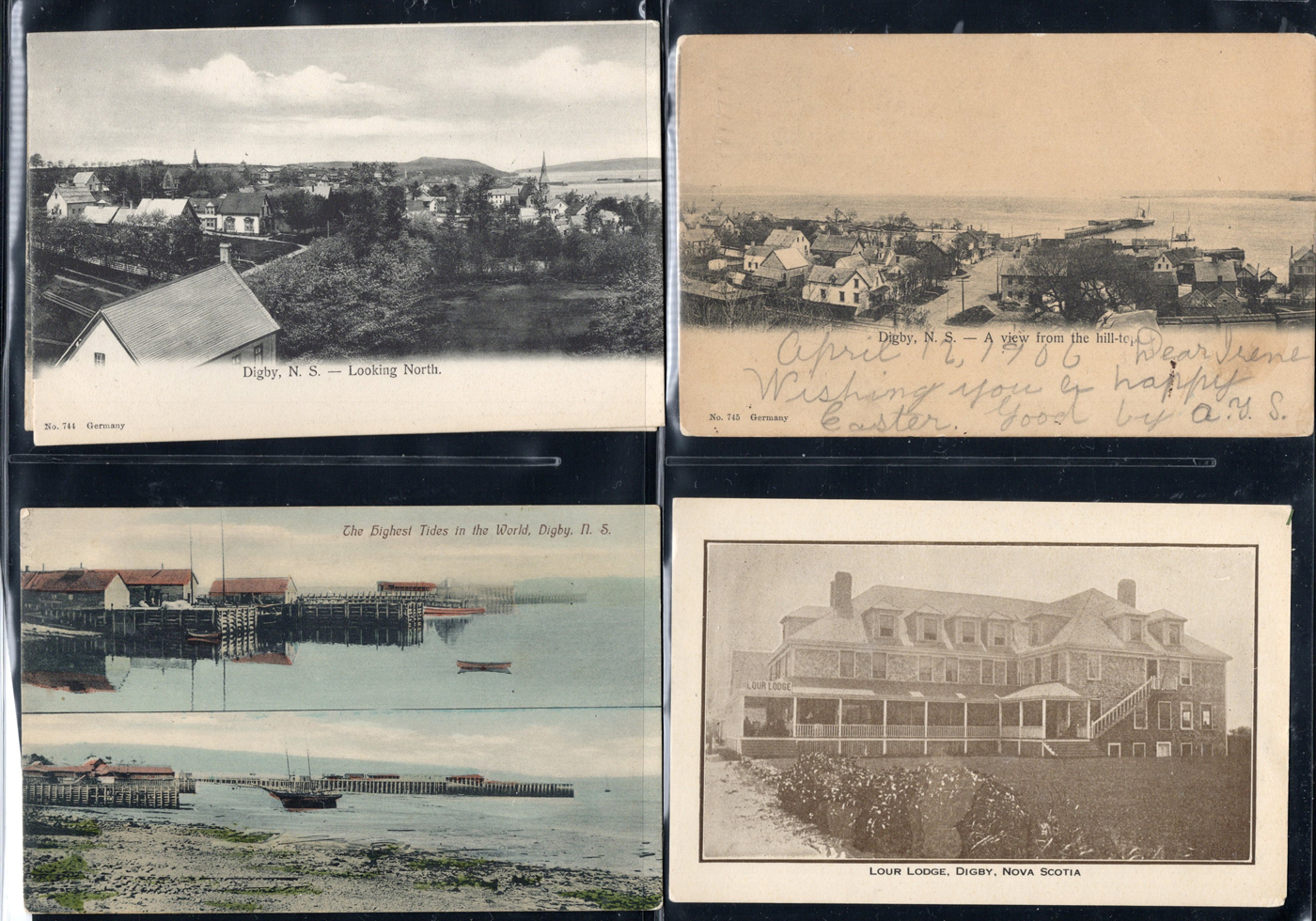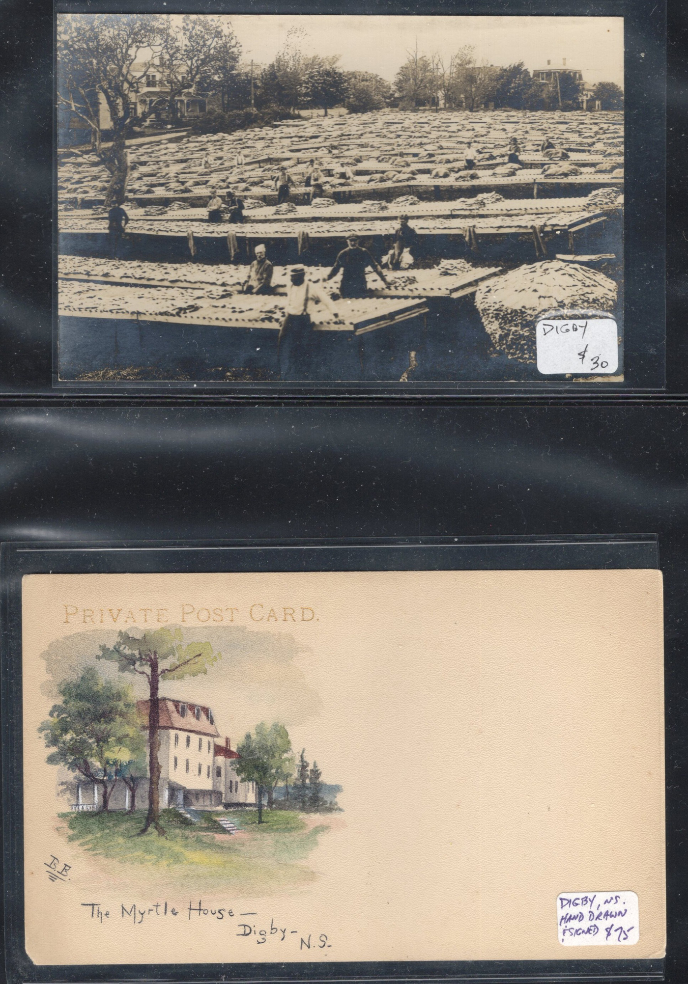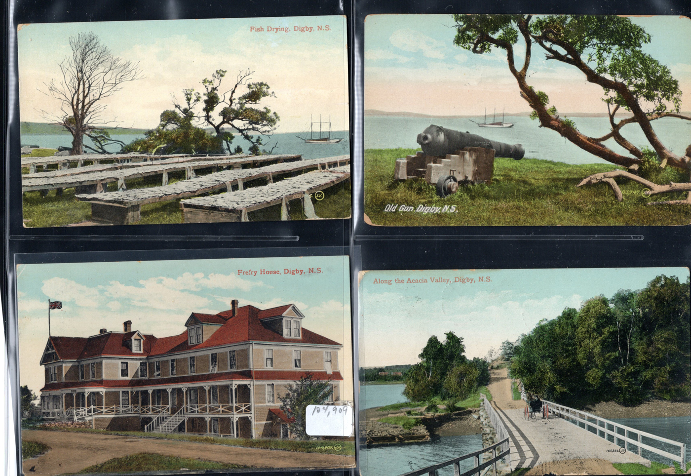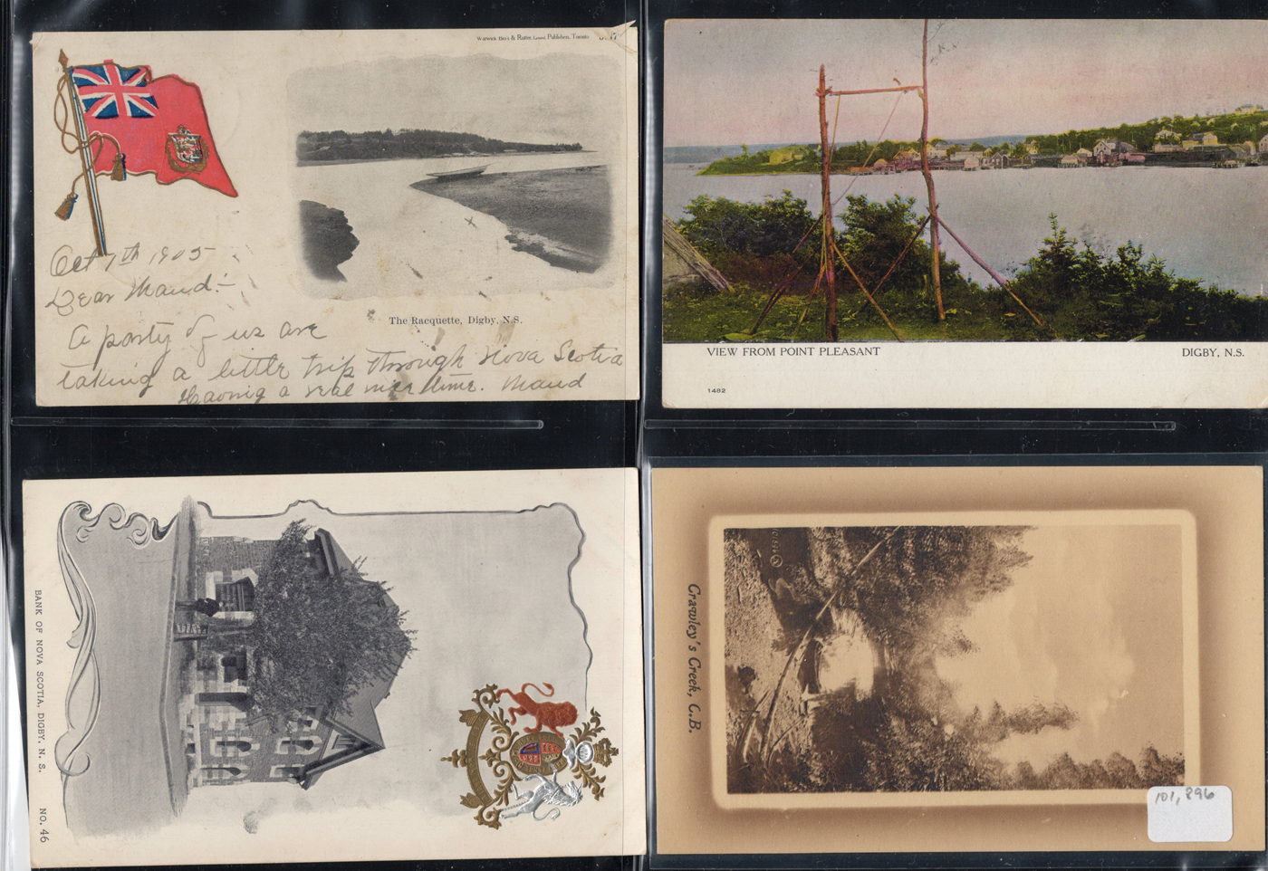 1202 PC   imageCollection of "D to J" Nova Scotia Towns Early Picture Postcards, with about 210 different mostly pre-World War II cards (no Halifax), sorted alphabetically by town in a postcard binder. We note a good variety of types, with real photo (many), town views, patriotic (several types, incl. series) with several scarce to rare cards. There is a mix of used and unused, so there can be postmark interest as well. Some edge, etc. faults noted, still overall fine to very fine. Photos show a good sampling. (Scan 1) (Scan 2) (Scan 3) (Scan 4) (Scan 5) (Scan 6) (Scan 7) (Scan 8) (Scan 9) (Scan 10) (Scan 11) (Scan 12) (Scan 13) (Scan 14) (Scan 15) (Scan 16) (Scan 17) (Scan 18) (Scan 19) (Scan 20) (Scan 21) (Scan 22) (Scan 23) (Scan 24) (Scan 25) (Scan 26) (Scan 27) (All Scans)