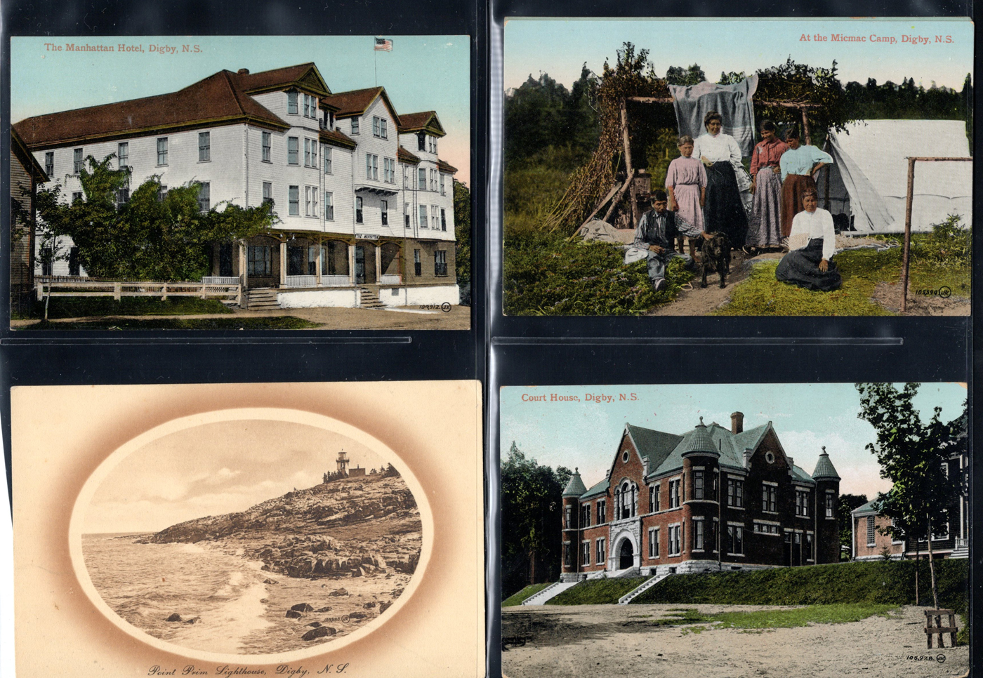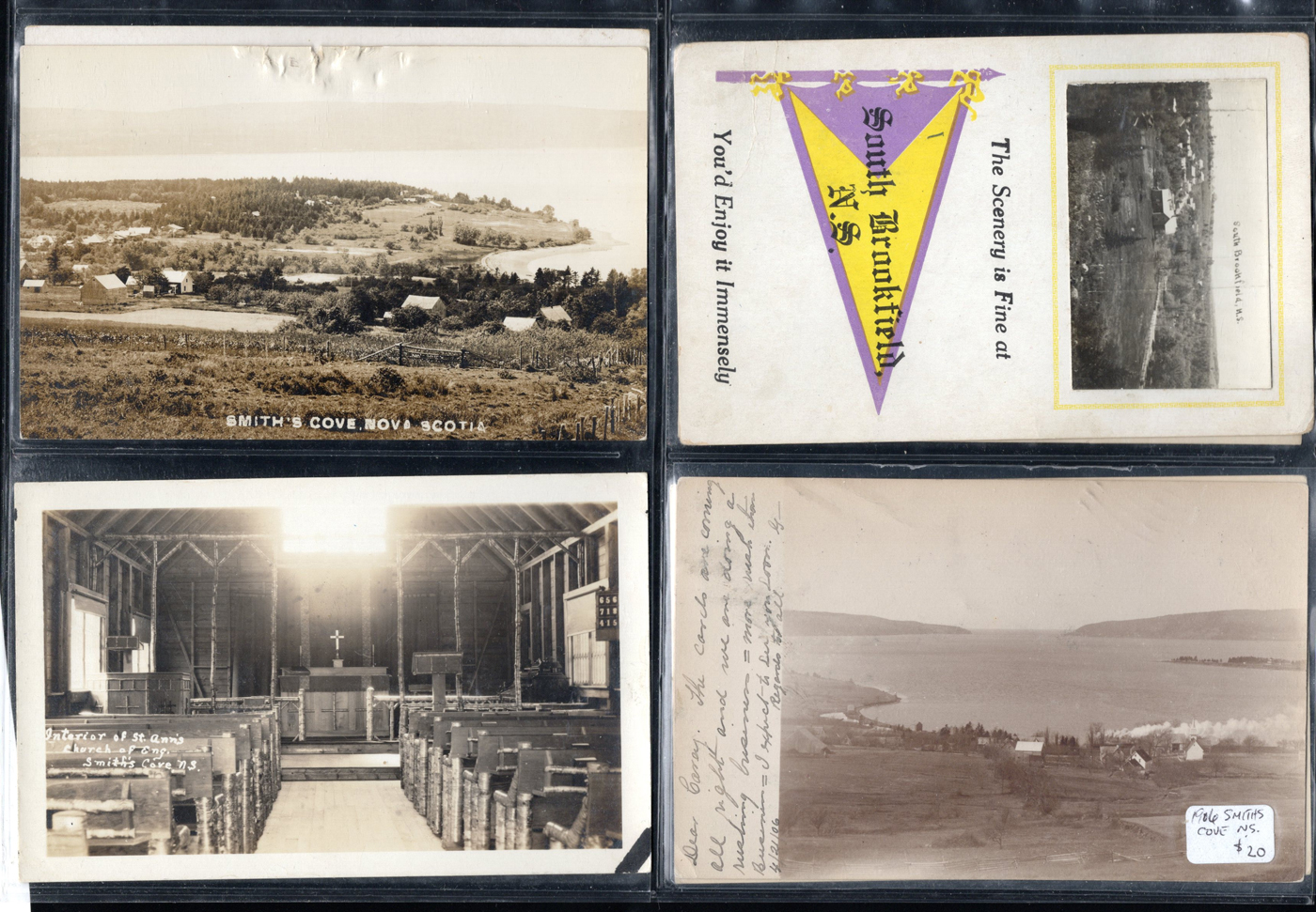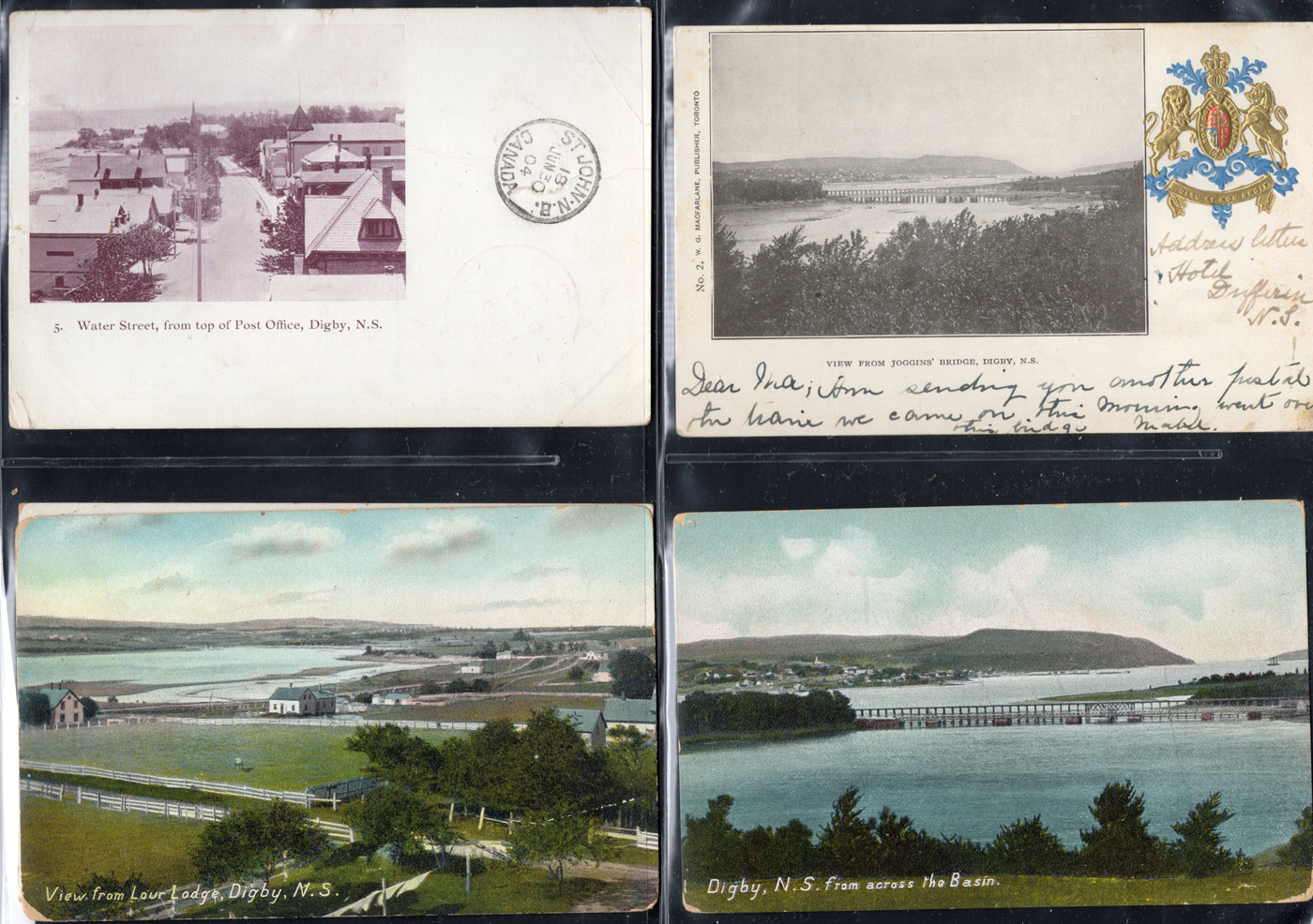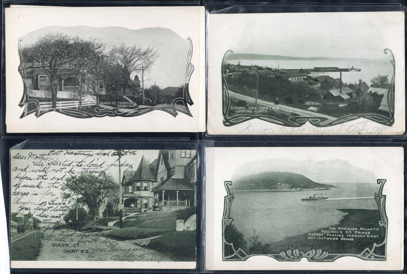 1202 PC   imageCollection of "D to J" Nova Scotia Towns Early Picture Postcards, with about 210 different mostly pre-World War II cards (no Halifax), sorted alphabetically by town in a postcard binder. We note a good variety of types, with real photo (many), town views, patriotic (several types, incl. series) with several scarce to rare cards. There is a mix of used and unused, so there can be postmark interest as well. Some edge, etc. faults noted, still overall fine to very fine. Photos show a good sampling. (Scan 1) (Scan 2) (Scan 3) (Scan 4) (Scan 5) (Scan 6) (Scan 7) (Scan 8) (Scan 9) (Scan 10) (Scan 11) (Scan 12) (Scan 13) (Scan 14) (Scan 15) (Scan 16) (Scan 17) (Scan 18) (Scan 19) (Scan 20) (Scan 21) (Scan 22) (Scan 23) (Scan 24) (Scan 25) (Scan 26) (Scan 27) (All Scans)
