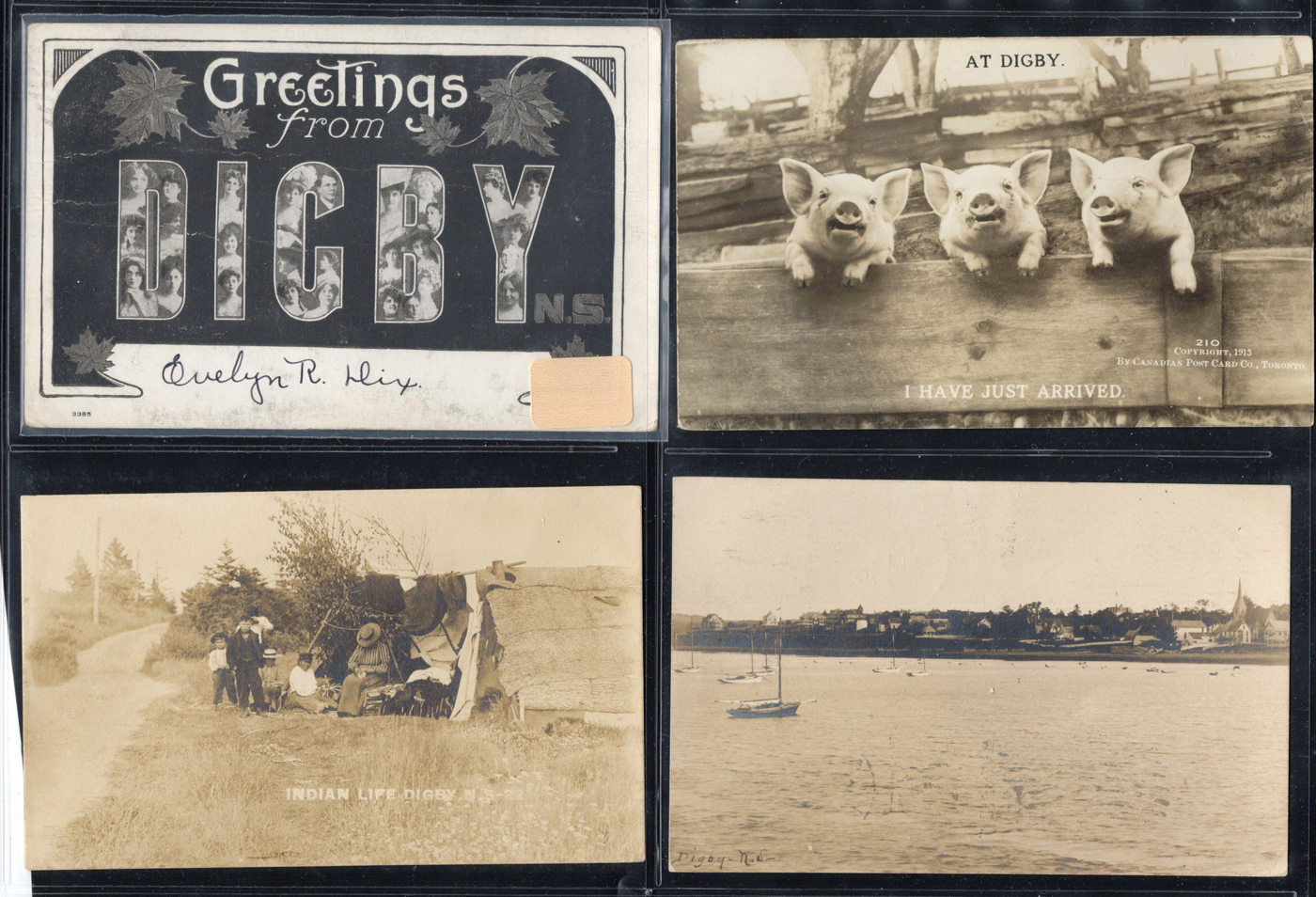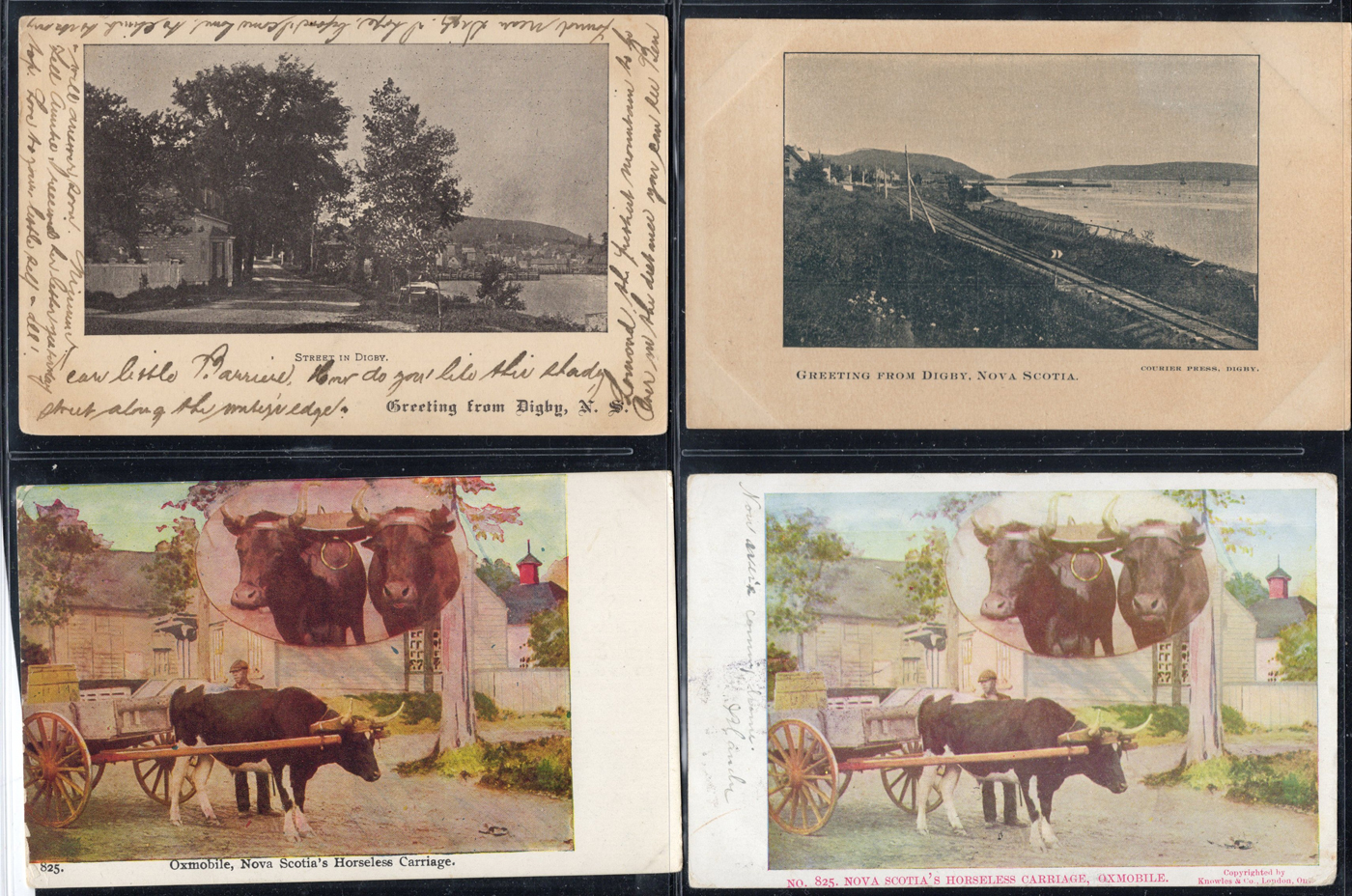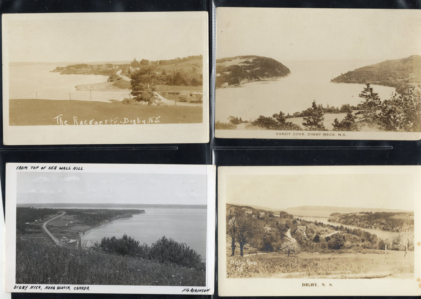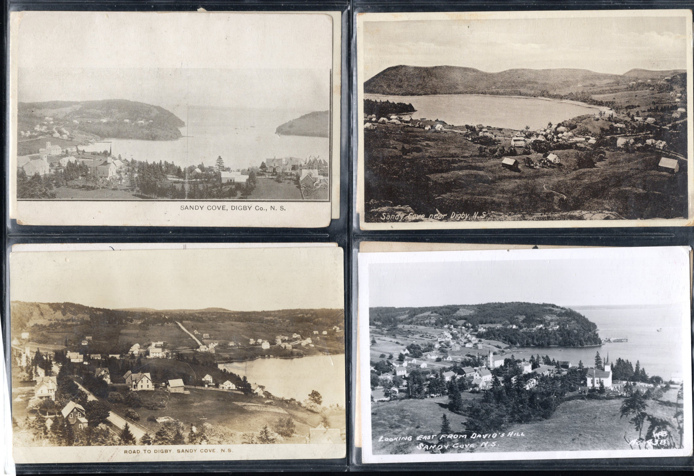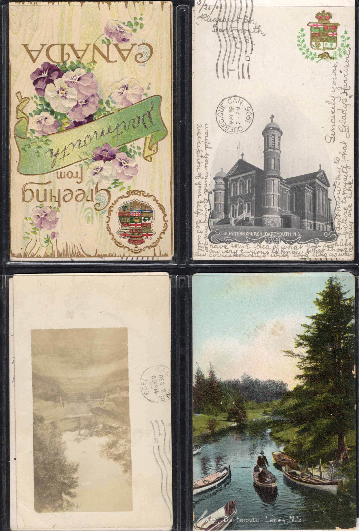 1202 PC   imageCollection of "D to J" Nova Scotia Towns Early Picture Postcards, with about 210 different mostly pre-World War II cards (no Halifax), sorted alphabetically by town in a postcard binder. We note a good variety of types, with real photo (many), town views, patriotic (several types, incl. series) with several scarce to rare cards. There is a mix of used and unused, so there can be postmark interest as well. Some edge, etc. faults noted, still overall fine to very fine. Photos show a good sampling. (Scan 1) (Scan 2) (Scan 3) (Scan 4) (Scan 5) (Scan 6) (Scan 7) (Scan 8) (Scan 9) (Scan 10) (Scan 11) (Scan 12) (Scan 13) (Scan 14) (Scan 15) (Scan 16) (Scan 17) (Scan 18) (Scan 19) (Scan 20) (Scan 21) (Scan 22) (Scan 23) (Scan 24) (Scan 25) (Scan 26) (Scan 27) (All Scans)