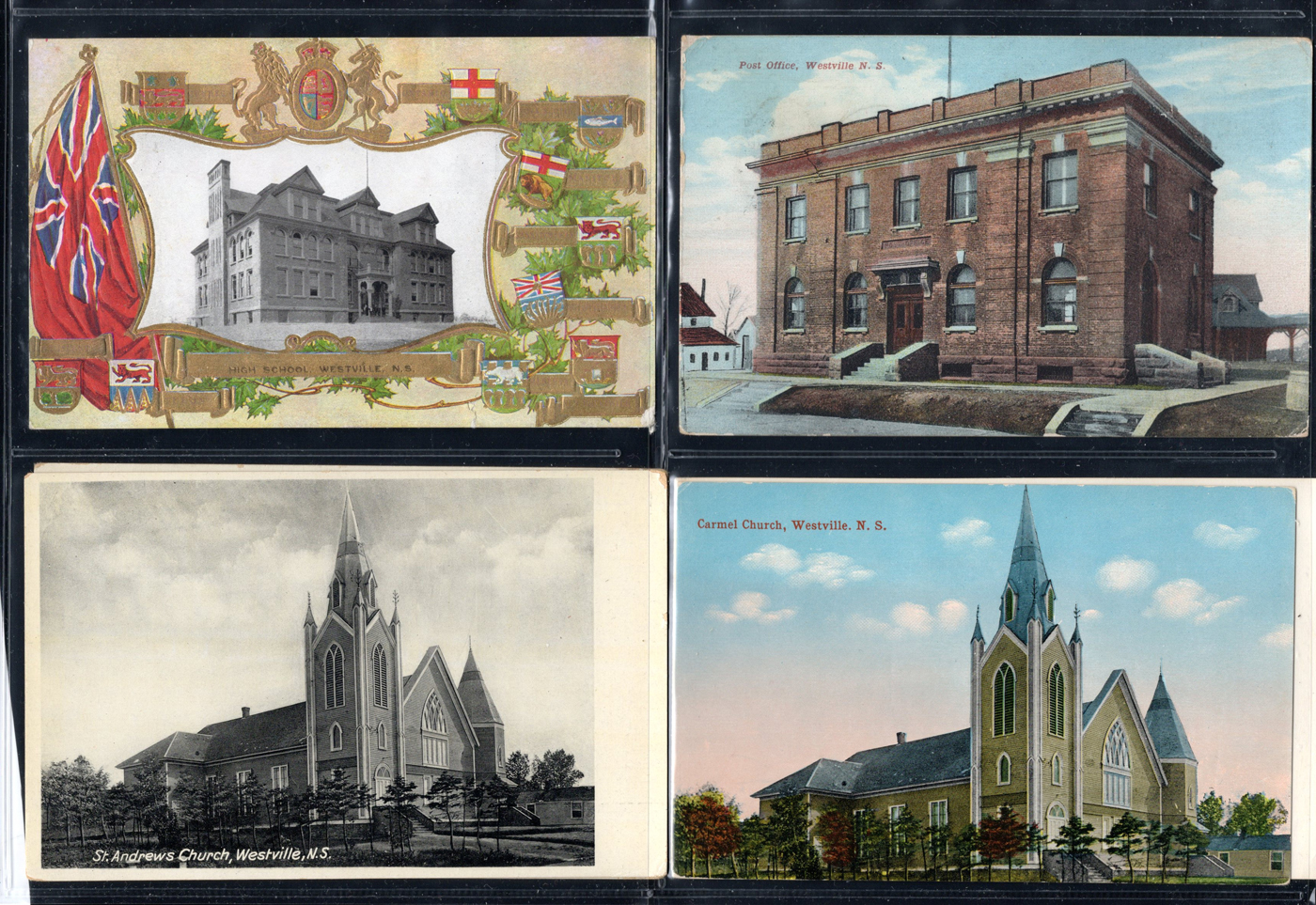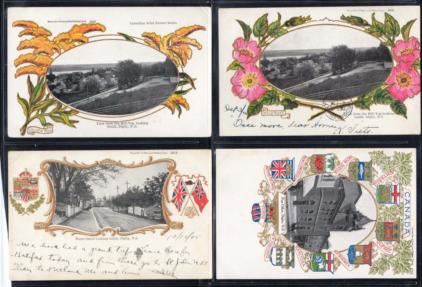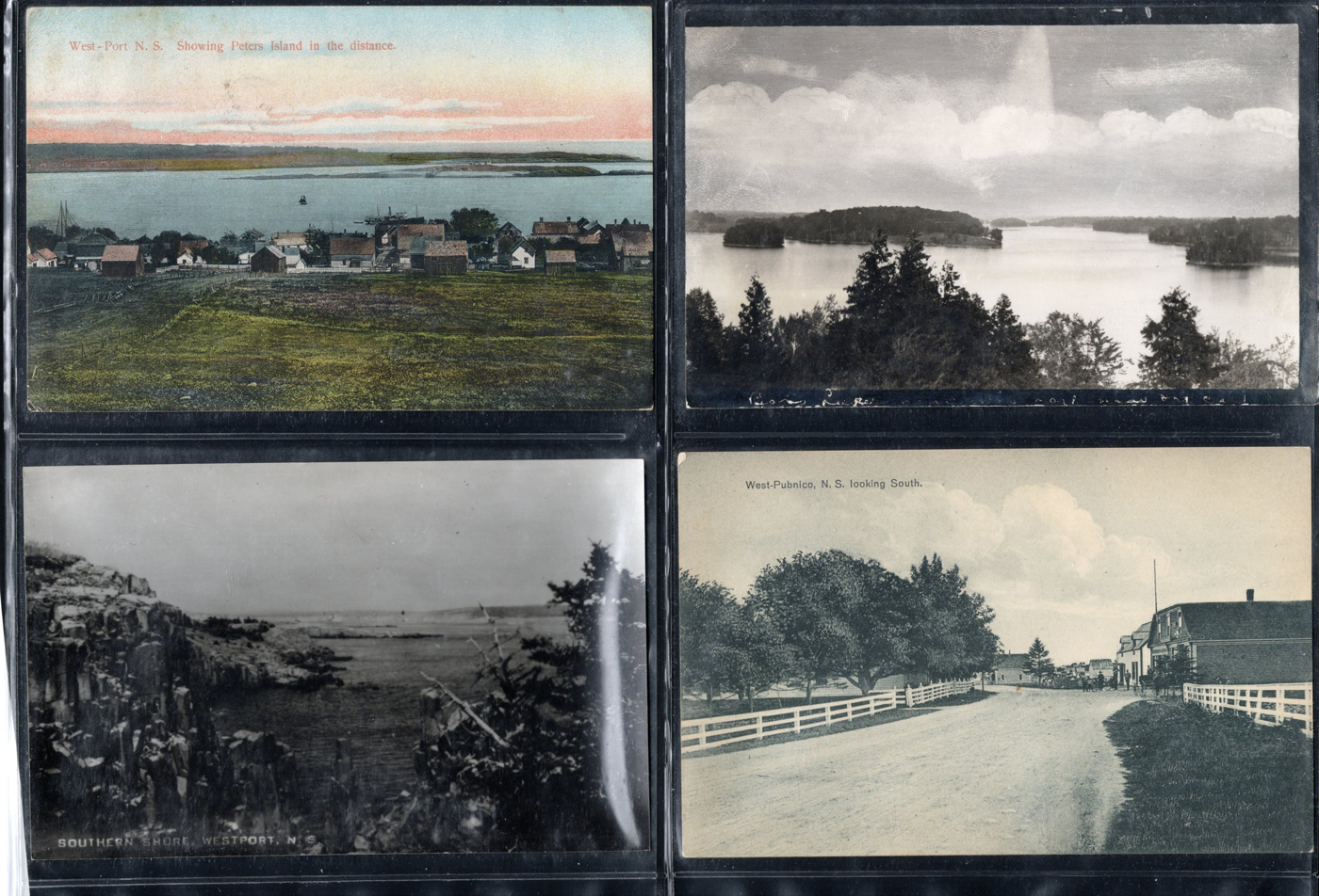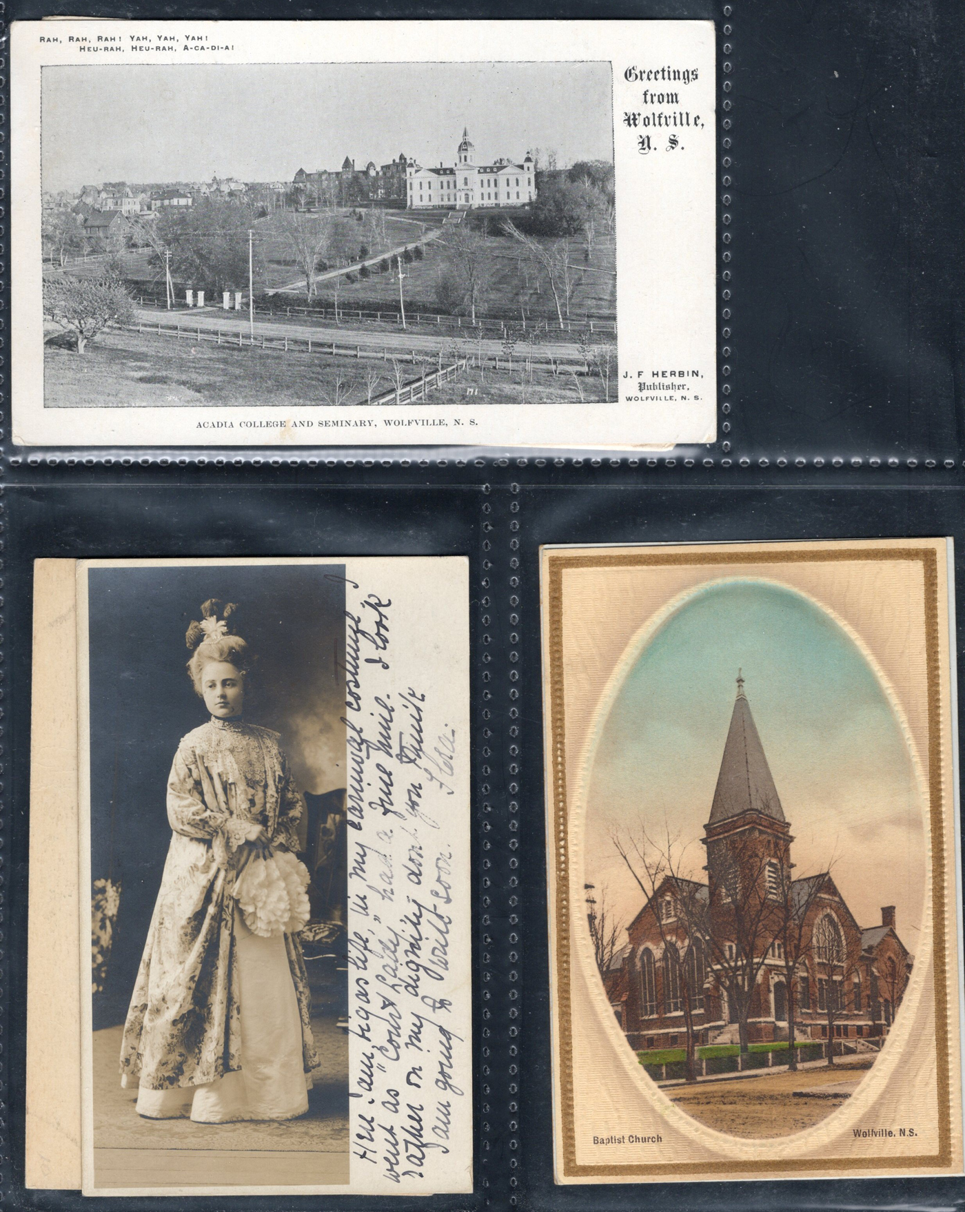 1206 PC   imageCollection of "W" Nova Scotia Towns Early Picture Postcards, with about 86 different mostly pre-World War II cards, sorted alphabetically by town in a postcard binder. We note a good variety of types, with real photo (many), town views, patriotic (several types, incl. series) with several scarce to rare cards. There is a mix of used and unused, so there can be postmark interest as well. Some edge, etc. faults noted, still overall fine to very fine. Photos show a good sampling. (Scan 1) (Scan 2) (Scan 3) (Scan 4) (Scan 5) (Scan 6) (Scan 7) (Scan 8) (Scan 9) (Scan 10) (Scan 11) (Scan 12) (Scan 13) (Scan 14) (Scan 15) (Scan 16) (Scan 17) (Scan 18) (All Scans)