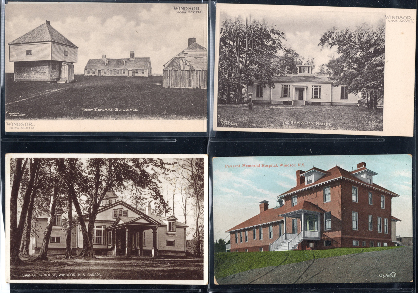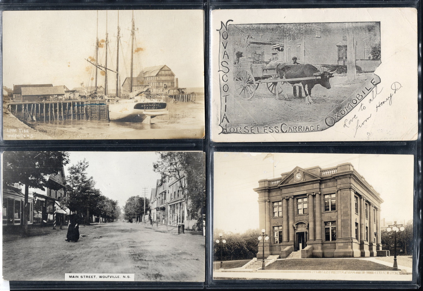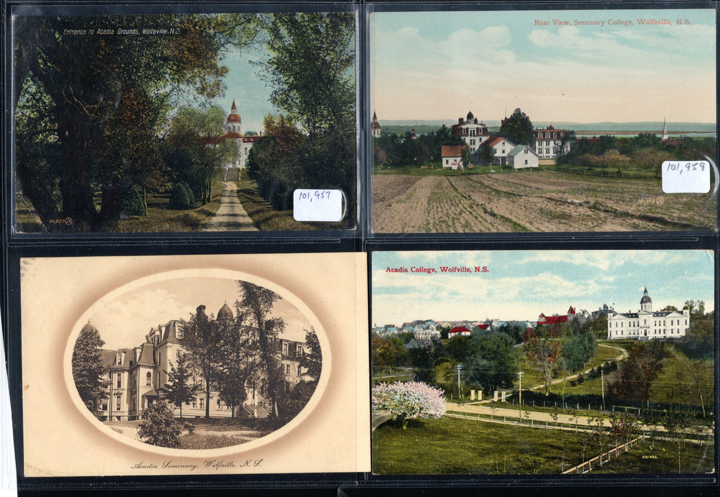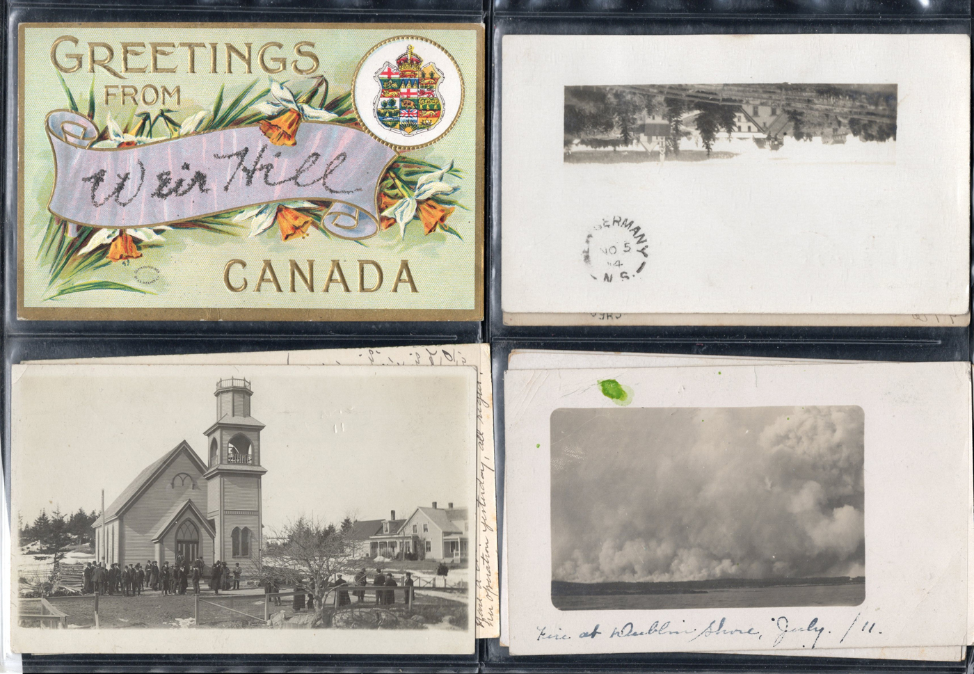 1206 PC   imageCollection of "W" Nova Scotia Towns Early Picture Postcards, with about 86 different mostly pre-World War II cards, sorted alphabetically by town in a postcard binder. We note a good variety of types, with real photo (many), town views, patriotic (several types, incl. series) with several scarce to rare cards. There is a mix of used and unused, so there can be postmark interest as well. Some edge, etc. faults noted, still overall fine to very fine. Photos show a good sampling. (Scan 1) (Scan 2) (Scan 3) (Scan 4) (Scan 5) (Scan 6) (Scan 7) (Scan 8) (Scan 9) (Scan 10) (Scan 11) (Scan 12) (Scan 13) (Scan 14) (Scan 15) (Scan 16) (Scan 17) (Scan 18) (All Scans)