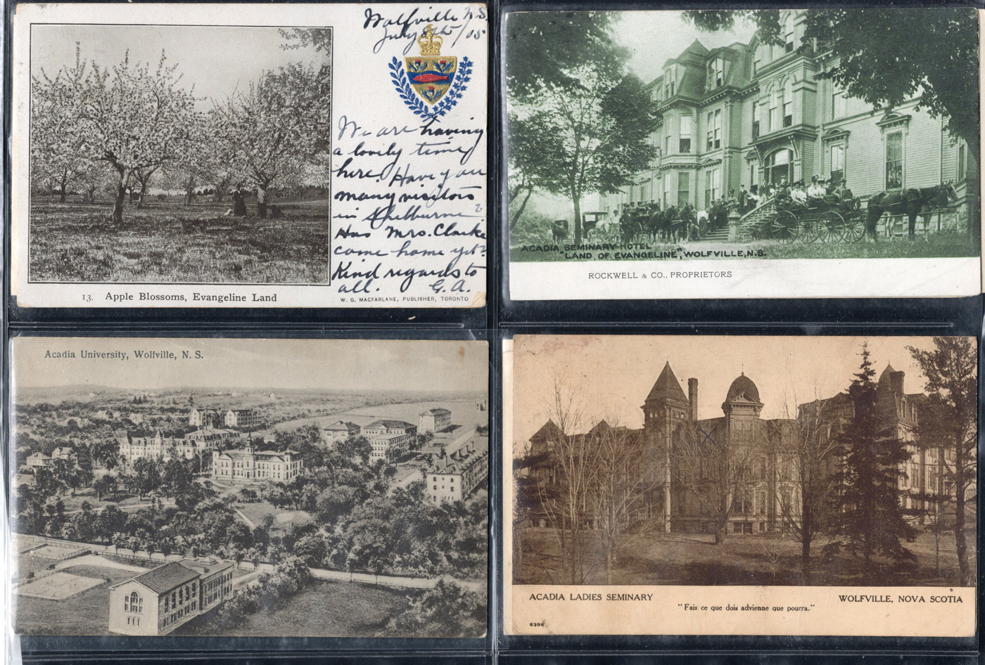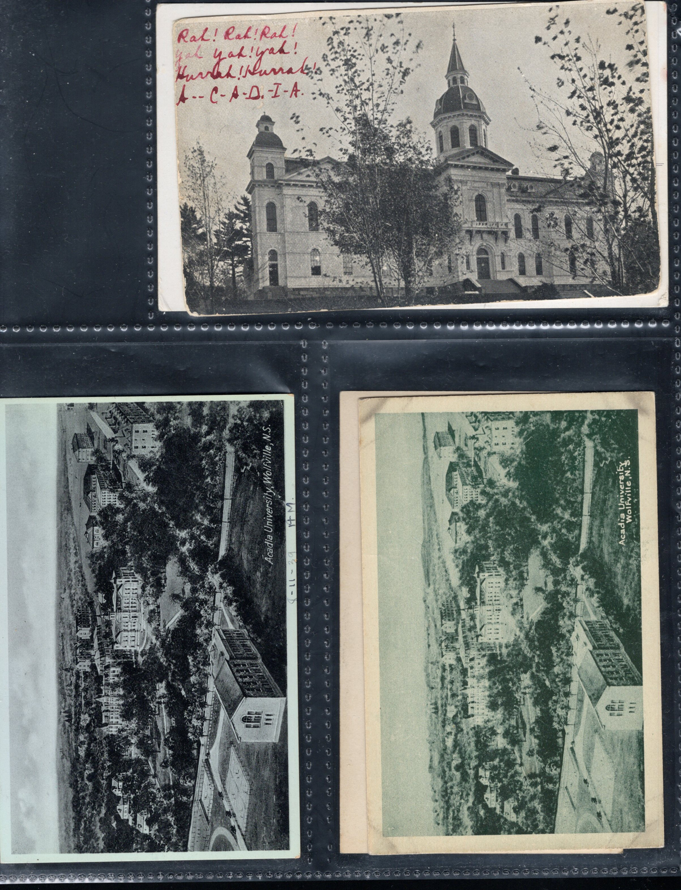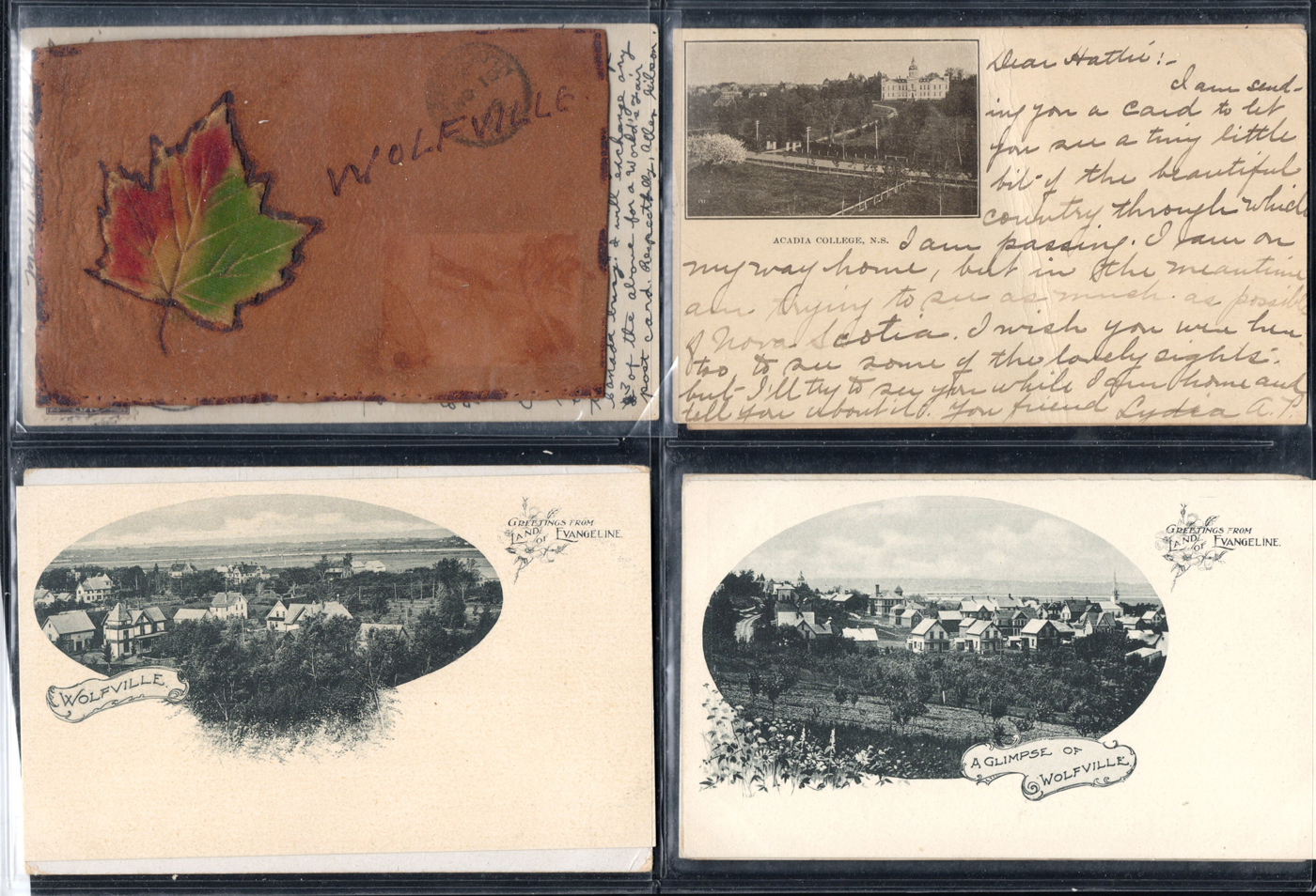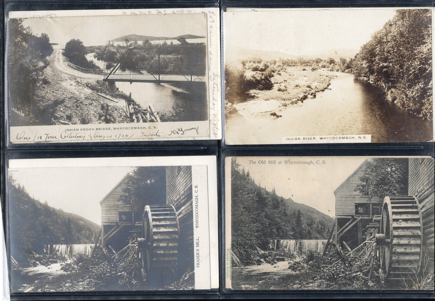 1206 PC   imageCollection of "W" Nova Scotia Towns Early Picture Postcards, with about 86 different mostly pre-World War II cards, sorted alphabetically by town in a postcard binder. We note a good variety of types, with real photo (many), town views, patriotic (several types, incl. series) with several scarce to rare cards. There is a mix of used and unused, so there can be postmark interest as well. Some edge, etc. faults noted, still overall fine to very fine. Photos show a good sampling. (Scan 1) (Scan 2) (Scan 3) (Scan 4) (Scan 5) (Scan 6) (Scan 7) (Scan 8) (Scan 9) (Scan 10) (Scan 11) (Scan 12) (Scan 13) (Scan 14) (Scan 15) (Scan 16) (Scan 17) (Scan 18) (All Scans)