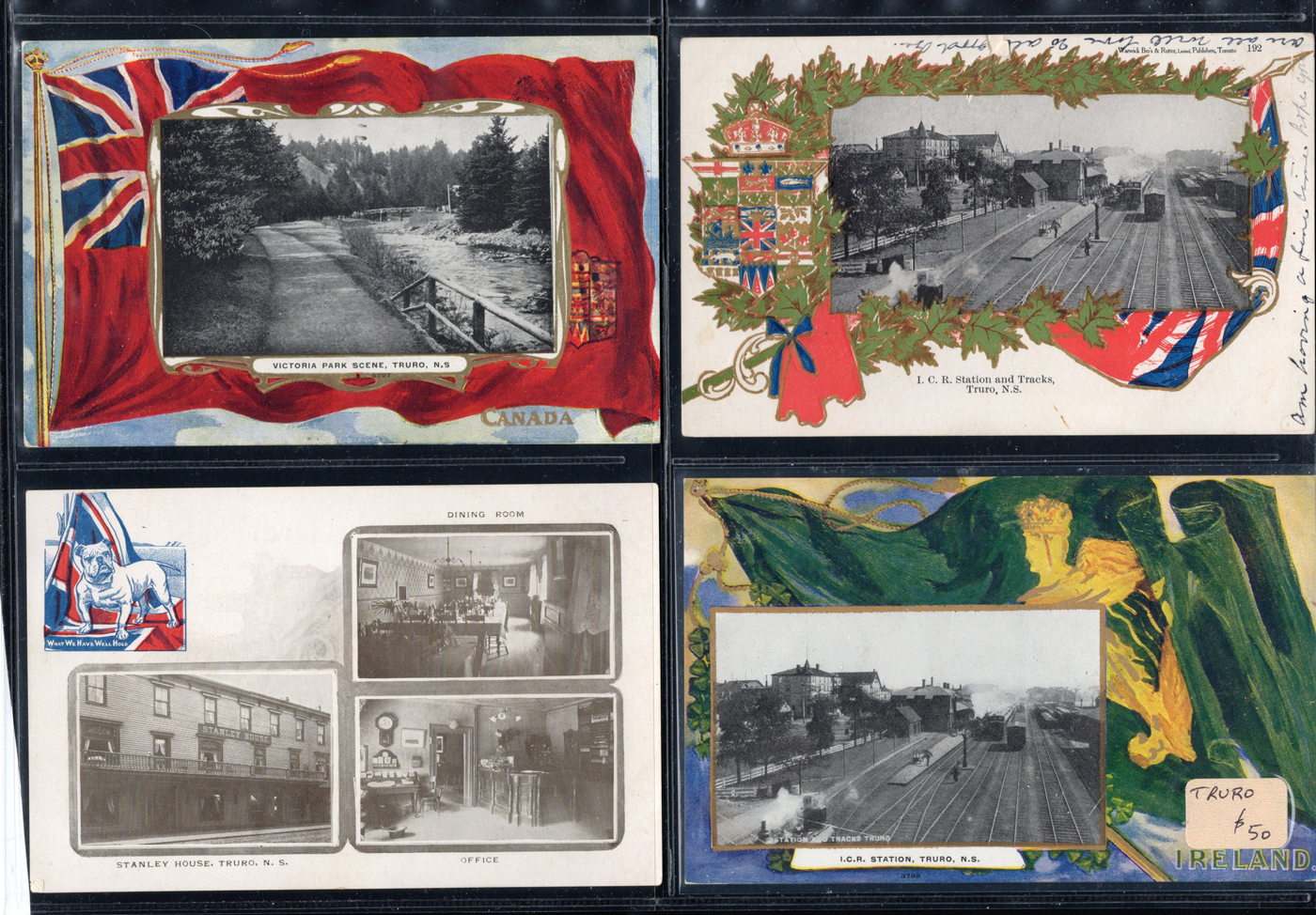 1205 PC   imageCollection of "R to T" Nova Scotia Towns Early Picture Postcards, with about 190 different mostly pre-World War II cards, sorted alphabetically by town in a postcard binder. We note a good variety of types, with real photo (many), town views, patriotic (several types, incl. series) with several scarce to rare cards. There is a mix of used and unused, so there can be postmark interest as well. Some edge, etc. faults noted, still overall fine to very fine. Photos show a good sampling. (Scan 1) (Scan 2) (Scan 3) (Scan 4) (Scan 5) (Scan 6) (Scan 7) (Scan 8) (Scan 9) (Scan 10) (Scan 11) (Scan 12) (Scan 13) (Scan 14) (Scan 15) (Scan 16) (Scan 17) (Scan 18) (Scan 19) (Scan 20) (Scan 21) (Scan 22) (Scan 23) (Scan 24) (Scan 25) (All Scans)