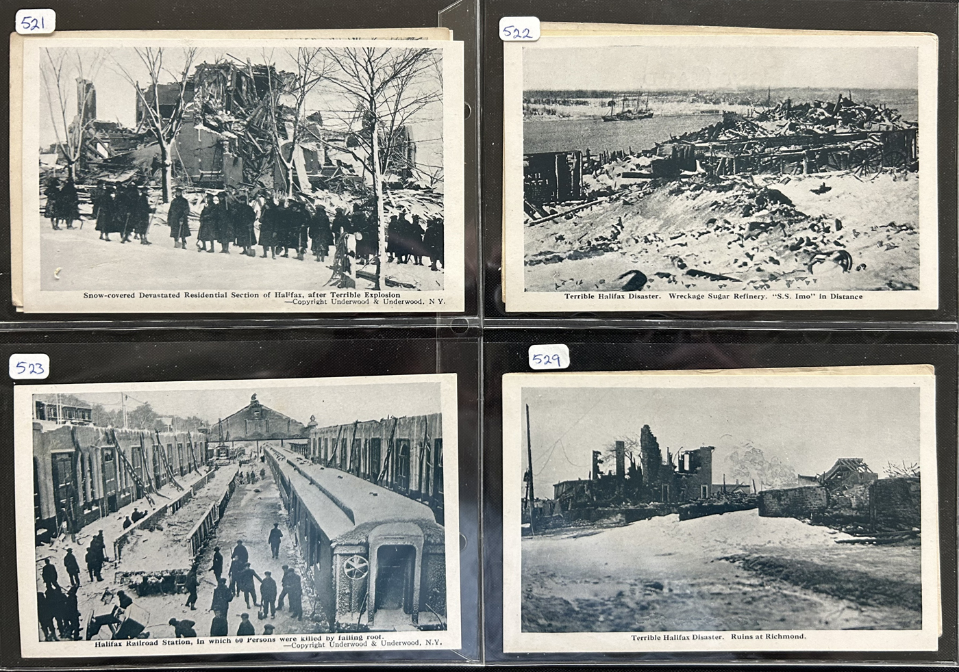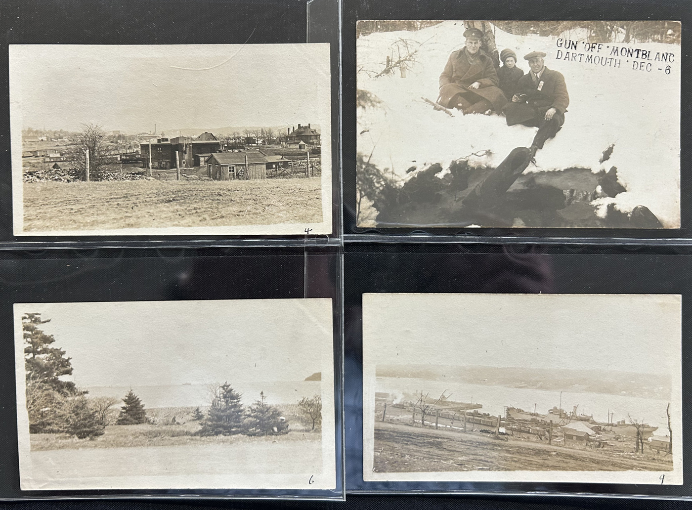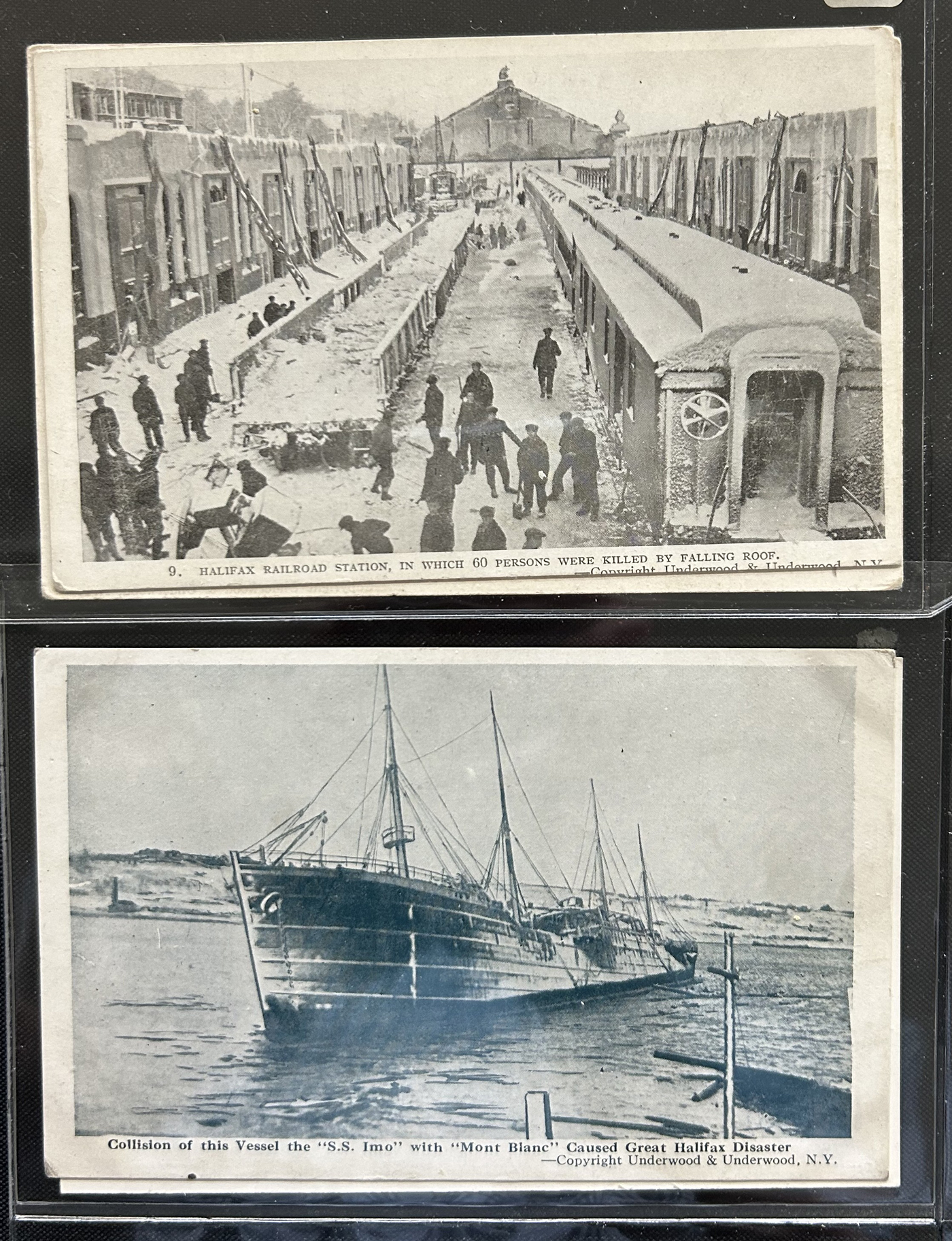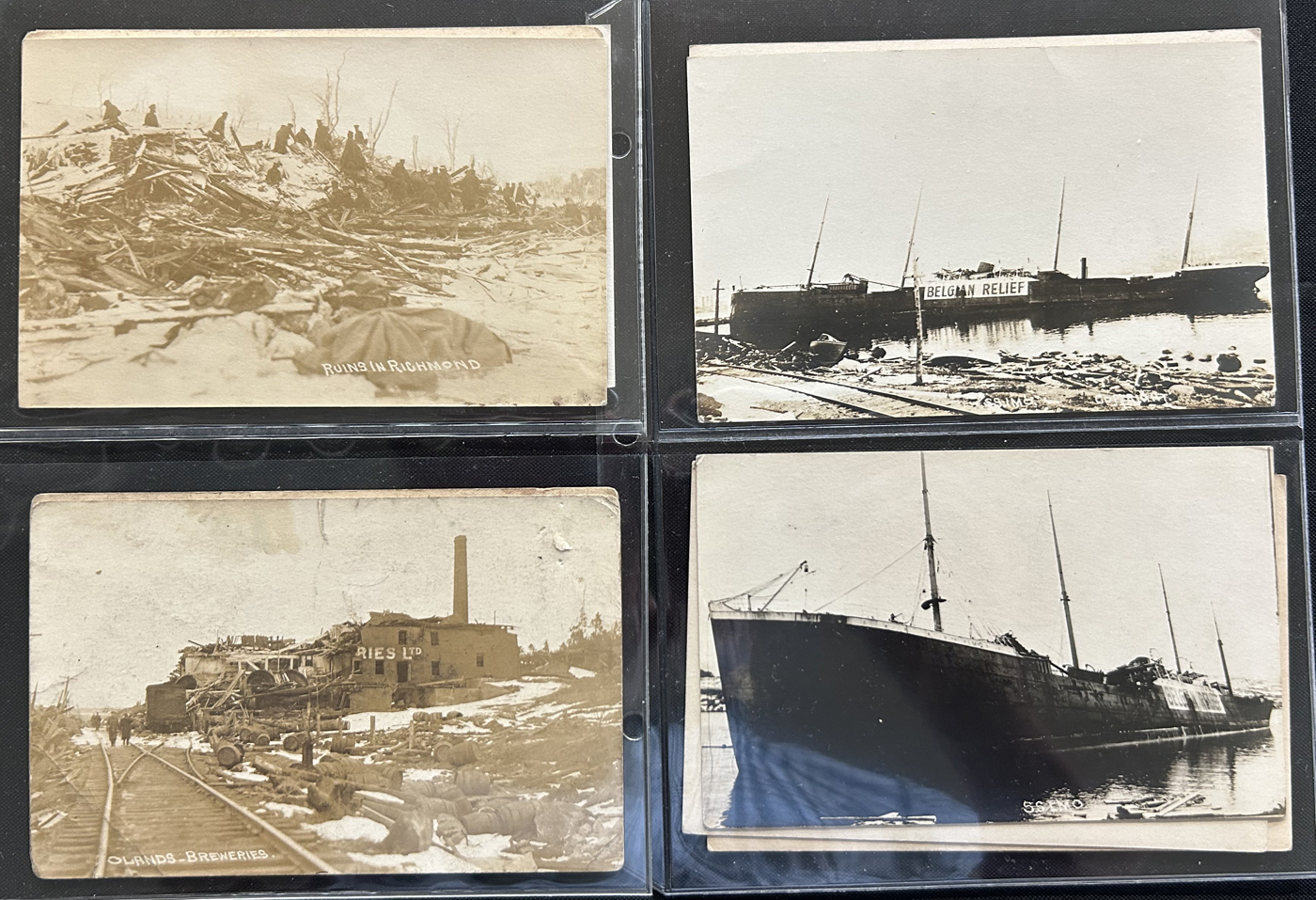 1211 PC   imageCollection of Postcards Depicting the 1917 Halifax Explosion, and its Effects, with 51 cards (bit of duplication), each showing a topic related to the explosion, including two real photo views of the actual ship the S.S. Imo, many destroyed buildings, etc. About half are contemporary real photos, and the other half are from a series published by Novelty Mfg. & Art Co., Limited Montreal. 5 of the real photos are not on postcard stock, all of these have notes on back written in 1919 explaining the scene. We note one of the real photo cards mailed a few months after the explosion, with a note saying "This is the cannon from the ship which exploded and which was thrown and flown about 2 miles from where the ship exploded" (showing three people sitting in the snow next to a cannon in a creek). The same album contains a further 27 cards, most dating from before the explosion, but having to do with Halifax in some way. Overall fine to very fine, all items photographed online. (Scan 1) (Scan 2) (Scan 3) (Scan 4) (Scan 5) (Scan 6) (Scan 7) (Scan 8) (Scan 9) (Scan 10) (Scan 11) (Scan 12) (Scan 13) (Scan 14) (Scan 15) (Scan 16) (Scan 17) (Scan 18) (Scan 19) (Scan 20) (All Scans)