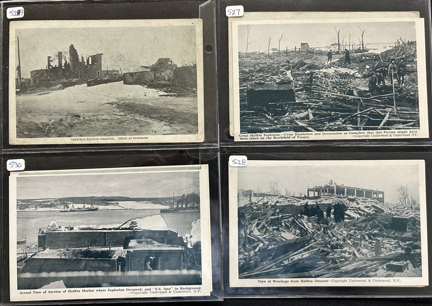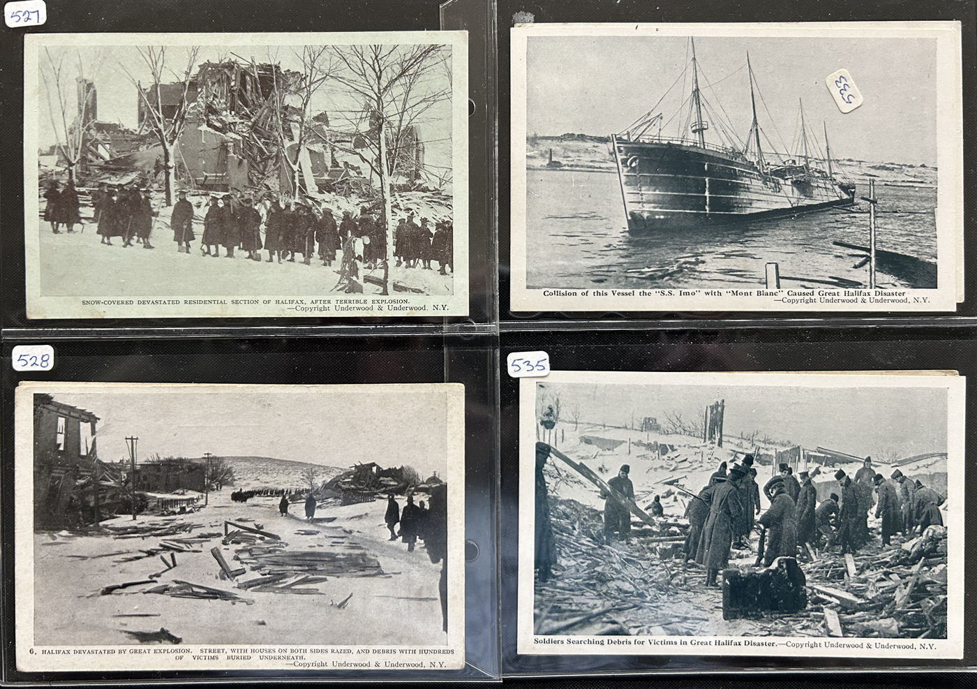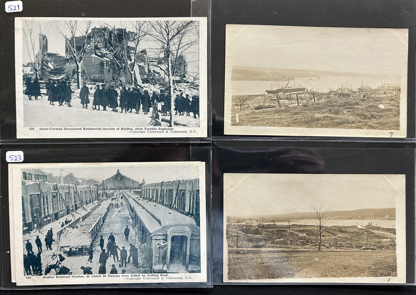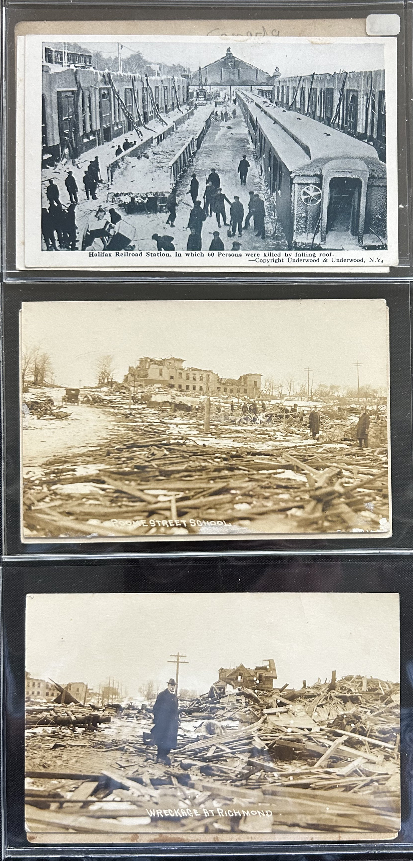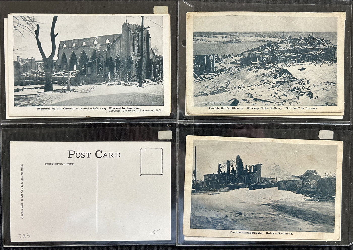 1211 PC   imageCollection of Postcards Depicting the 1917 Halifax Explosion, and its Effects, with 51 cards (bit of duplication), each showing a topic related to the explosion, including two real photo views of the actual ship the S.S. Imo, many destroyed buildings, etc. About half are contemporary real photos, and the other half are from a series published by Novelty Mfg. & Art Co., Limited Montreal. 5 of the real photos are not on postcard stock, all of these have notes on back written in 1919 explaining the scene. We note one of the real photo cards mailed a few months after the explosion, with a note saying "This is the cannon from the ship which exploded and which was thrown and flown about 2 miles from where the ship exploded" (showing three people sitting in the snow next to a cannon in a creek). The same album contains a further 27 cards, most dating from before the explosion, but having to do with Halifax in some way. Overall fine to very fine, all items photographed online. (Scan 1) (Scan 2) (Scan 3) (Scan 4) (Scan 5) (Scan 6) (Scan 7) (Scan 8) (Scan 9) (Scan 10) (Scan 11) (Scan 12) (Scan 13) (Scan 14) (Scan 15) (Scan 16) (Scan 17) (Scan 18) (Scan 19) (Scan 20) (All Scans)