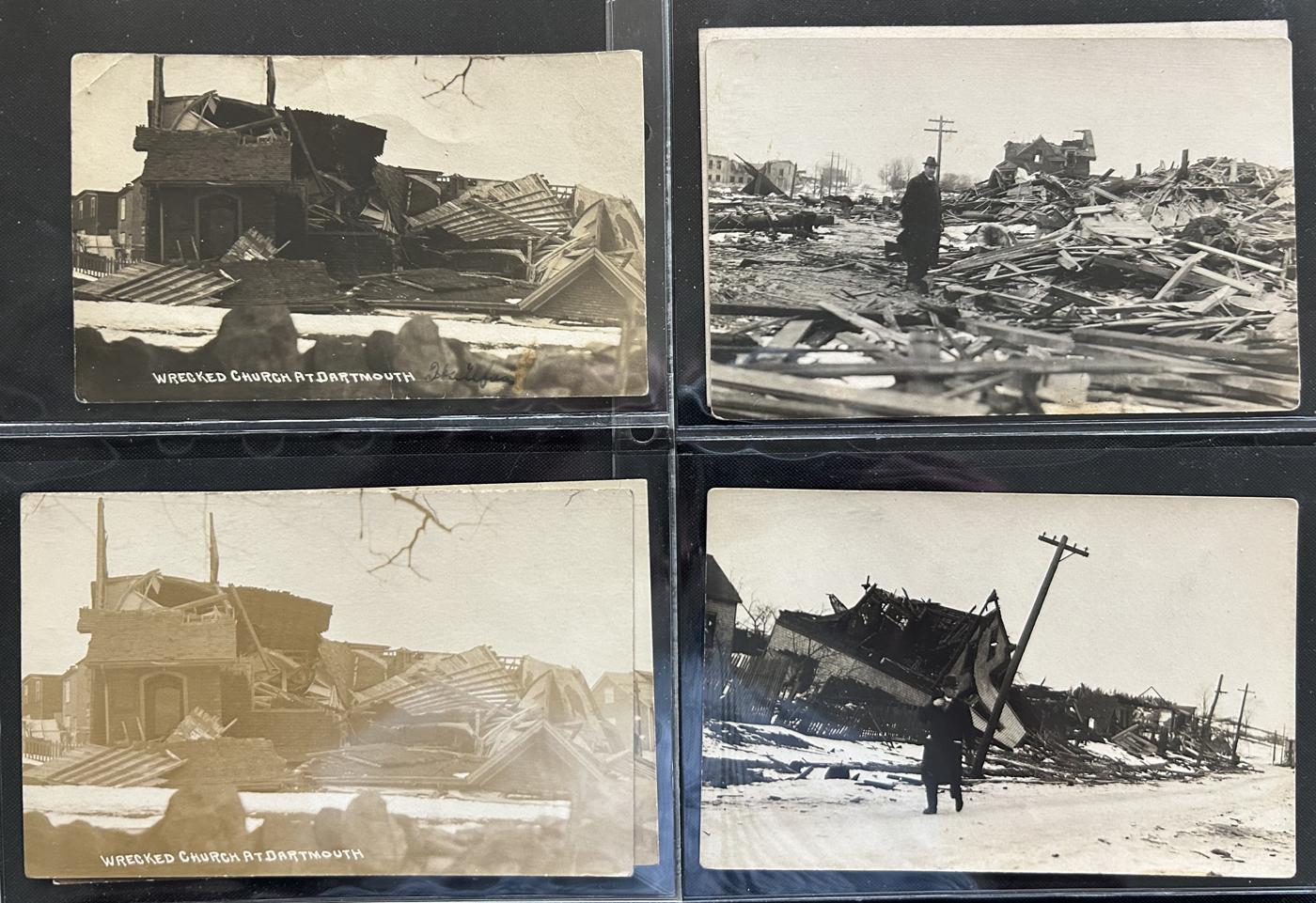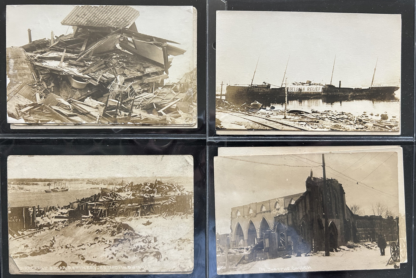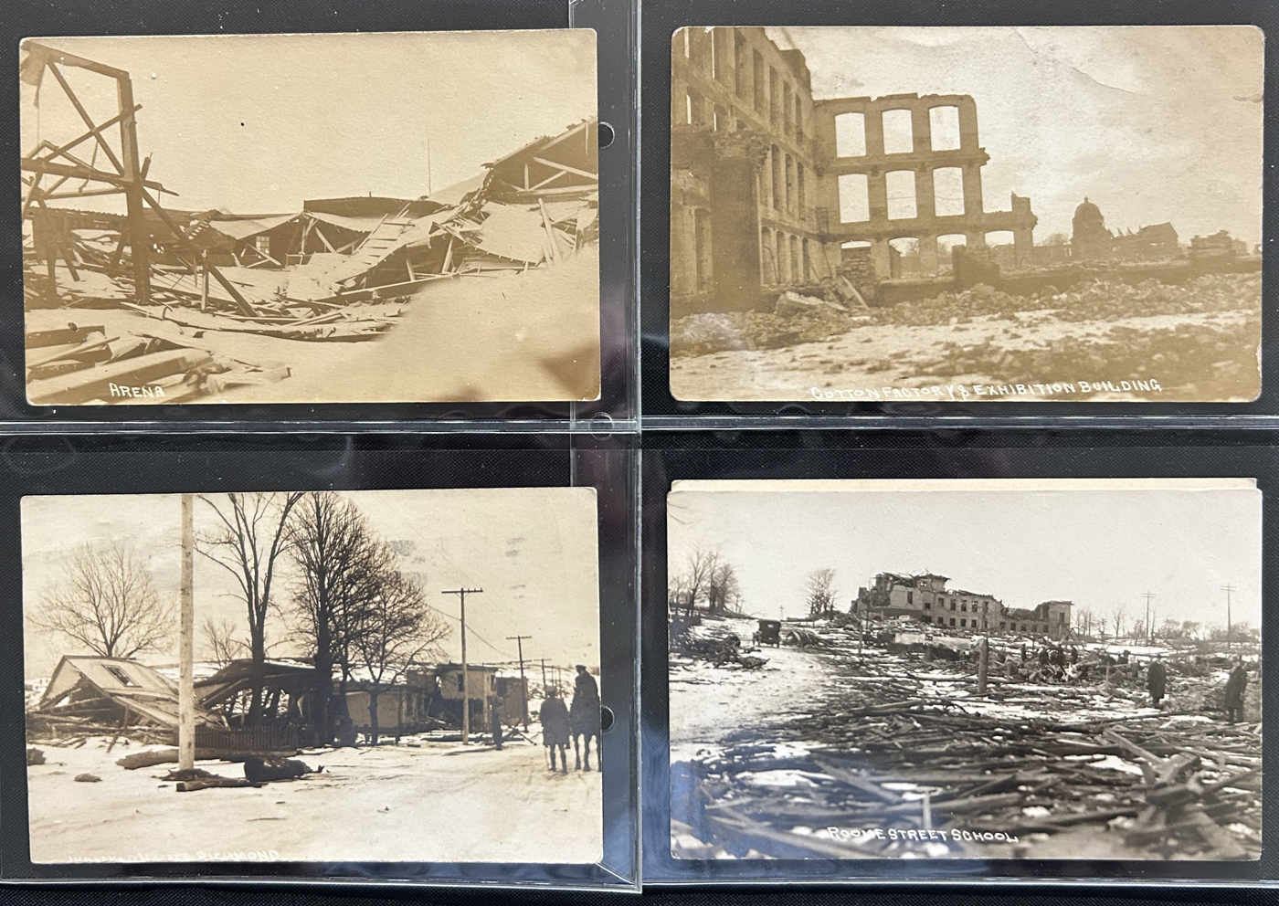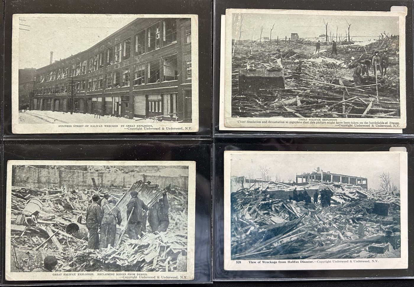 1211 PC   imageCollection of Postcards Depicting the 1917 Halifax Explosion, and its Effects, with 51 cards (bit of duplication), each showing a topic related to the explosion, including two real photo views of the actual ship the S.S. Imo, many destroyed buildings, etc. About half are contemporary real photos, and the other half are from a series published by Novelty Mfg. & Art Co., Limited Montreal. 5 of the real photos are not on postcard stock, all of these have notes on back written in 1919 explaining the scene. We note one of the real photo cards mailed a few months after the explosion, with a note saying "This is the cannon from the ship which exploded and which was thrown and flown about 2 miles from where the ship exploded" (showing three people sitting in the snow next to a cannon in a creek). The same album contains a further 27 cards, most dating from before the explosion, but having to do with Halifax in some way. Overall fine to very fine, all items photographed online. (Scan 1) (Scan 2) (Scan 3) (Scan 4) (Scan 5) (Scan 6) (Scan 7) (Scan 8) (Scan 9) (Scan 10) (Scan 11) (Scan 12) (Scan 13) (Scan 14) (Scan 15) (Scan 16) (Scan 17) (Scan 18) (Scan 19) (Scan 20) (All Scans)
