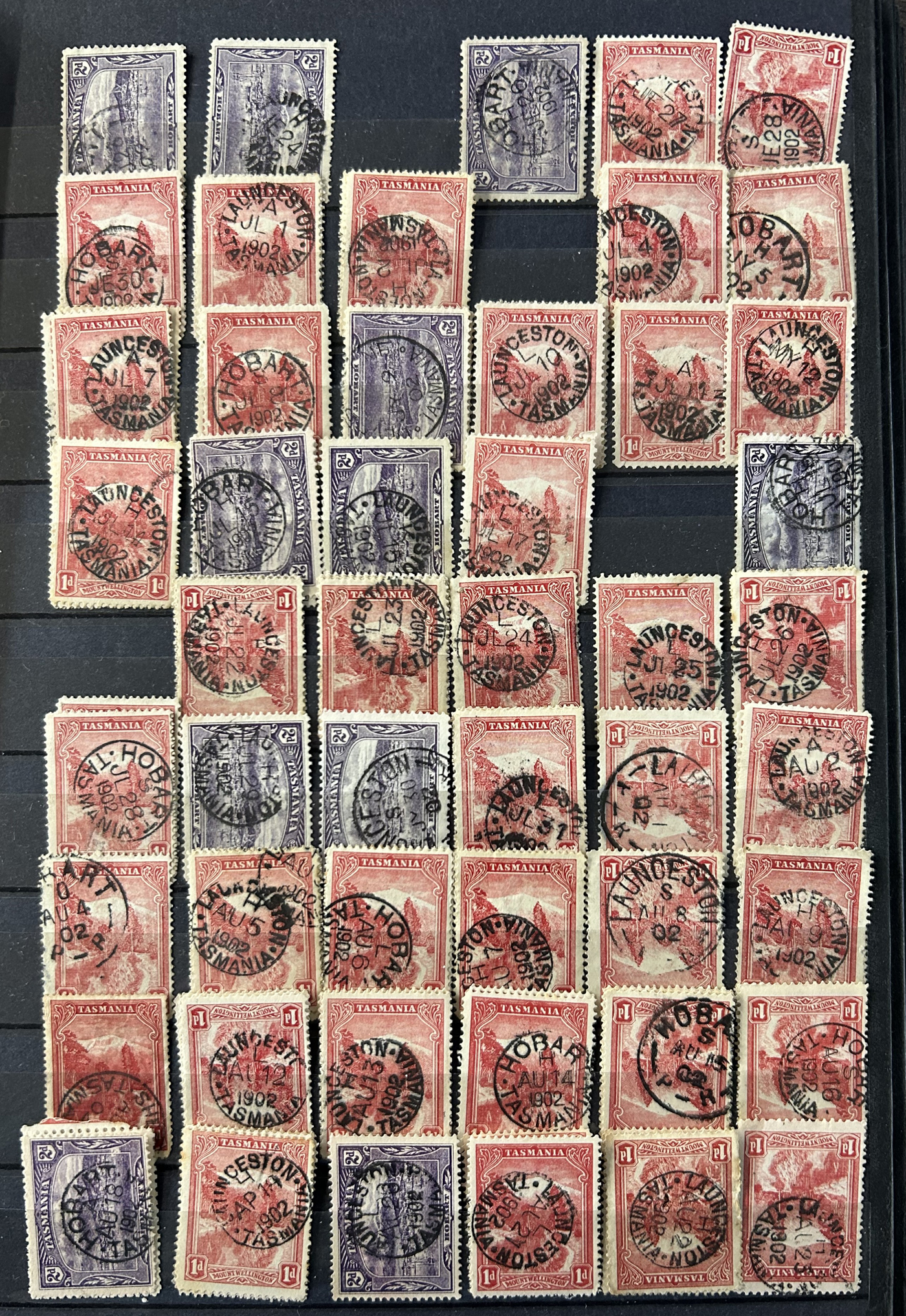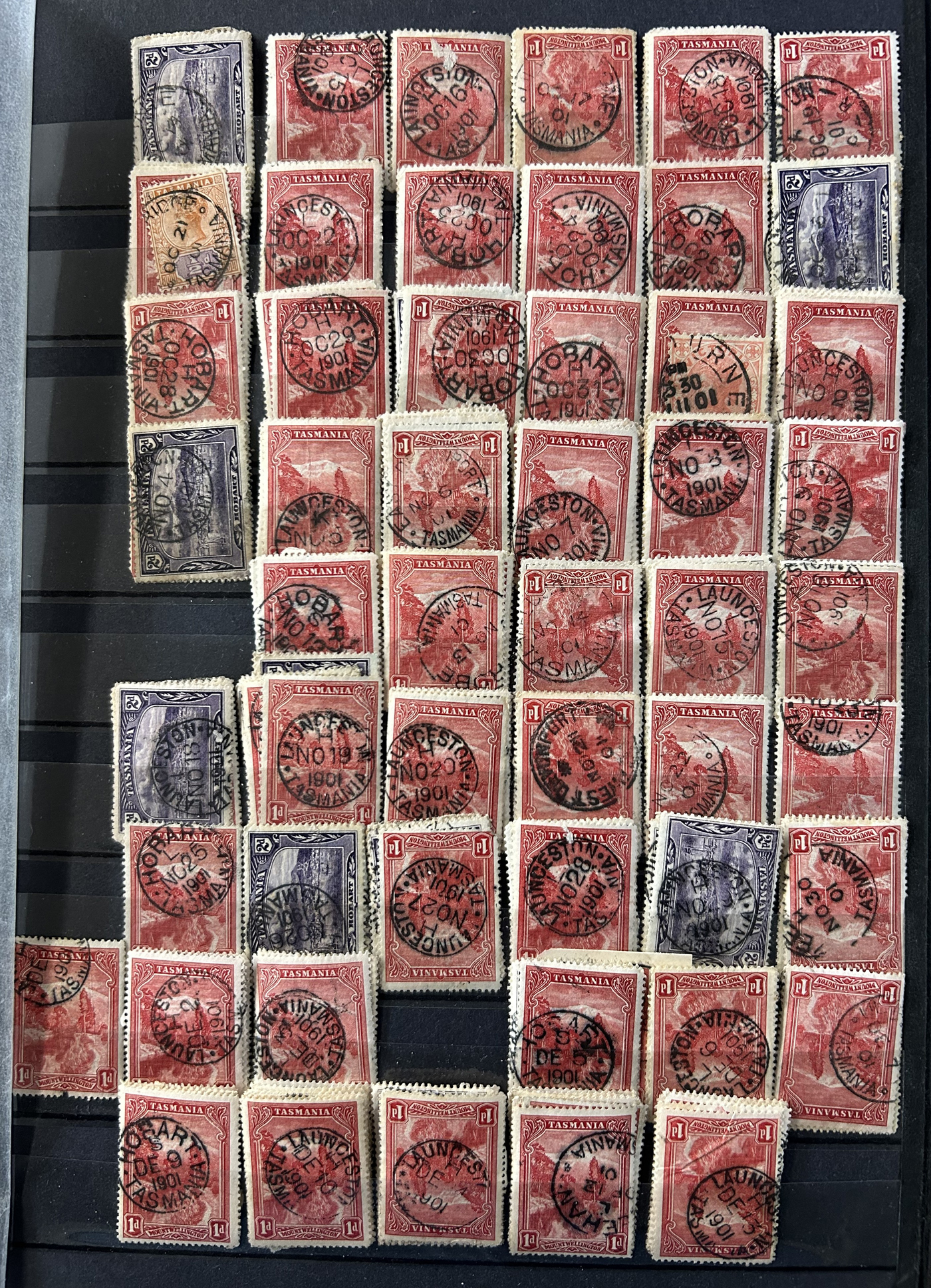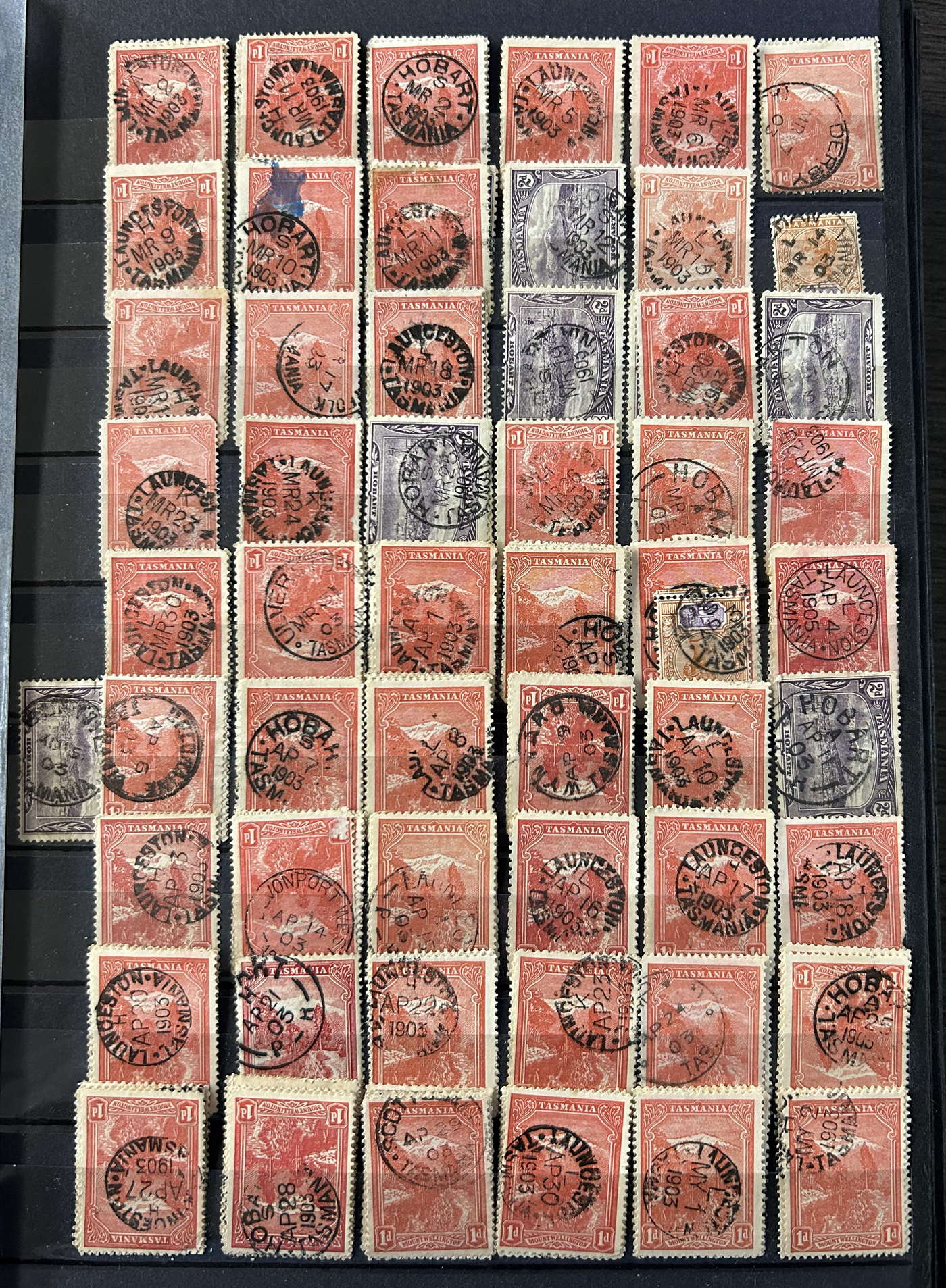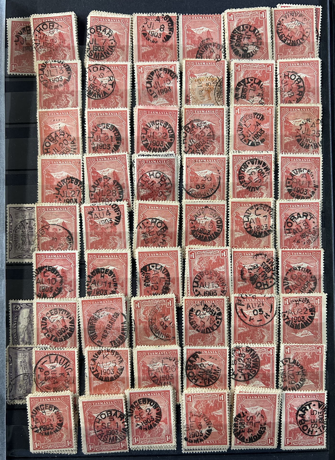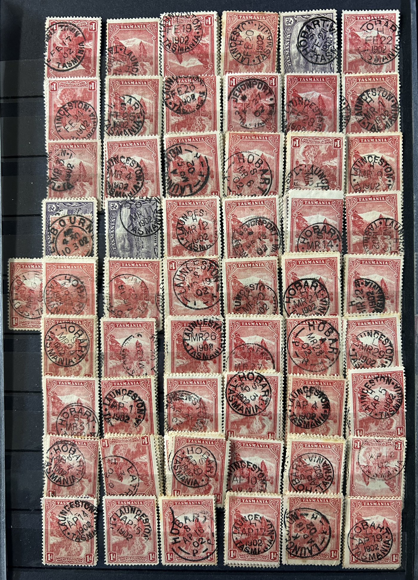 1242 O Tasmania imageExtensive Lifetime Calendar Collection of Tasmanian Town Cancels, filling two stuffed stockbooks (94 pages) with stamps sorted chronologically by date, from March 21, 1896 to December 29, 1913. We estimate a total of well over 10,000 stamps (many specific days can have up to 10 stamps stacked on each other), all with fully readable dates and a wide variety of different town cancels. A perfect, and unique opportunity for town cancel collectors, as well as calendar collectors, as this is a true labour of love that took many decades to assemble. See our photos for a representative idea. (Scan 1) (Scan 2) (Scan 3) (Scan 4) (Scan 5) (Scan 6) (Scan 7) (Scan 8) (Scan 9) (All Scans)