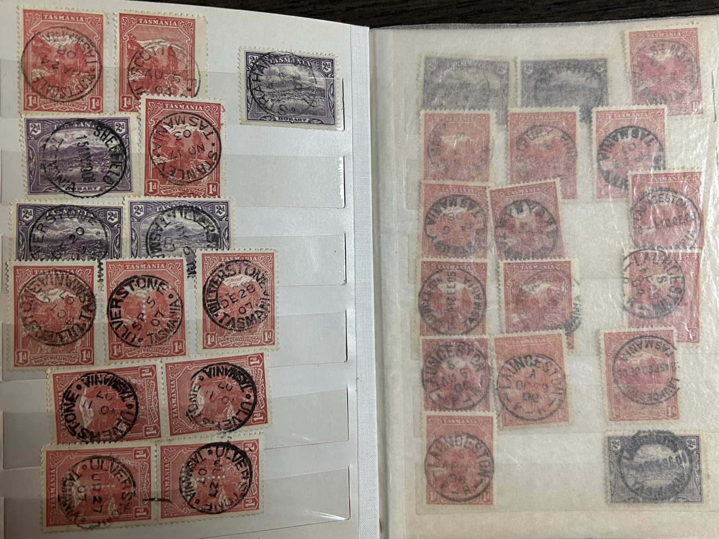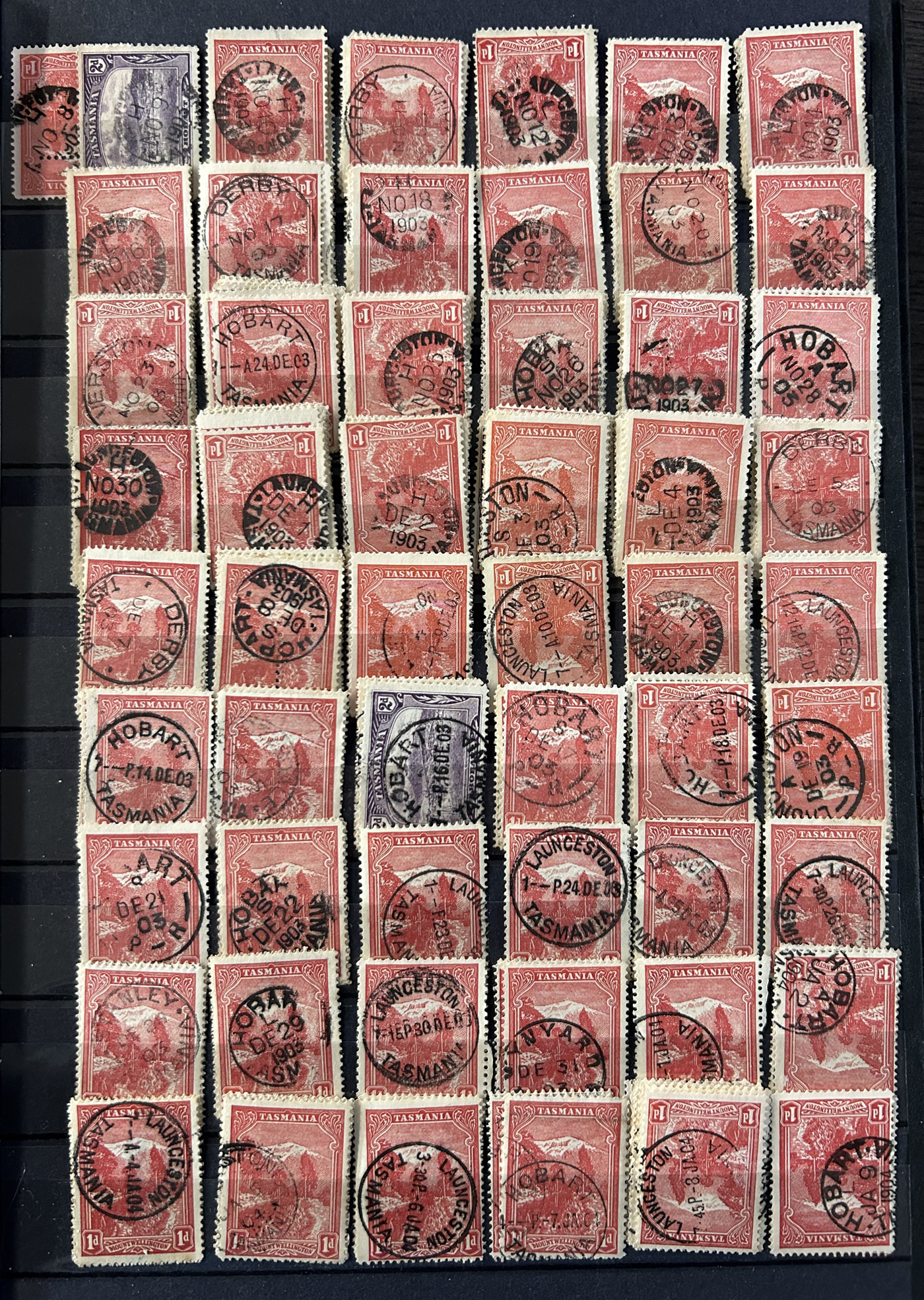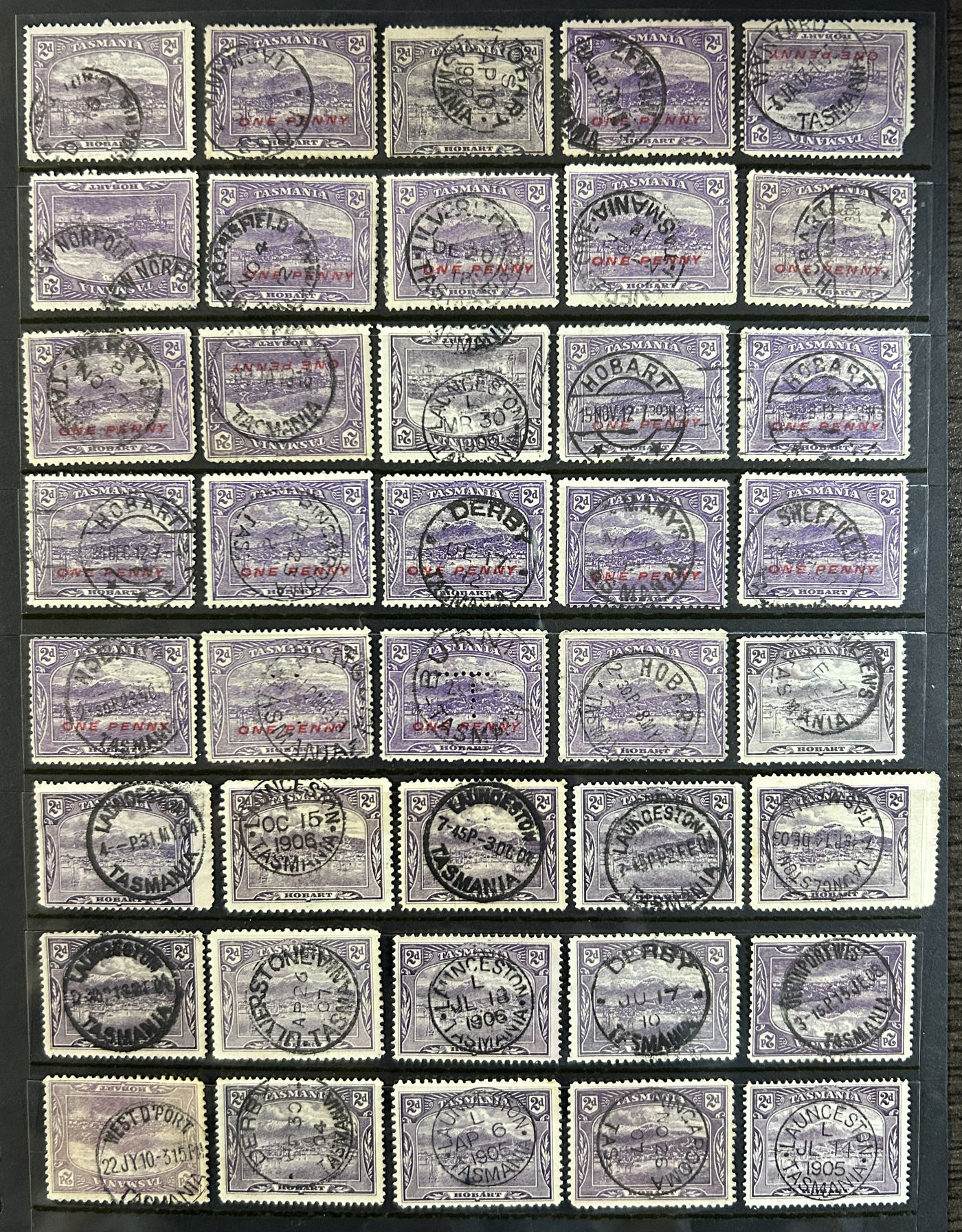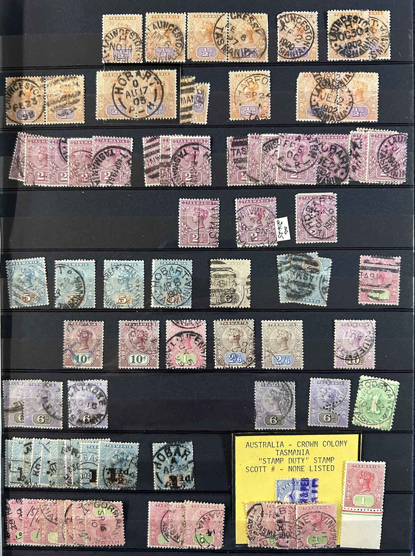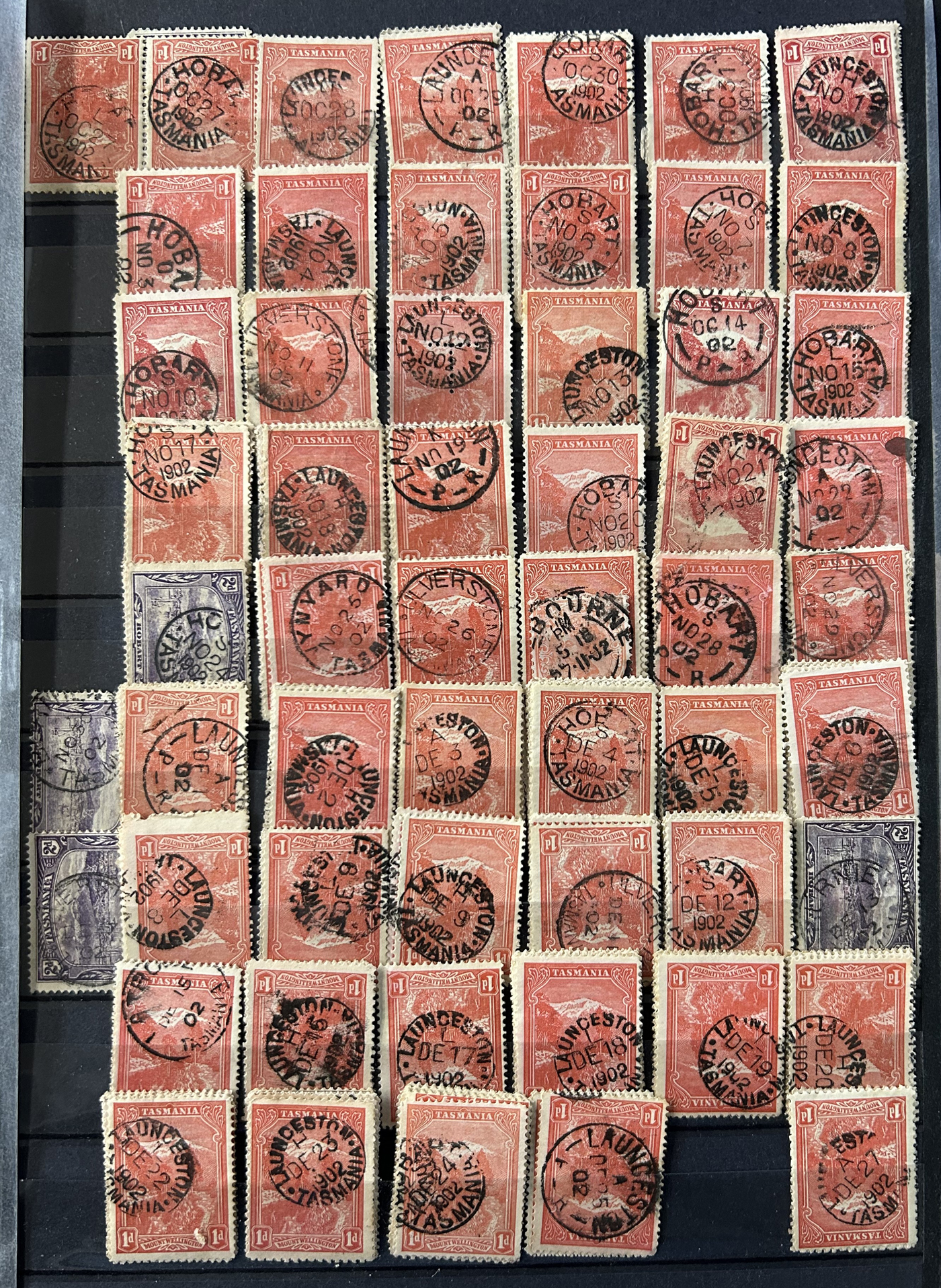1242 O Tasmania imageExtensive Lifetime Calendar Collection of Tasmanian Town Cancels, filling two stuffed stockbooks (94 pages) with stamps sorted chronologically by date, from March 21, 1896 to December 29, 1913. We estimate a total of well over 10,000 stamps (many specific days can have up to 10 stamps stacked on each other), all with fully readable dates and a wide variety of different town cancels. A perfect, and unique opportunity for town cancel collectors, as well as calendar collectors, as this is a true labour of love that took many decades to assemble. See our photos for a representative idea. (Scan 1) (Scan 2) (Scan 3) (Scan 4) (Scan 5) (Scan 6) (Scan 7) (Scan 8) (Scan 9) (All Scans)