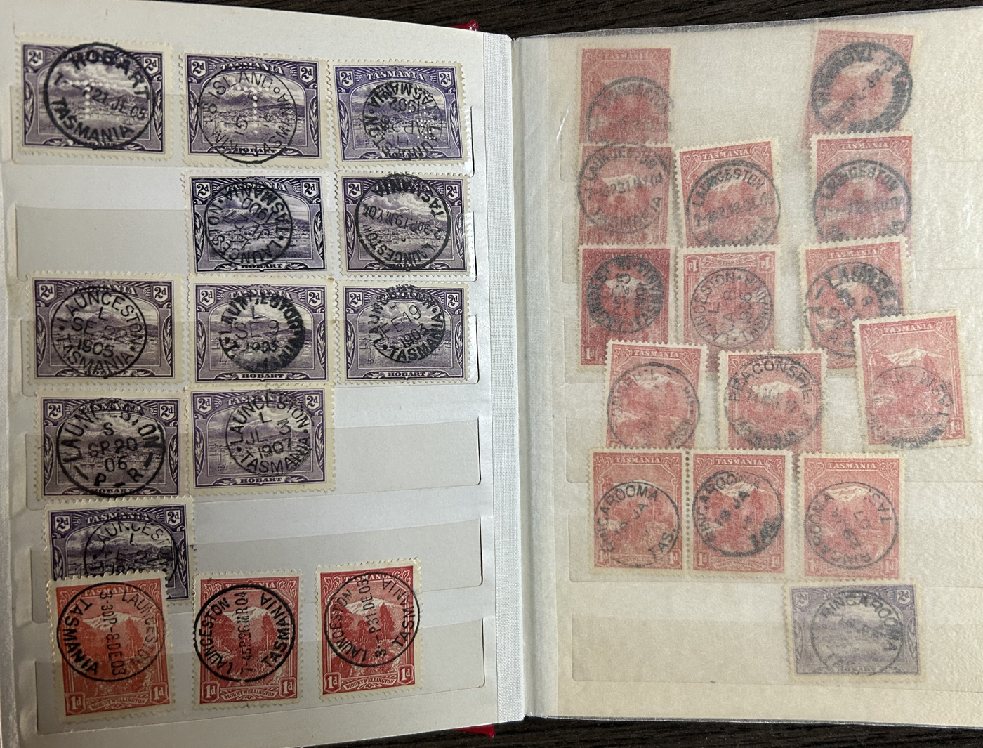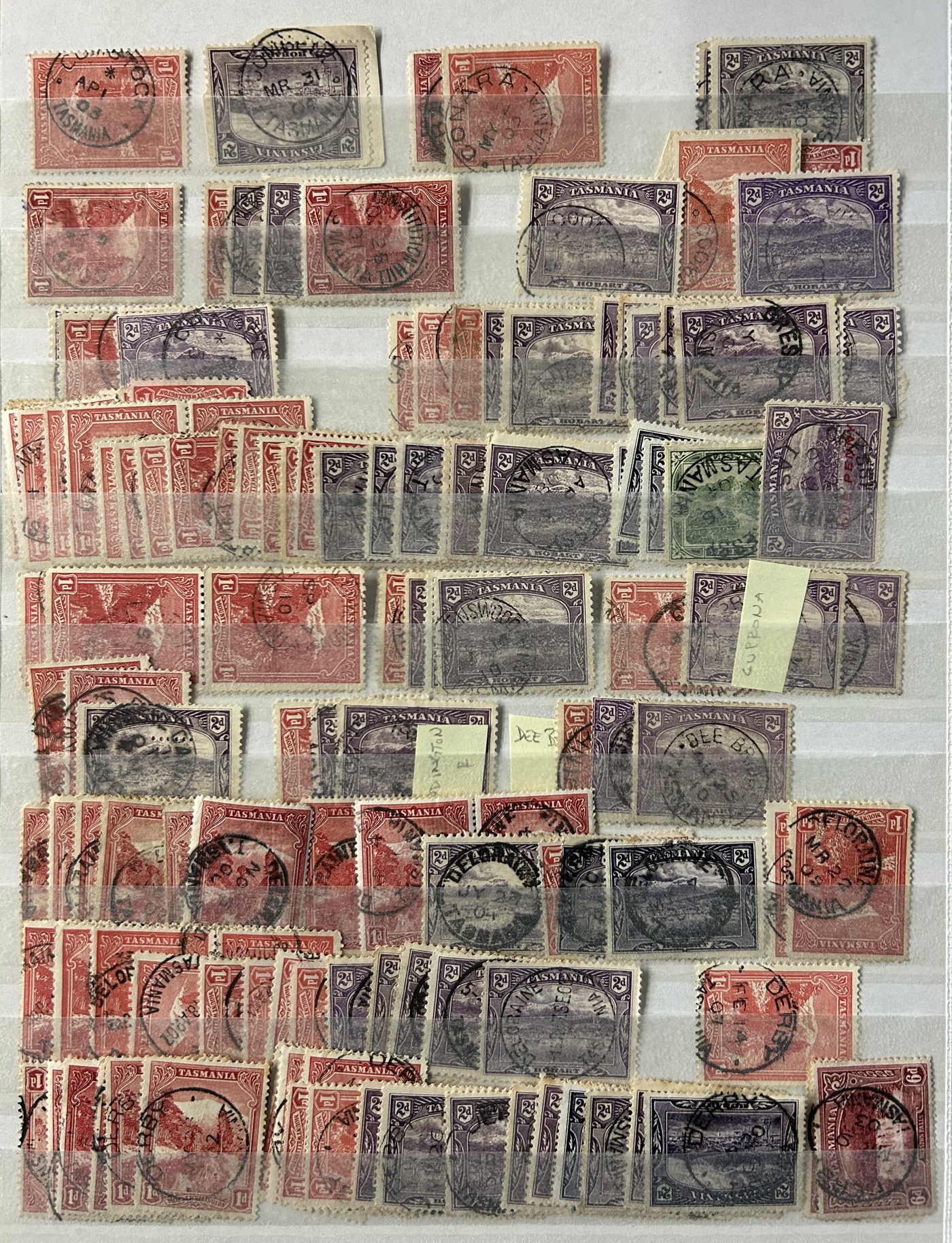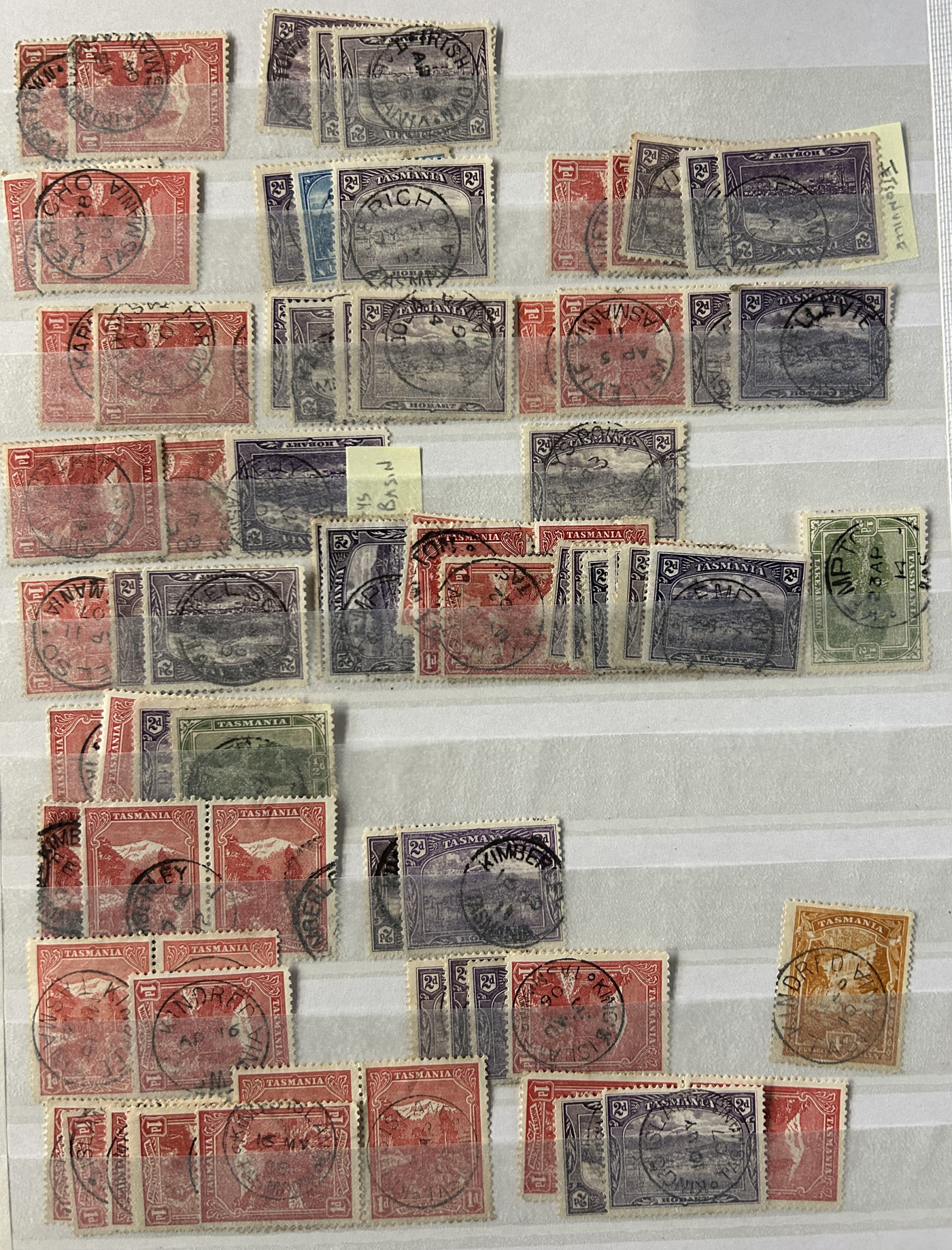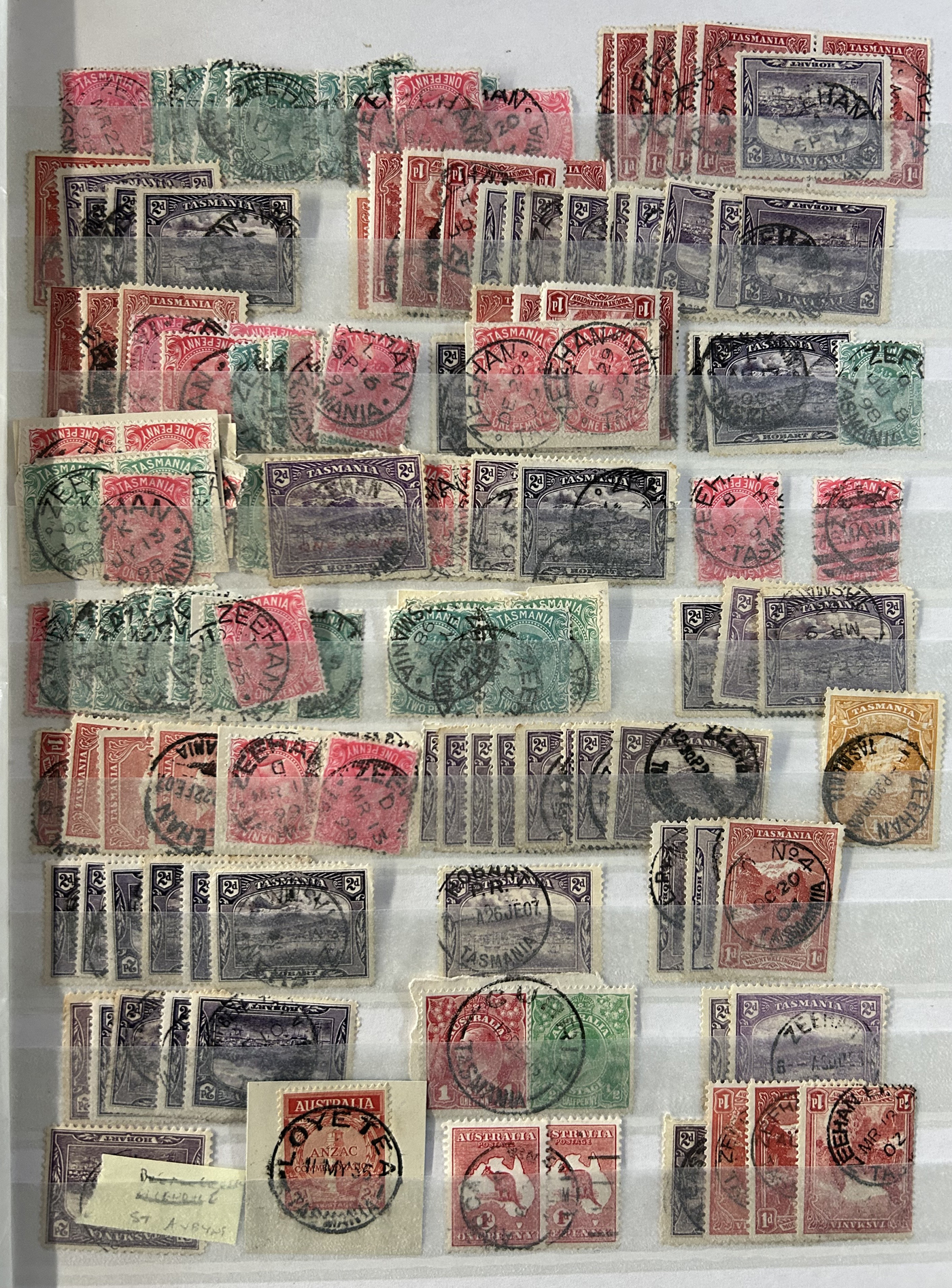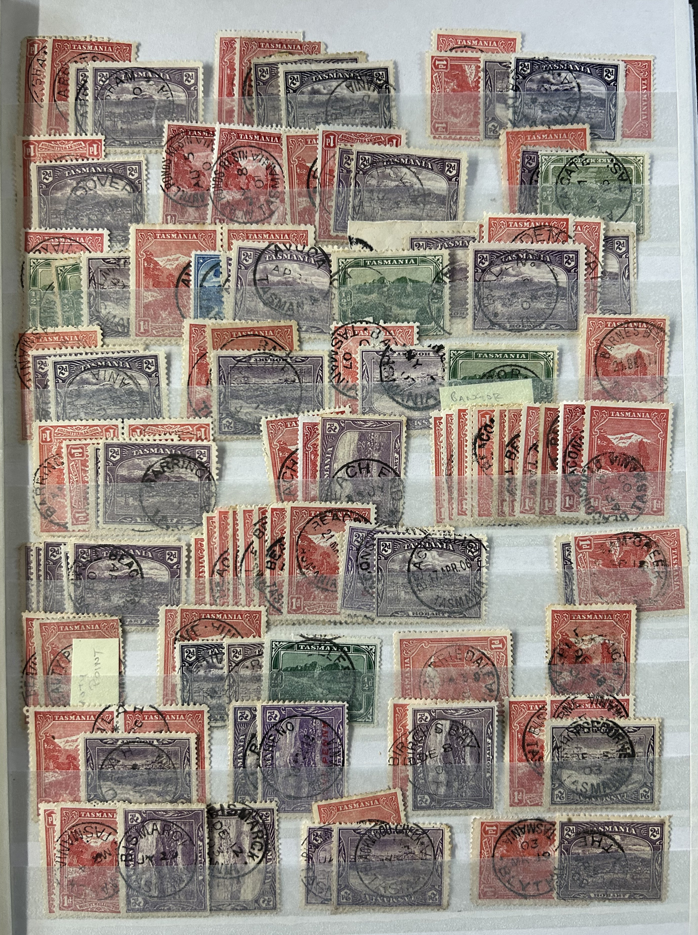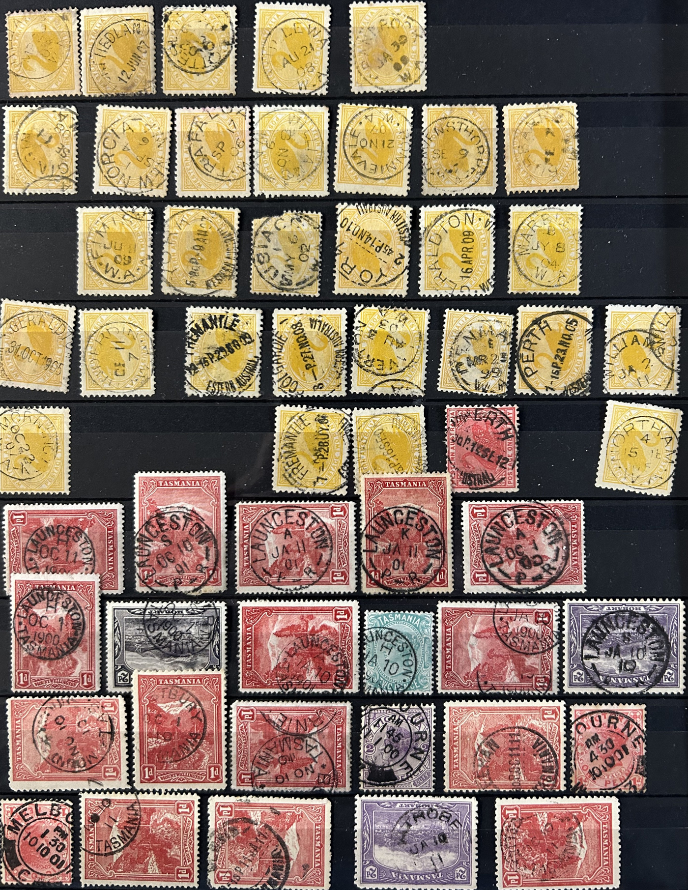 1242 O Tasmania imageExtensive Lifetime Calendar Collection of Tasmanian Town Cancels, filling two stuffed stockbooks (94 pages) with stamps sorted chronologically by date, from March 21, 1896 to December 29, 1913. We estimate a total of well over 10,000 stamps (many specific days can have up to 10 stamps stacked on each other), all with fully readable dates and a wide variety of different town cancels. A perfect, and unique opportunity for town cancel collectors, as well as calendar collectors, as this is a true labour of love that took many decades to assemble. See our photos for a representative idea. (Scan 1) (Scan 2) (Scan 3) (Scan 4) (Scan 5) (Scan 6) (Scan 7) (Scan 8) (Scan 9) (All Scans)