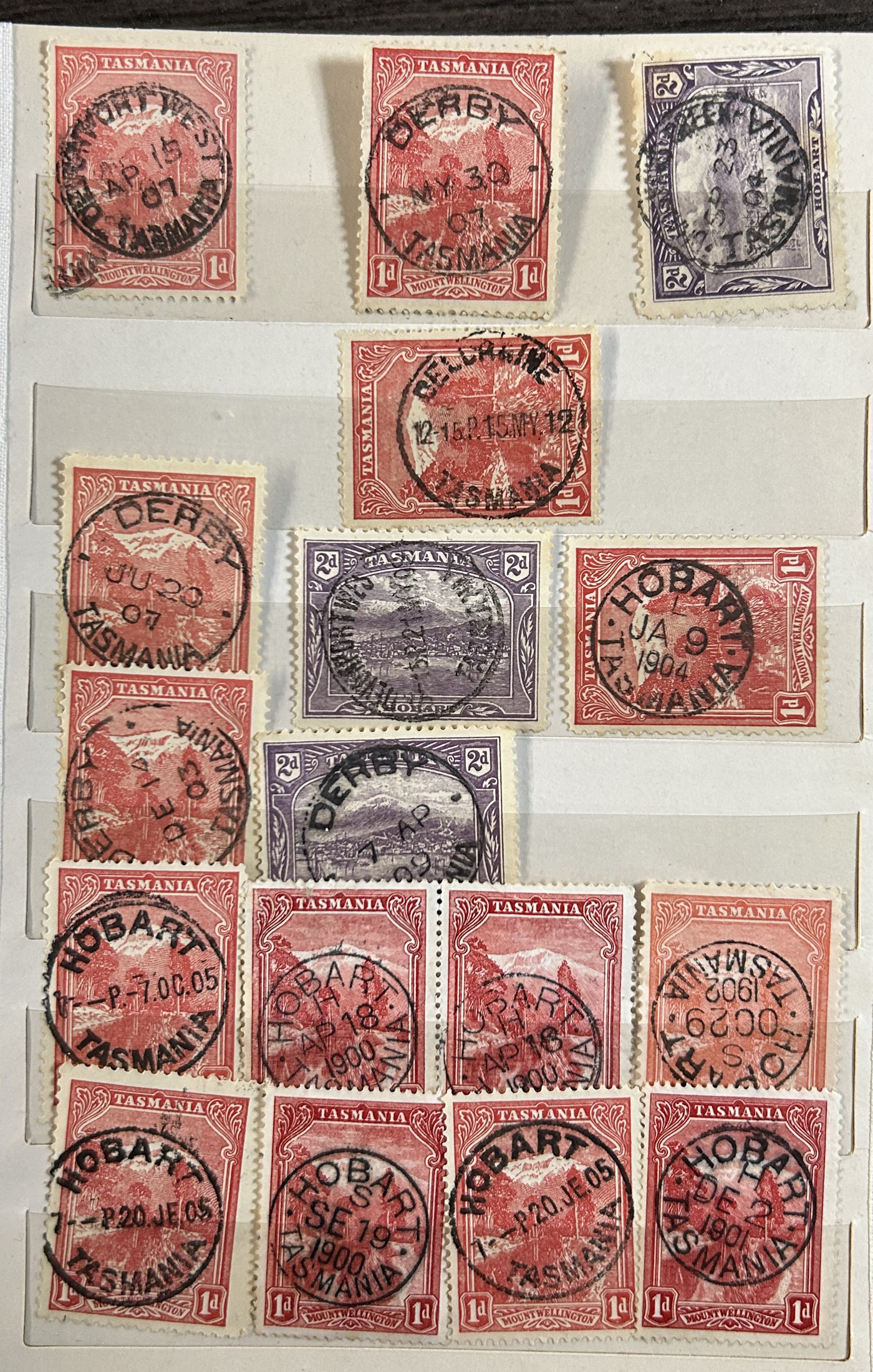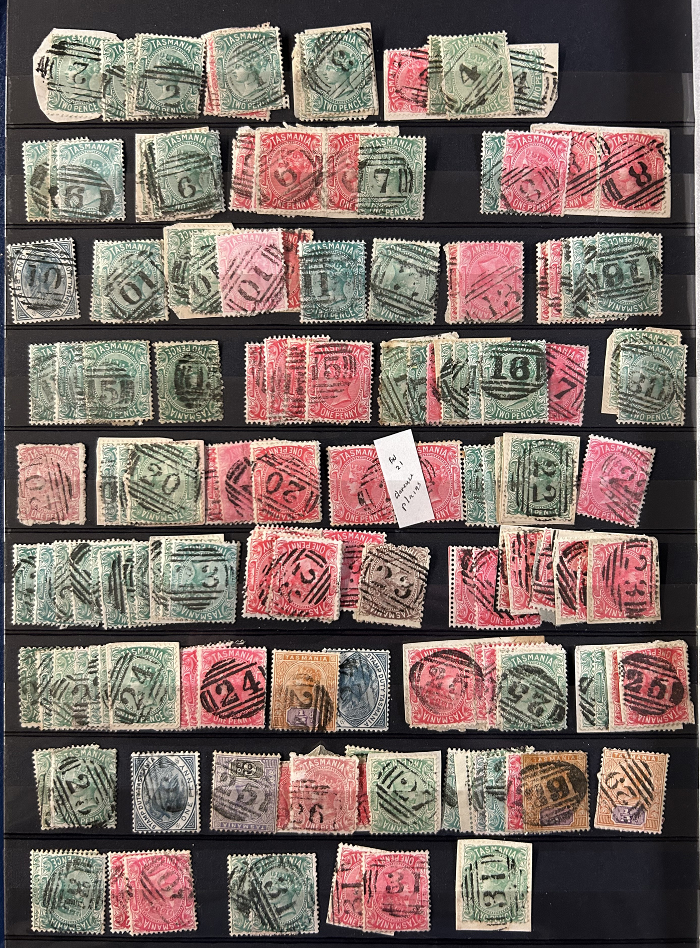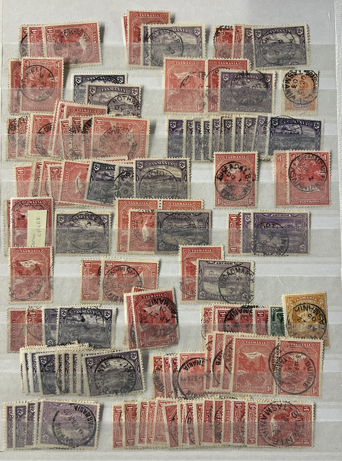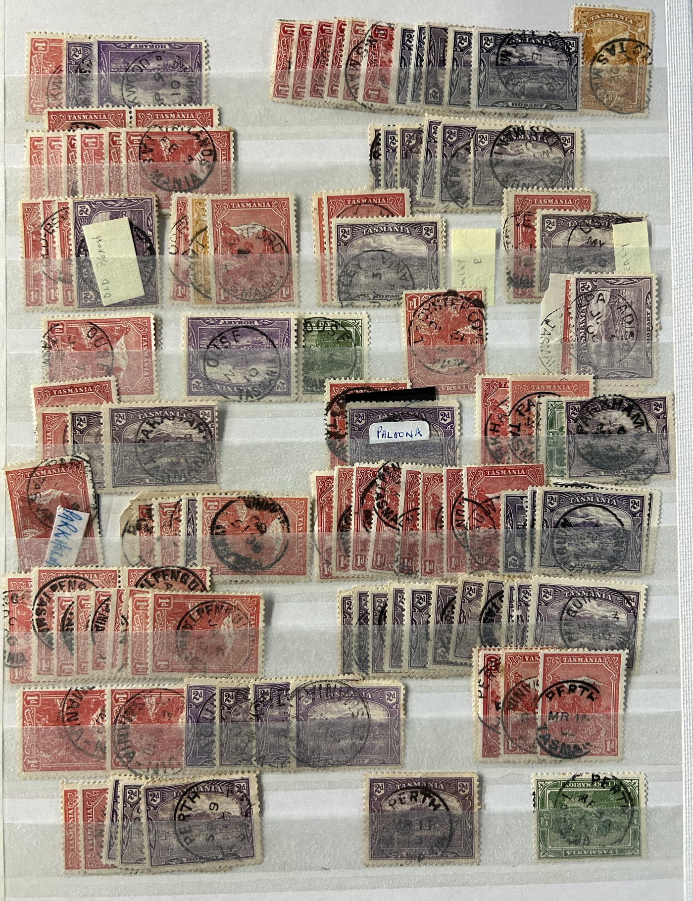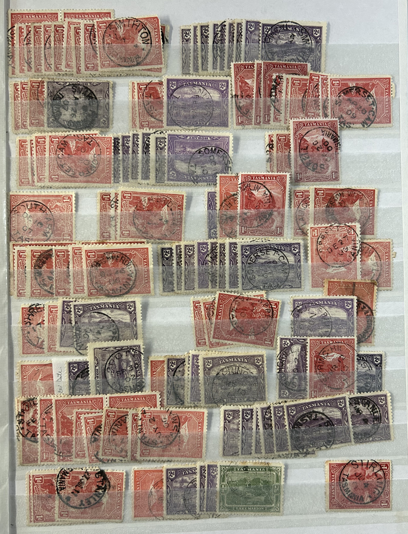 1242 O Tasmania imageExtensive Lifetime Calendar Collection of Tasmanian Town Cancels, filling two stuffed stockbooks (94 pages) with stamps sorted chronologically by date, from March 21, 1896 to December 29, 1913. We estimate a total of well over 10,000 stamps (many specific days can have up to 10 stamps stacked on each other), all with fully readable dates and a wide variety of different town cancels. A perfect, and unique opportunity for town cancel collectors, as well as calendar collectors, as this is a true labour of love that took many decades to assemble. See our photos for a representative idea. (Scan 1) (Scan 2) (Scan 3) (Scan 4) (Scan 5) (Scan 6) (Scan 7) (Scan 8) (Scan 9) (All Scans)