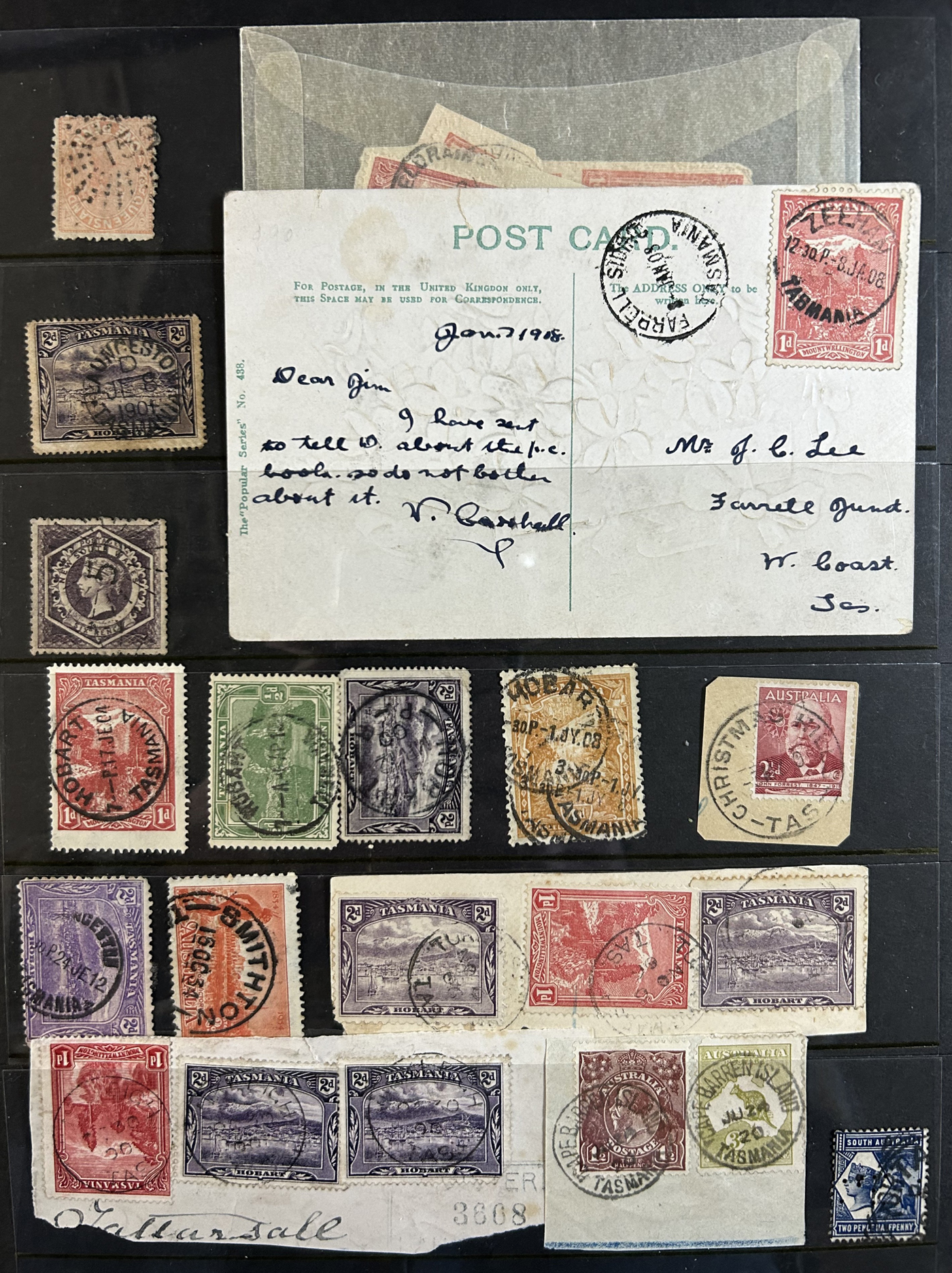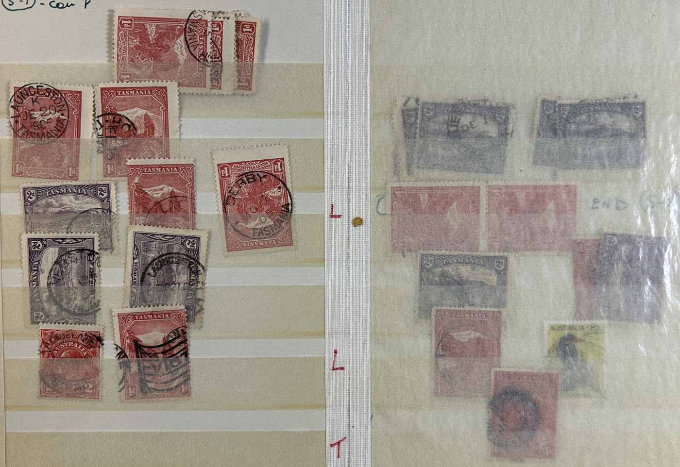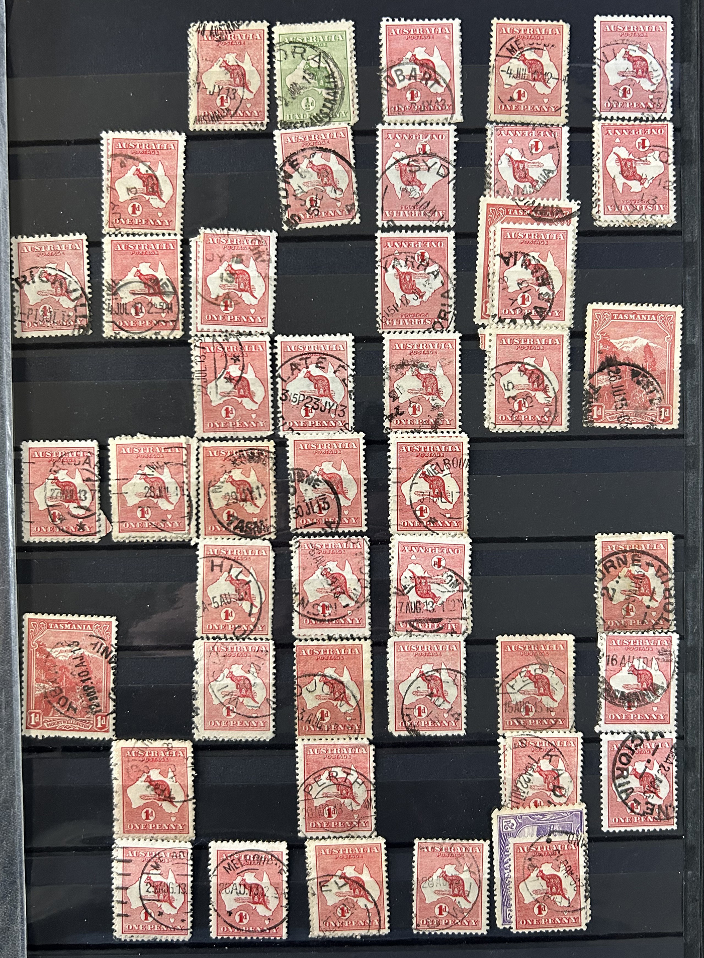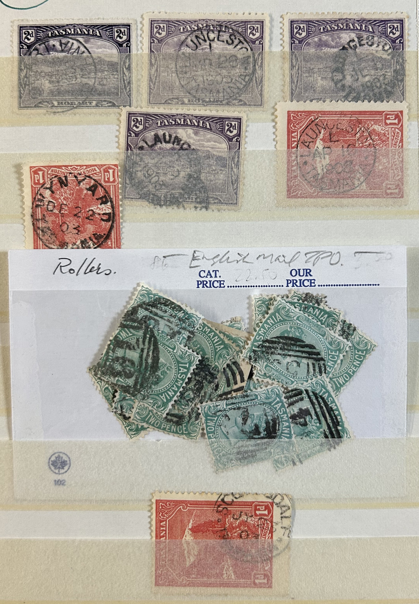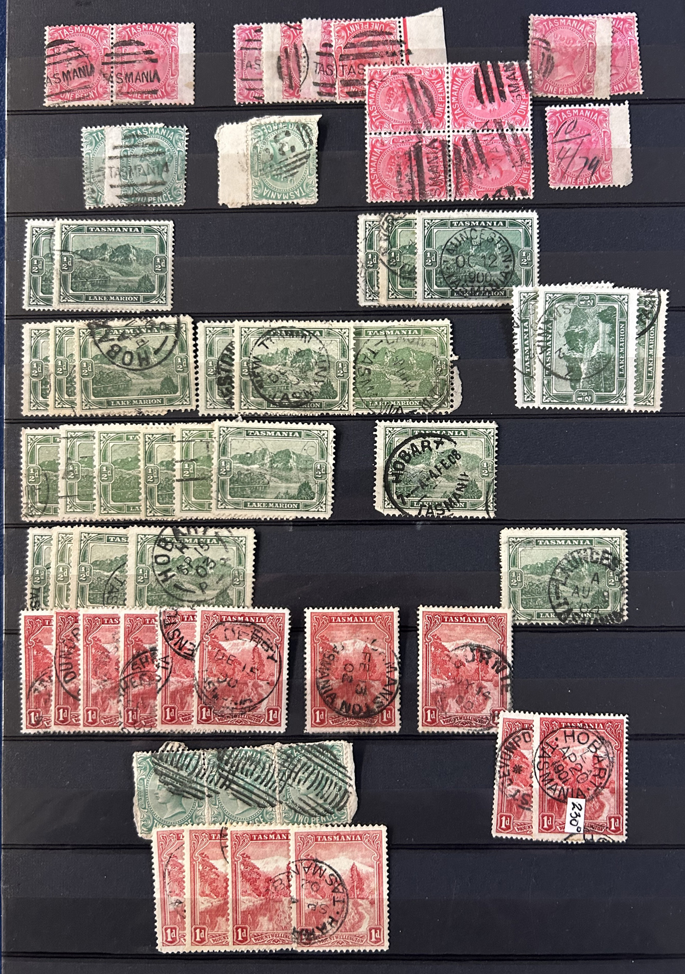 1242 O Tasmania imageExtensive Lifetime Calendar Collection of Tasmanian Town Cancels, filling two stuffed stockbooks (94 pages) with stamps sorted chronologically by date, from March 21, 1896 to December 29, 1913. We estimate a total of well over 10,000 stamps (many specific days can have up to 10 stamps stacked on each other), all with fully readable dates and a wide variety of different town cancels. A perfect, and unique opportunity for town cancel collectors, as well as calendar collectors, as this is a true labour of love that took many decades to assemble. See our photos for a representative idea. (Scan 1) (Scan 2) (Scan 3) (Scan 4) (Scan 5) (Scan 6) (Scan 7) (Scan 8) (Scan 9) (All Scans)