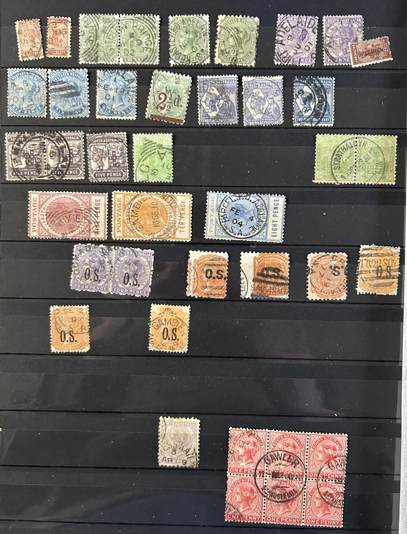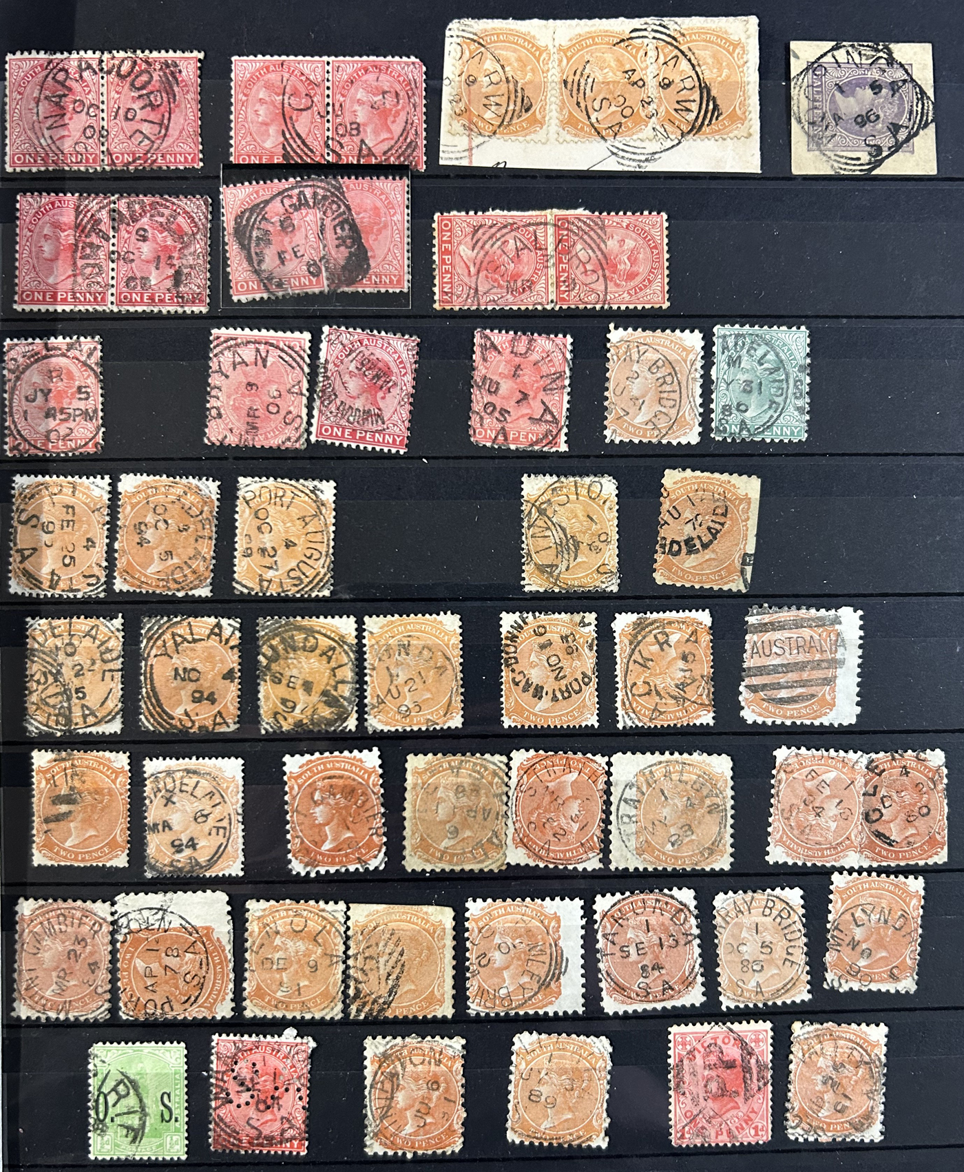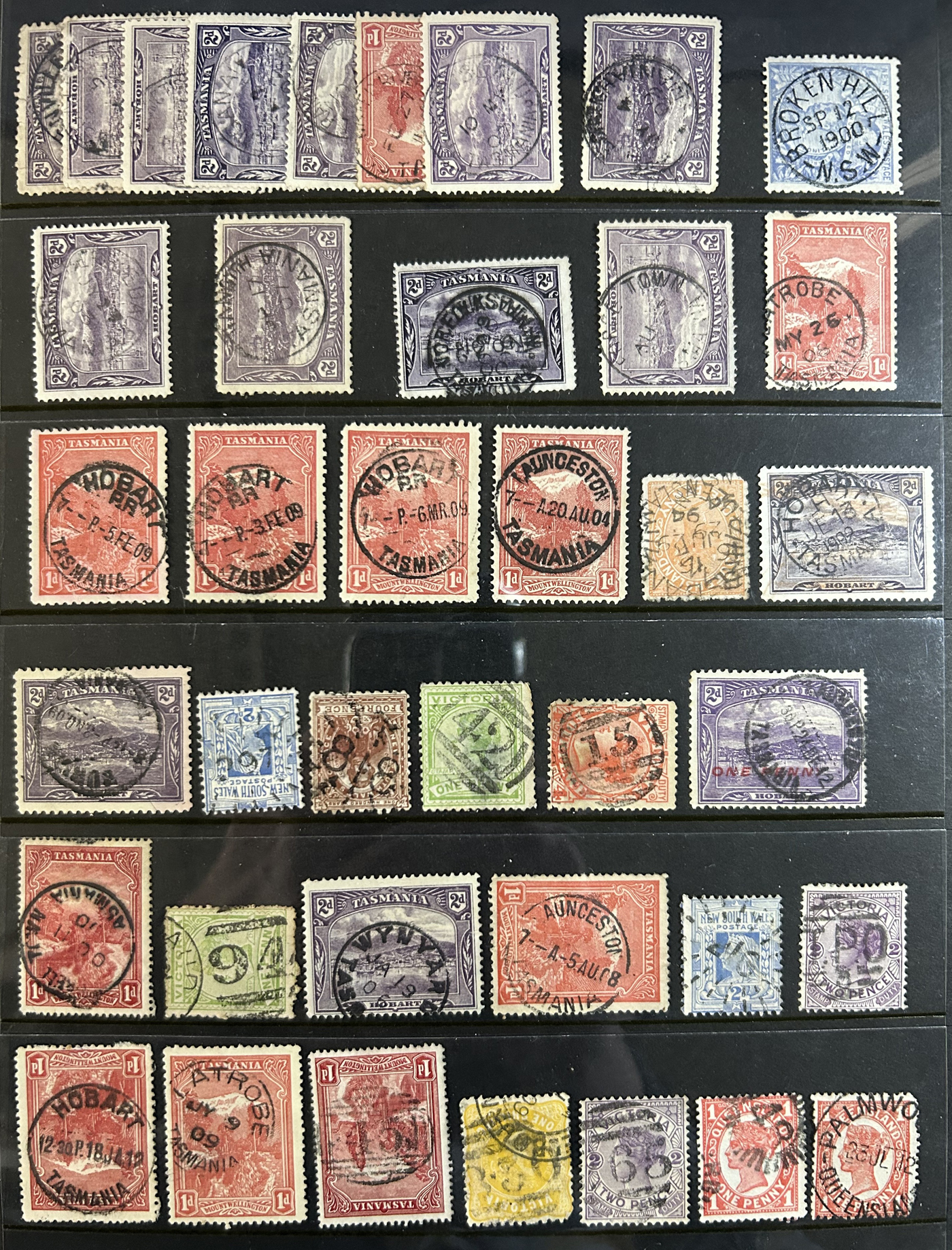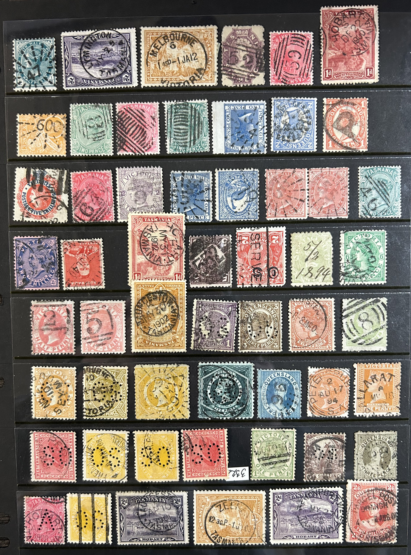 1256 O   imageSmall Collection of Interesting Town Postmarks on Australian States Stamps, filling two medium stockbooks and 9 stock sheets with roughly 750 stamps, each with either town cancels (mostly choice well centered towns) or numeral cancels. A useful lot for the enthusiast, we only show the highlights of the lot online. (Scan 1) (Scan 2) (Scan 3) (Scan 4) (Scan 5) (Scan 6) (Scan 7) (Scan 8) (Scan 9) (Scan 10) (Scan 11) (Scan 12) (Scan 13) (All Scans)