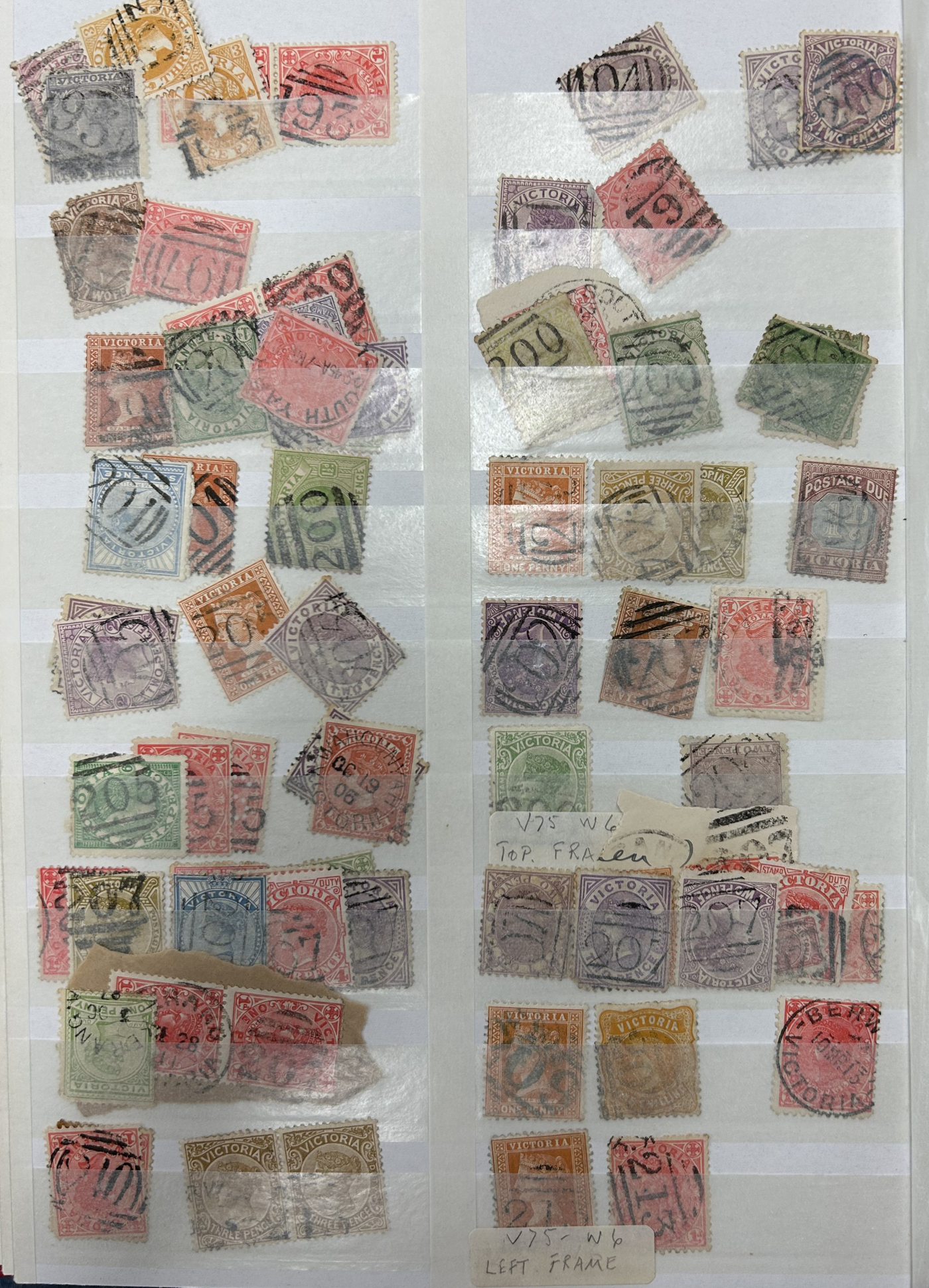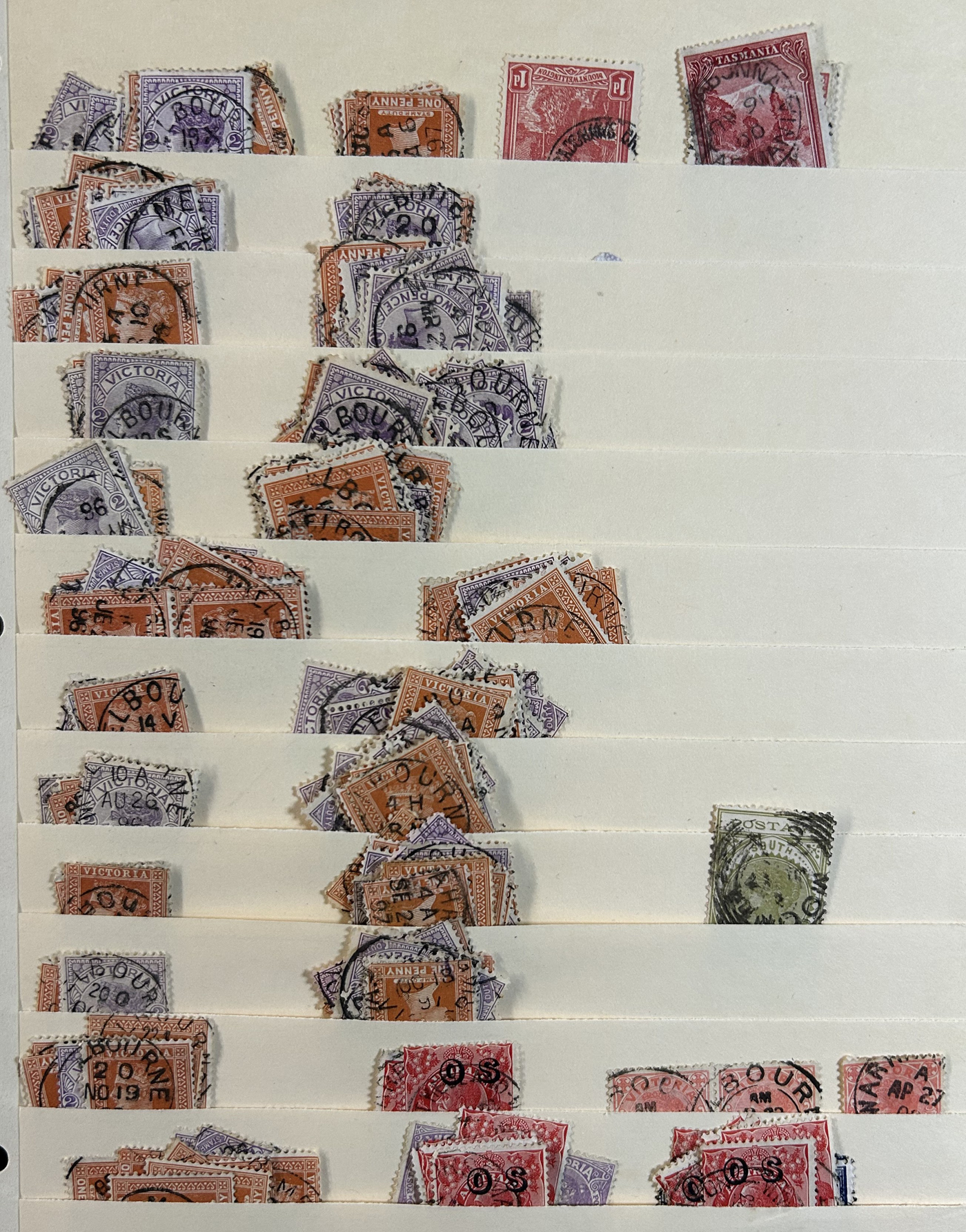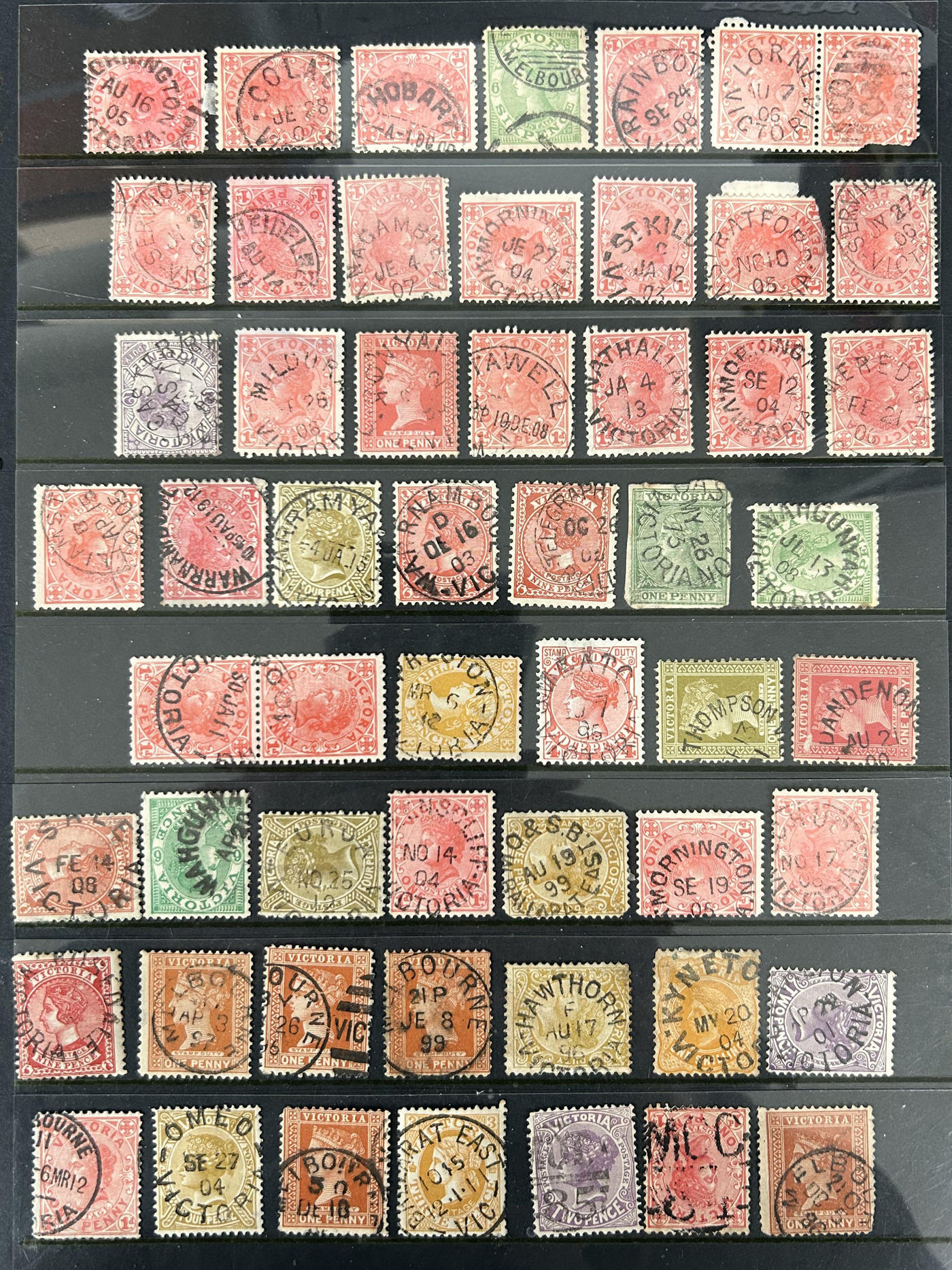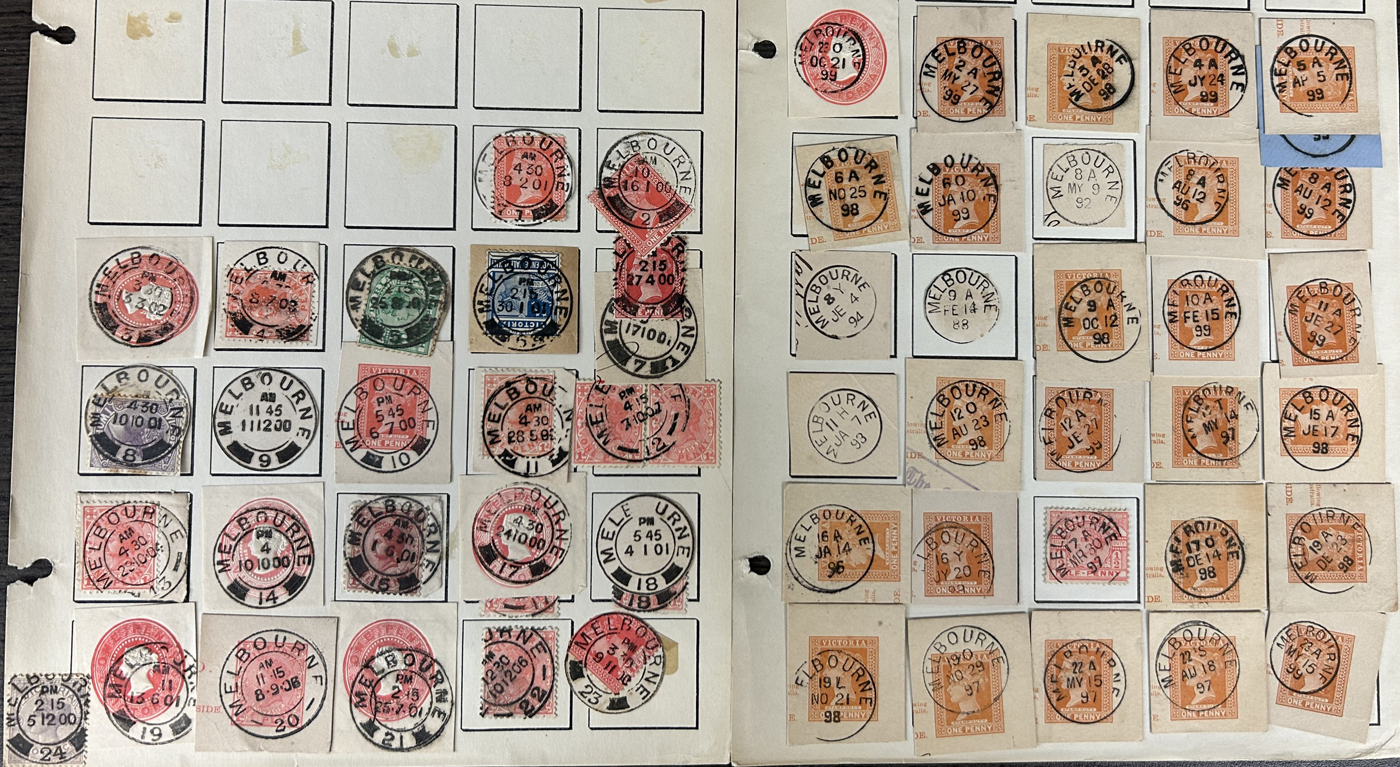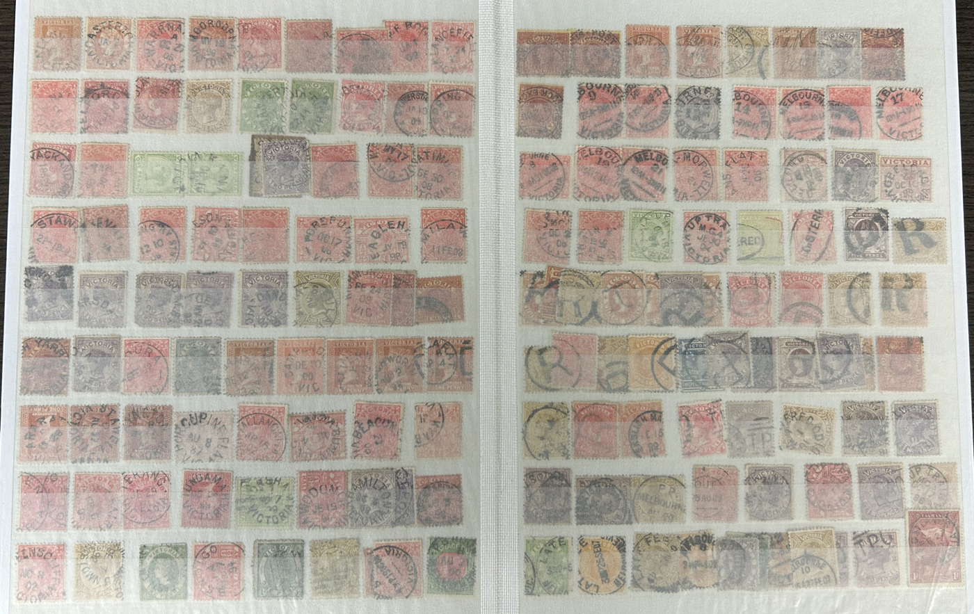 1246 O Victoria imageLarge Collection / Accumulation of Victoria Town Postmarks on Victoria Stamps, filling 6 black stock sheets, 4 small stock cards, 11 stockbook pages, 2 album pages, plus glassines and envelopes full. The lot contains specialized Melbourne c.d.s. studies as well as hundreds of different town postmarks (many small towns) on many different stamp issues, including higher catalogue ones. One glassine contains only Tasmania postmarks on Victoria stamps. Probably a few thousand stamps in all, with a good proportion being socked on the nose strikes. See our pictures for a sampling. (Scan 1) (Scan 2) (Scan 3) (Scan 4) (Scan 5) (Scan 6) (Scan 7) (Scan 8) (Scan 9) (Scan 10) (All Scans)