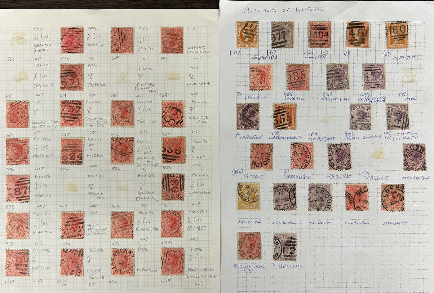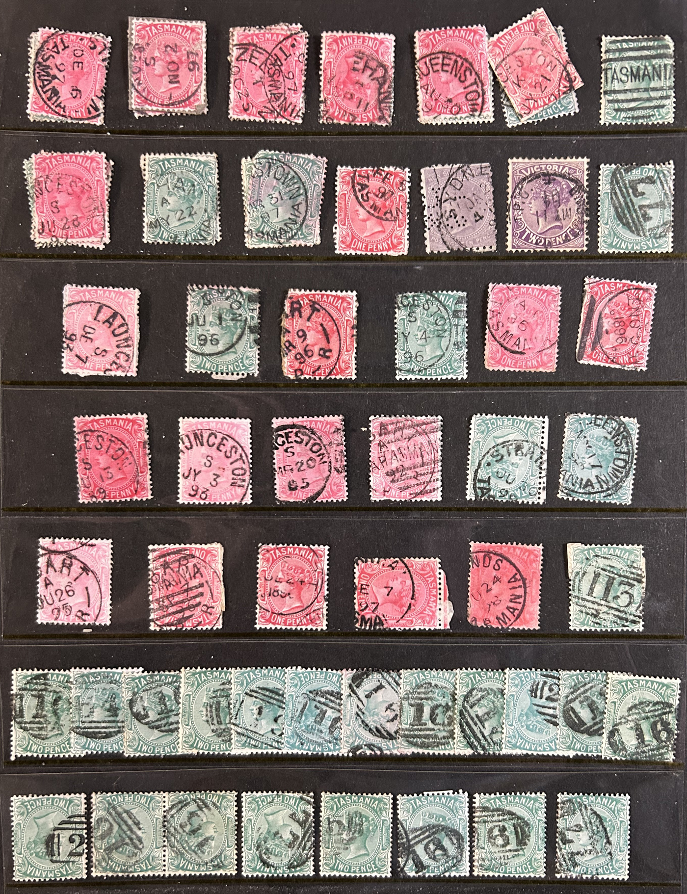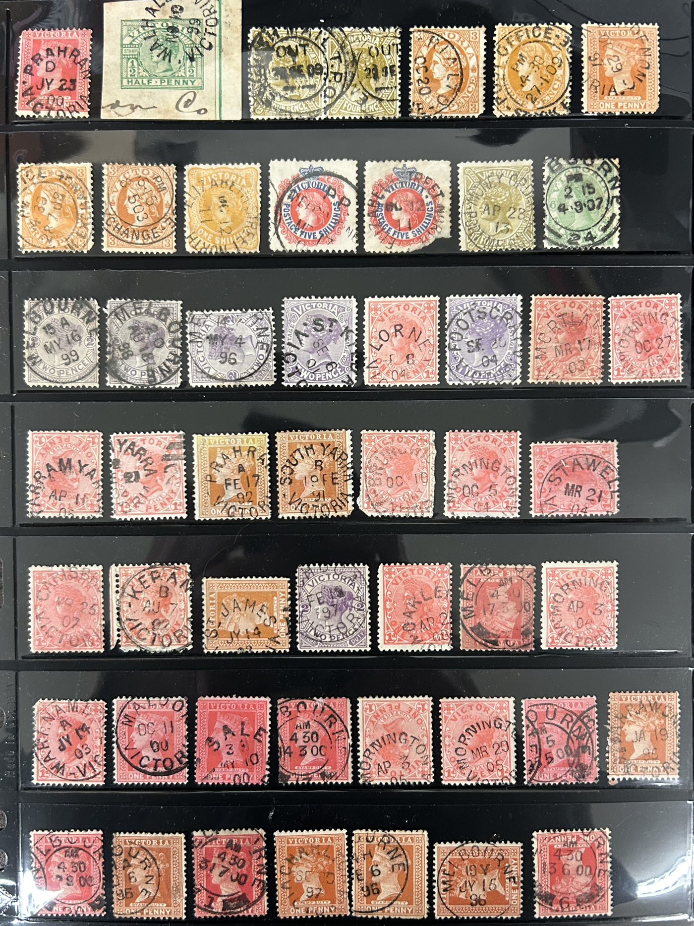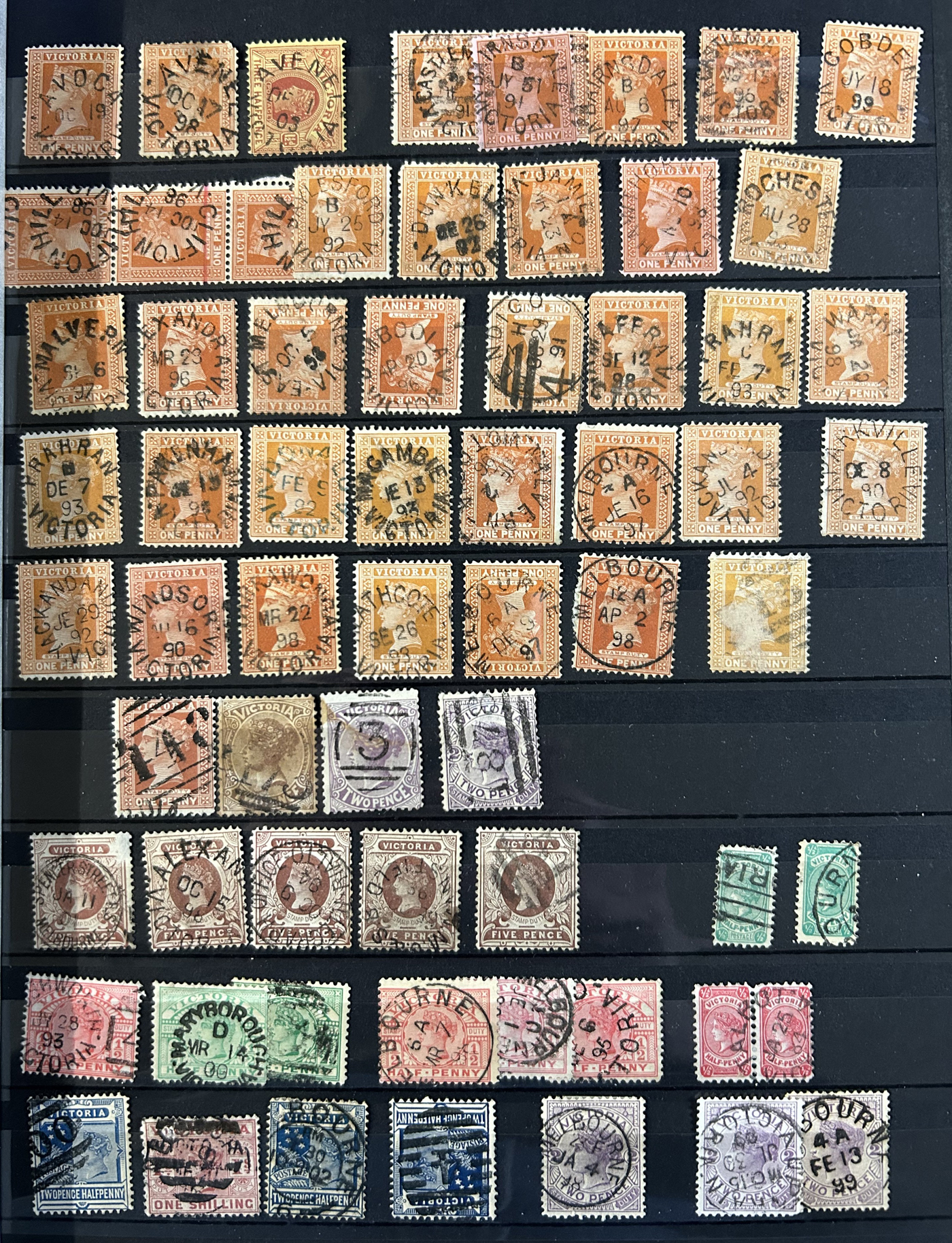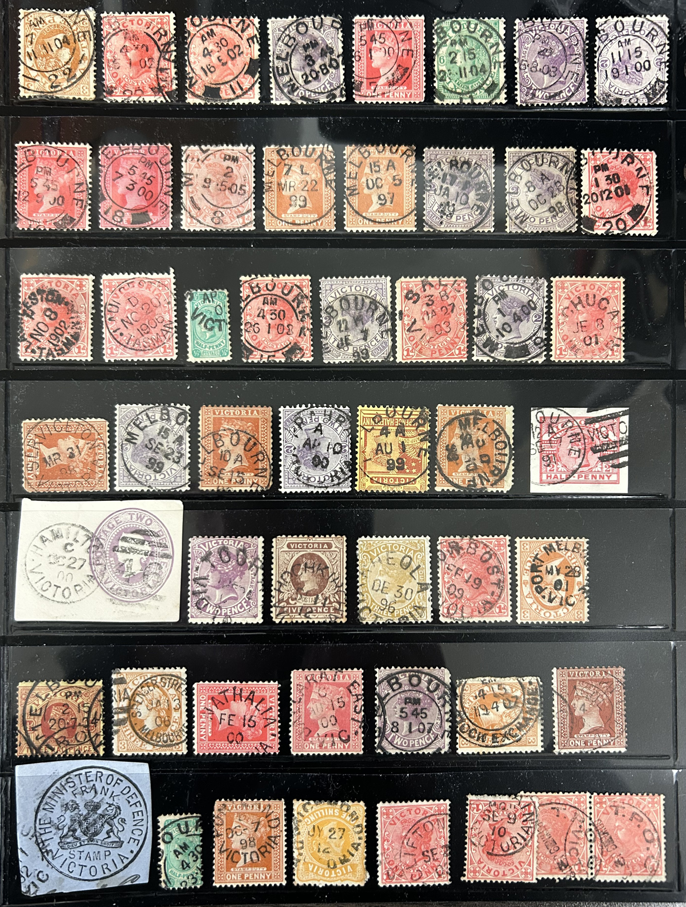 1246 O Victoria imageLarge Collection / Accumulation of Victoria Town Postmarks on Victoria Stamps, filling 6 black stock sheets, 4 small stock cards, 11 stockbook pages, 2 album pages, plus glassines and envelopes full. The lot contains specialized Melbourne c.d.s. studies as well as hundreds of different town postmarks (many small towns) on many different stamp issues, including higher catalogue ones. One glassine contains only Tasmania postmarks on Victoria stamps. Probably a few thousand stamps in all, with a good proportion being socked on the nose strikes. See our pictures for a sampling. (Scan 1) (Scan 2) (Scan 3) (Scan 4) (Scan 5) (Scan 6) (Scan 7) (Scan 8) (Scan 9) (Scan 10) (All Scans)